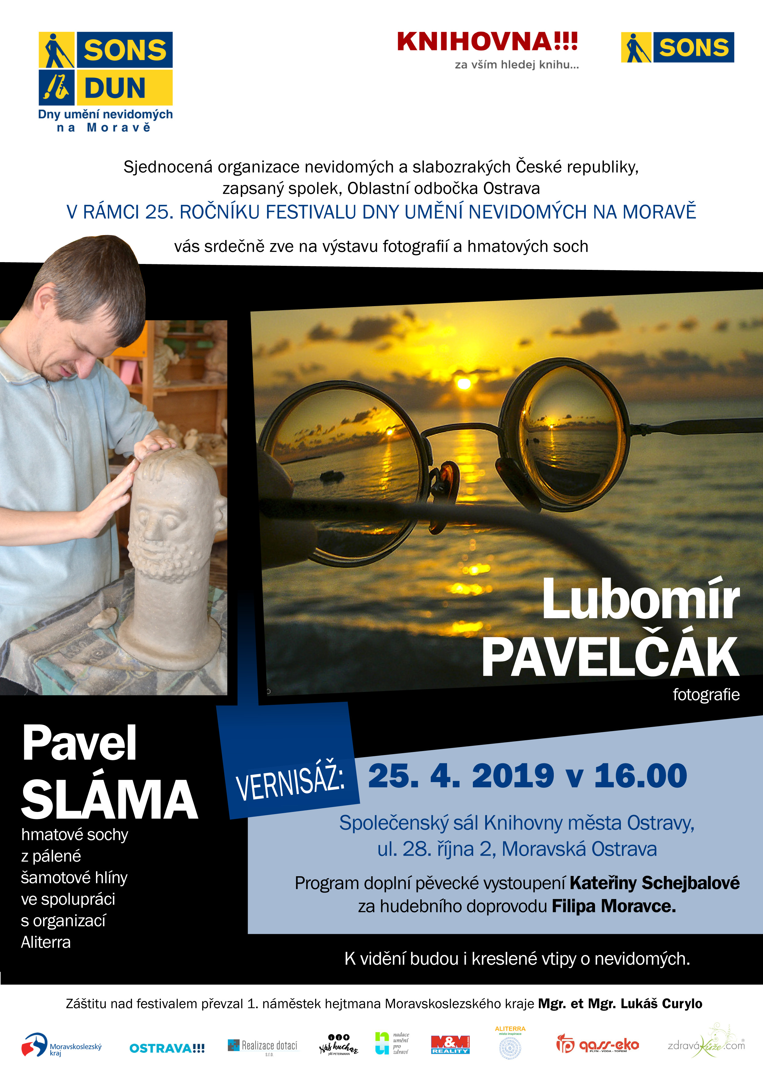 Vernisáž fotografií Lubomíra Pavelčáka a hmatových soch Pavla Slámy doplní pěvecké vystoupení Kateřiny Schejbalové za hudebního doprovodu Filipa Moravce. K vidění budou i kreslené vtipy o nevidomých.