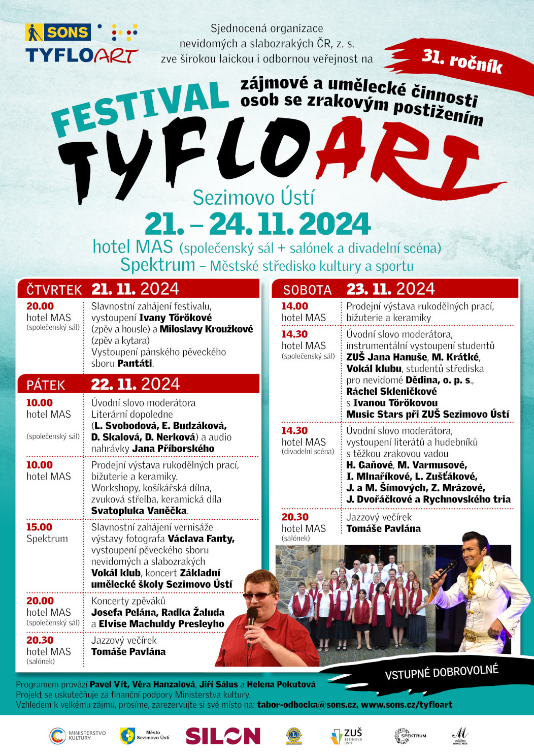 Sjednocená organizace nevidomých a slabozrakých České republiky, zapsaný spolek pořádá v letošním roce ve dnech 21. - 24. 11. 2024 již 31. ročník festivalu zájmové umělecké tvorby amatérských zrakově postižených umělců Tyfloart 2024, který se bude konat v Sezimově Ústí v hotelu MAS a nedalekém kině Spektrum.