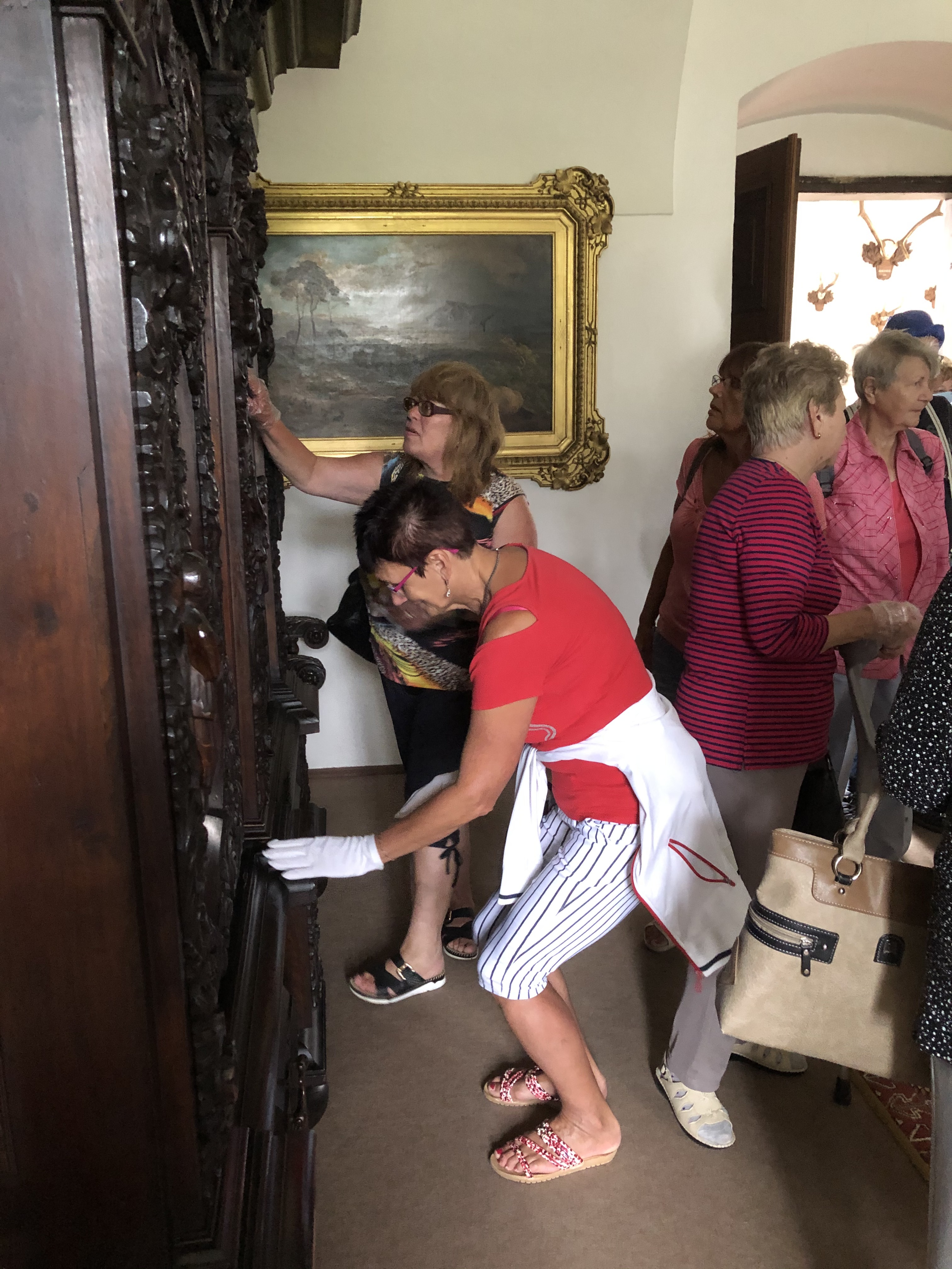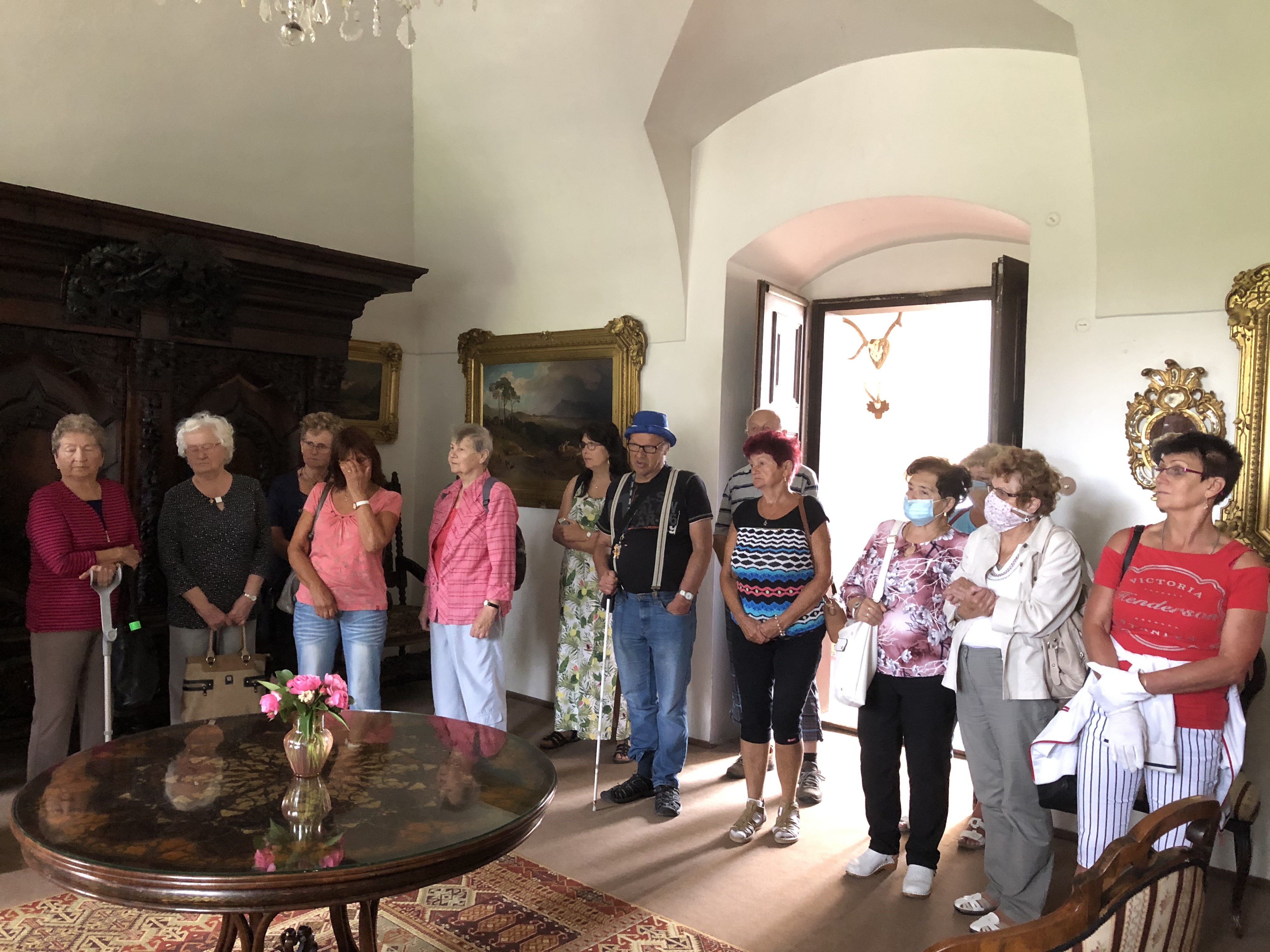 Poté se skupina přesunula do Státního zámku Vizovice. Zde jim průvodkyně a zároveň členka OO Vsetín, Jana Makyčová, zaujatě, poutavě a podrobně vyprávěla o historii a současnosti zámku. V průběhu výkladu si nevidomí mohli přes tenké rukavice hapticky prohlédnout vyřezávaný a intarzovaný nábytek a také jim průvodkyně podávala do dlaní některé exponáty. Byl to například sirník, což je dobová pomůcka na zapalování svící, nádoba na chlazení sklenic na alkoholické nápoje a další.