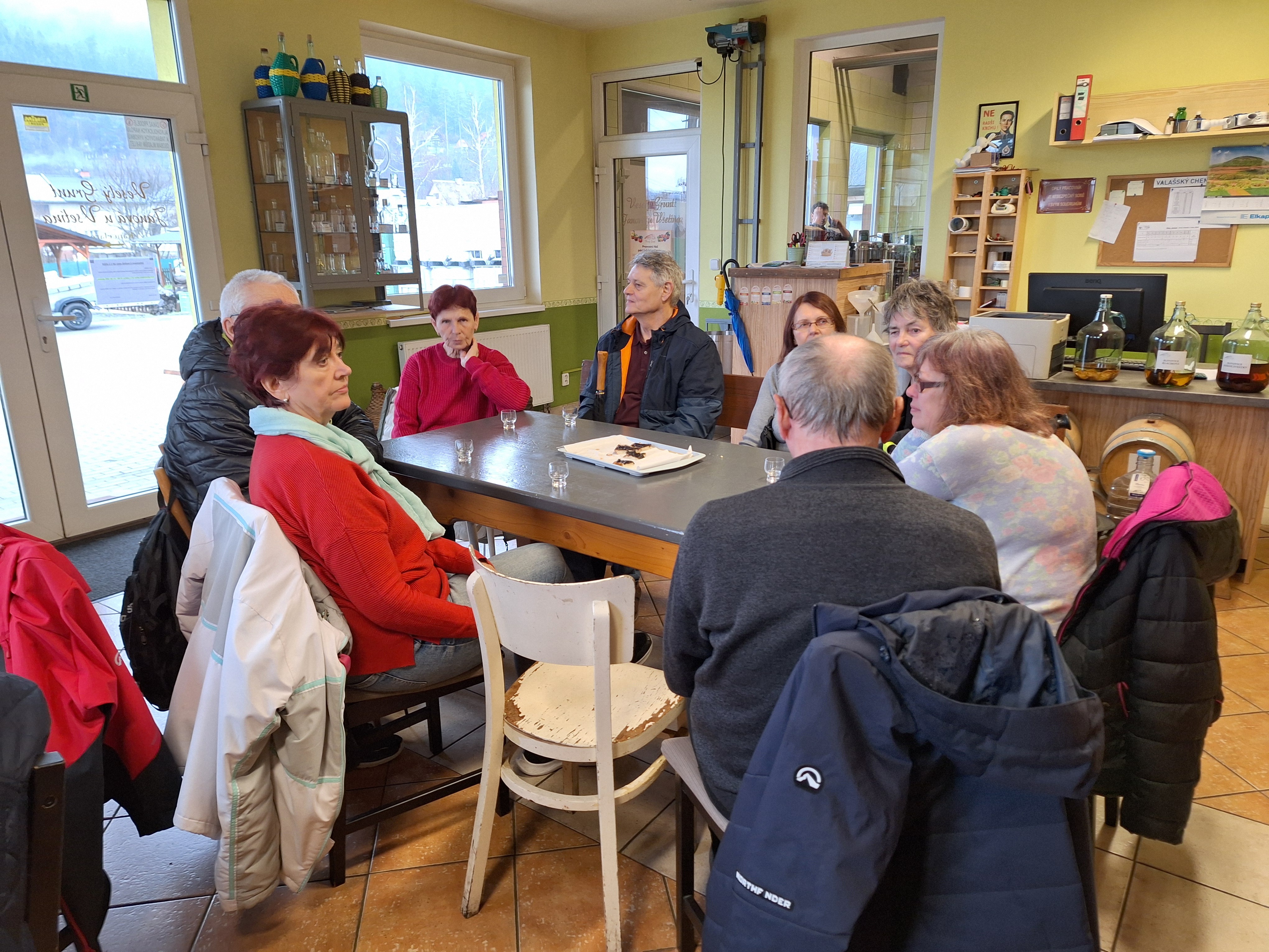 Prší a prší, avšak ani déšť nezabránil členům a uživatelům služeb navštívit zajímavé místo na Valašsku – Veselý Grunt v Janové u Vsetína. Část účastníků i přes mokré počasí dorazila na místo pěšky, druhá část účastníků se přesunula autobusem a společně jsme tak zahájili procvičování chuťových a čichových vjemů v netradičním prostředí. Přednáška o rozdílu mezi pěstitelskou pálenicí a ovocným lihovarem, vaření švestkových či višňových povidel o vhodnosti různých ovocných plodů k pálení doplněná o ochutnávku místních výrobků zcela pohltila všechny přítomné. Dotaz střídal dotaz a dvě hodinky utekly jako voda. Procházka kolem bublajících kotlů s povidly a nerezových tanků s pálenkou doplněná praktickými zkušenostmi o zpracování ovoce inspirovala mnohé z nás k nákupu těchto produktů v místním obchůdku. Aktivitu jsme doplnili obědem v místní restauraci a opět v dešti, tentokrát všichni autobusem, jsme se přemístili zpět na Vsetín.
