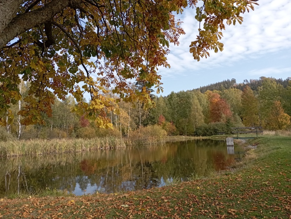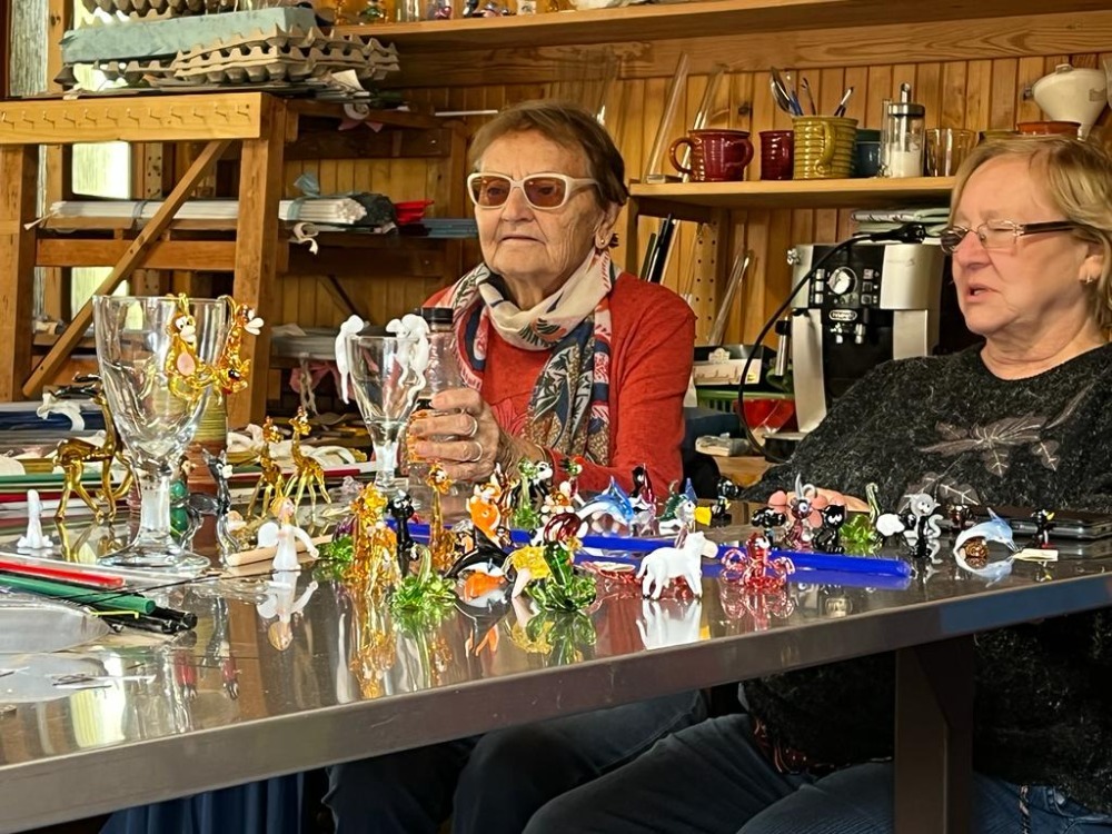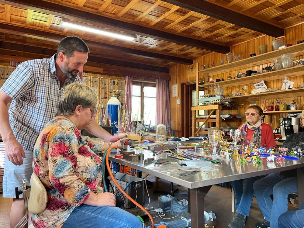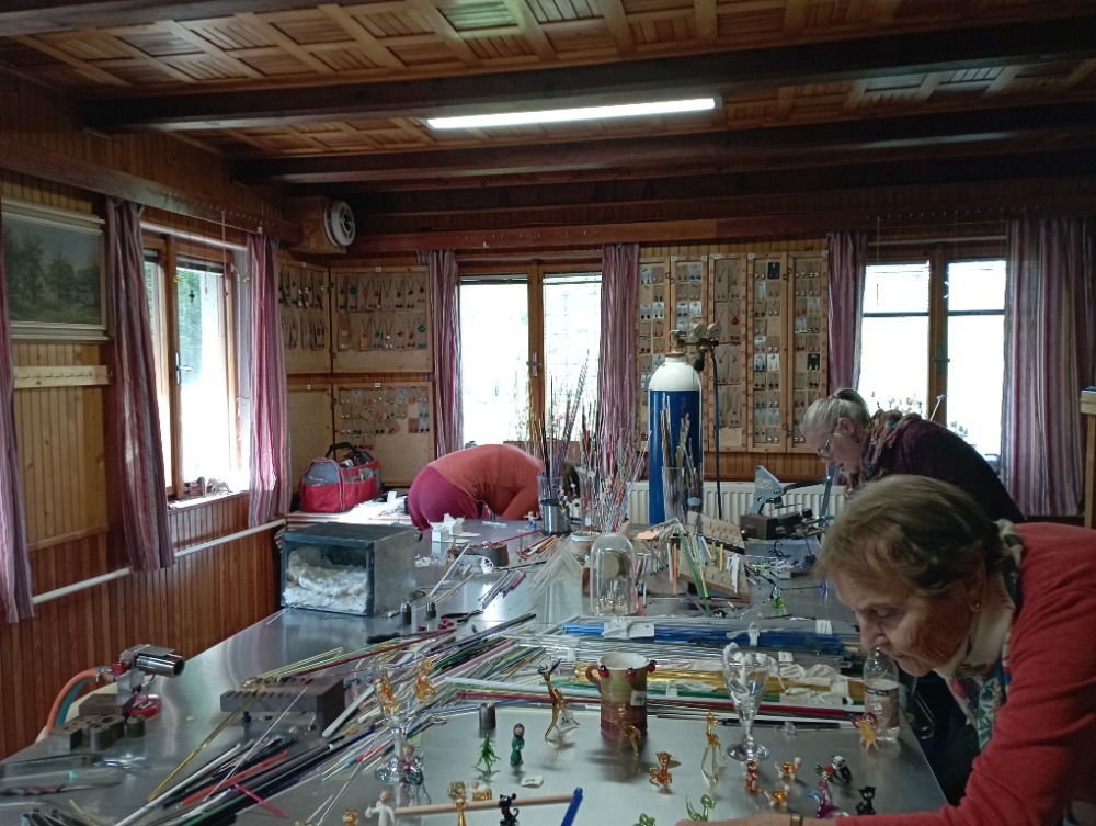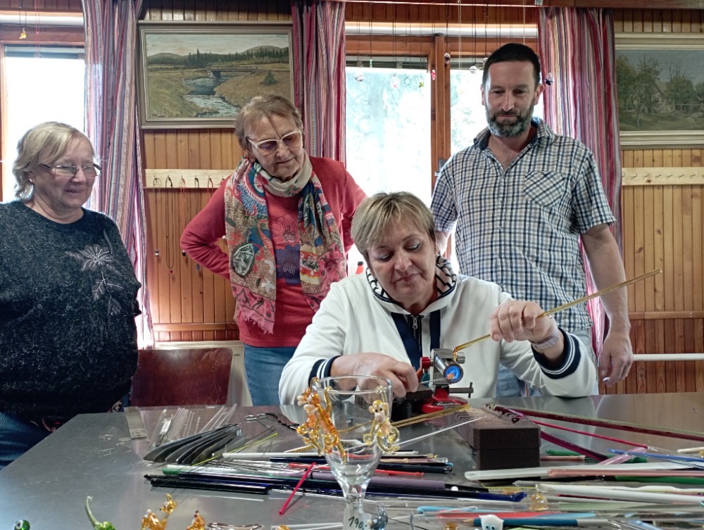 Vydaly jsme se procházkou z Lučan na Smržovku, kde jsme v obci Záhoří navštívily sklářskou dílnu. Milý pan majitel nám ukázal krásné výrobky - skleněné figurky, přívěšky, naušnice a originální autorské šperky, které vznikají metodou tavení skla a následného vinutí, jde o výhradně ruční zpracování. Jedná se již o třetí generací sklářů. Dále jsme navštívily výstavní síň zámečku ve Smržovce, kde se nám velmi líbila výstava obrazů naší členky Blanky Krausové.