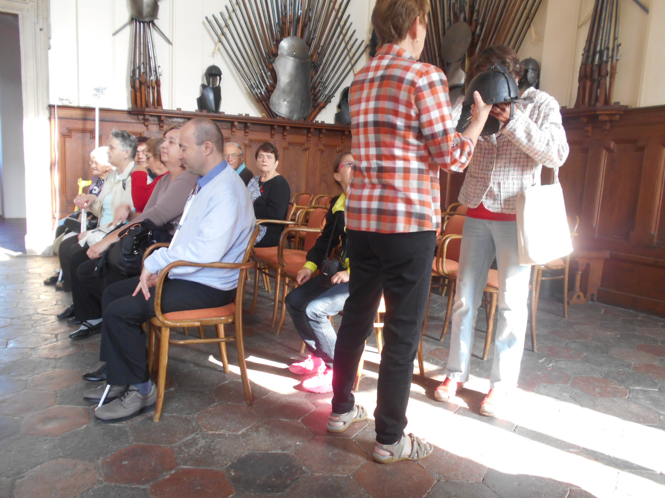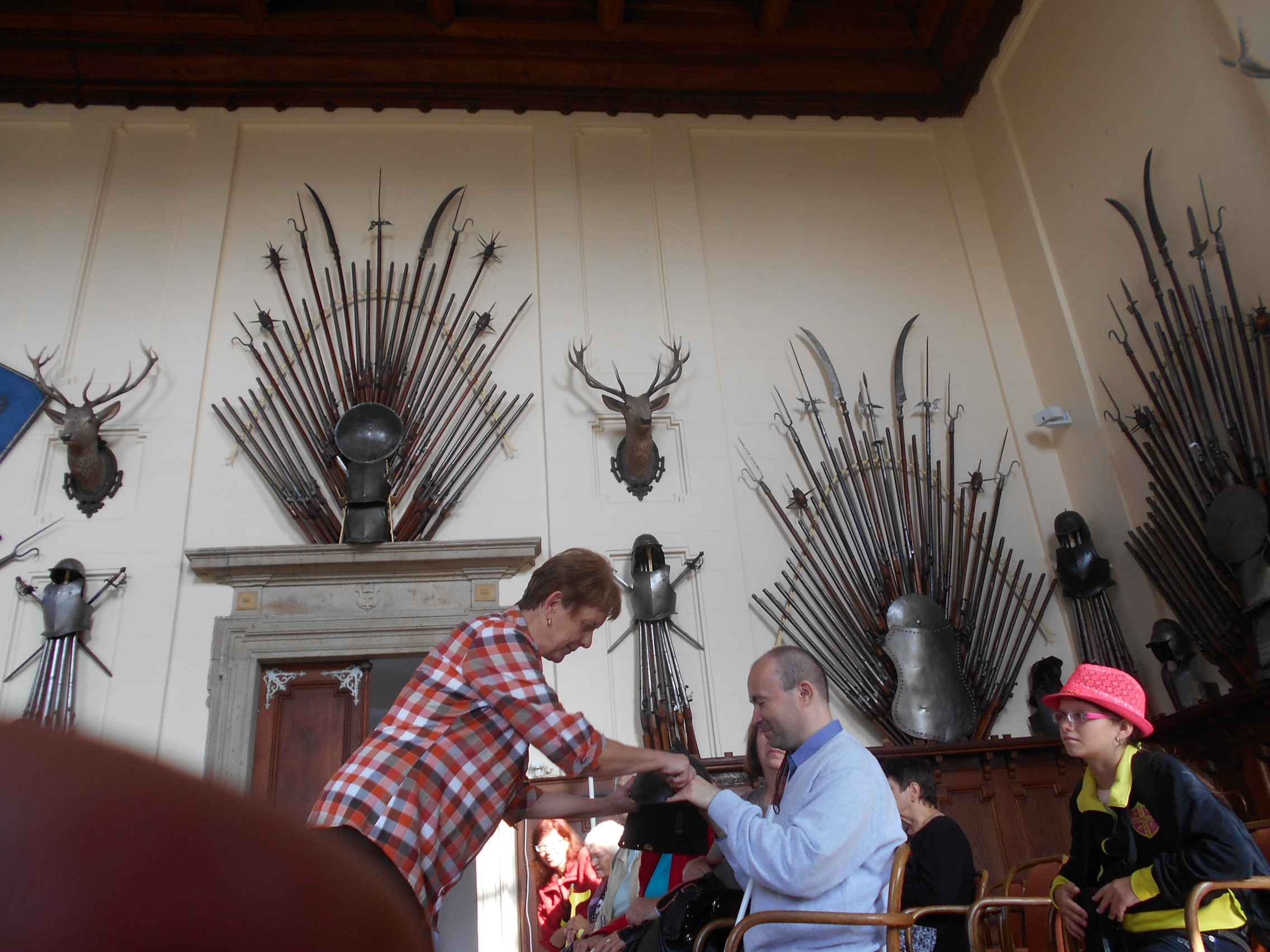 Tentokrát nám počasí opravdu přálo a cesta autobusem z Kroměříže do Chropyně trvala jen chvíli. Na zámku jsme se přivítali s naší milou průvodkyní paní Matouškovou, která nás nejprve krátce seznámila s jeho historií. V Rytířském sále, vyzdobeném kazetovým stropem s mnoha erby Fürstenbergů a dalších spřízněných rodů a s početnou sbírkou zbraní z období třicetileté války jsme si mohli během výkladu paní průvodkyně hmatem „prohlédnout“ některé exponáty vojenské výstroje a vyzkoušet si, jak by nám šla práce s kordem. V hostinské jídelně, ve které se nachází intarziemi zdobený stůl, stále prostřený pro krále Ječmínka, jsme si sáhli na majoliková kamna ze 17. století.