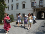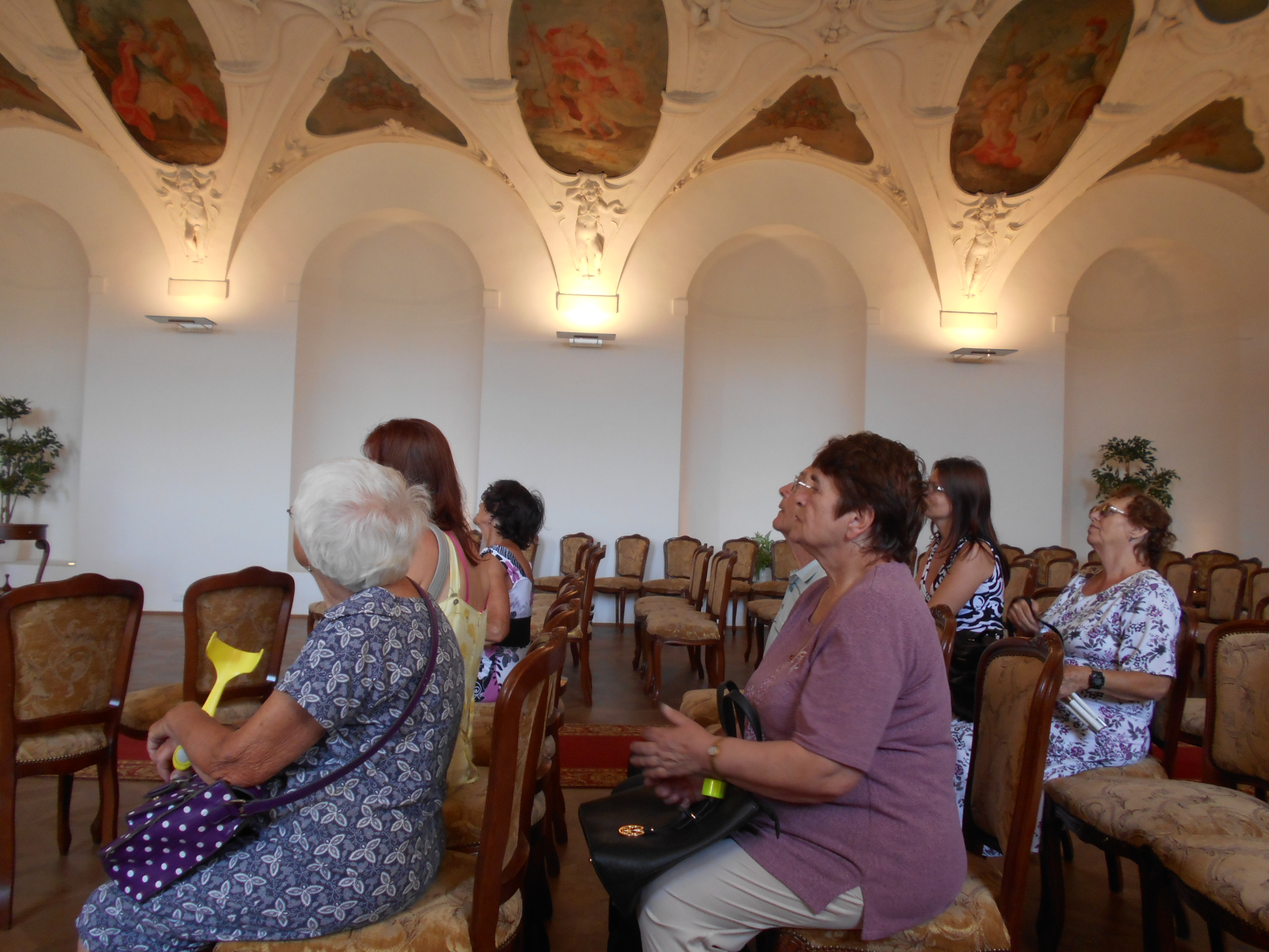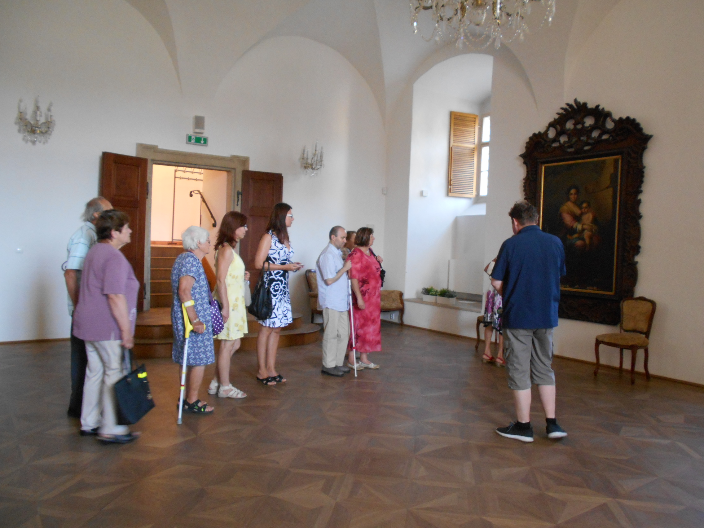 Prohlídku zámku jsme začali v sala terreně s bohatou štukovou výzdobou, kde nás náš průvodce pan Leoš Thomayer seznámil s historií a stavebním vývojem zámku od 13. do 20. století v souvislosti se střídajícími se majiteli panství. Zajímavý a podrobný výklad nám pan průvodce zpestřil i malým klavírním koncertem ve své vlastní interpretaci.