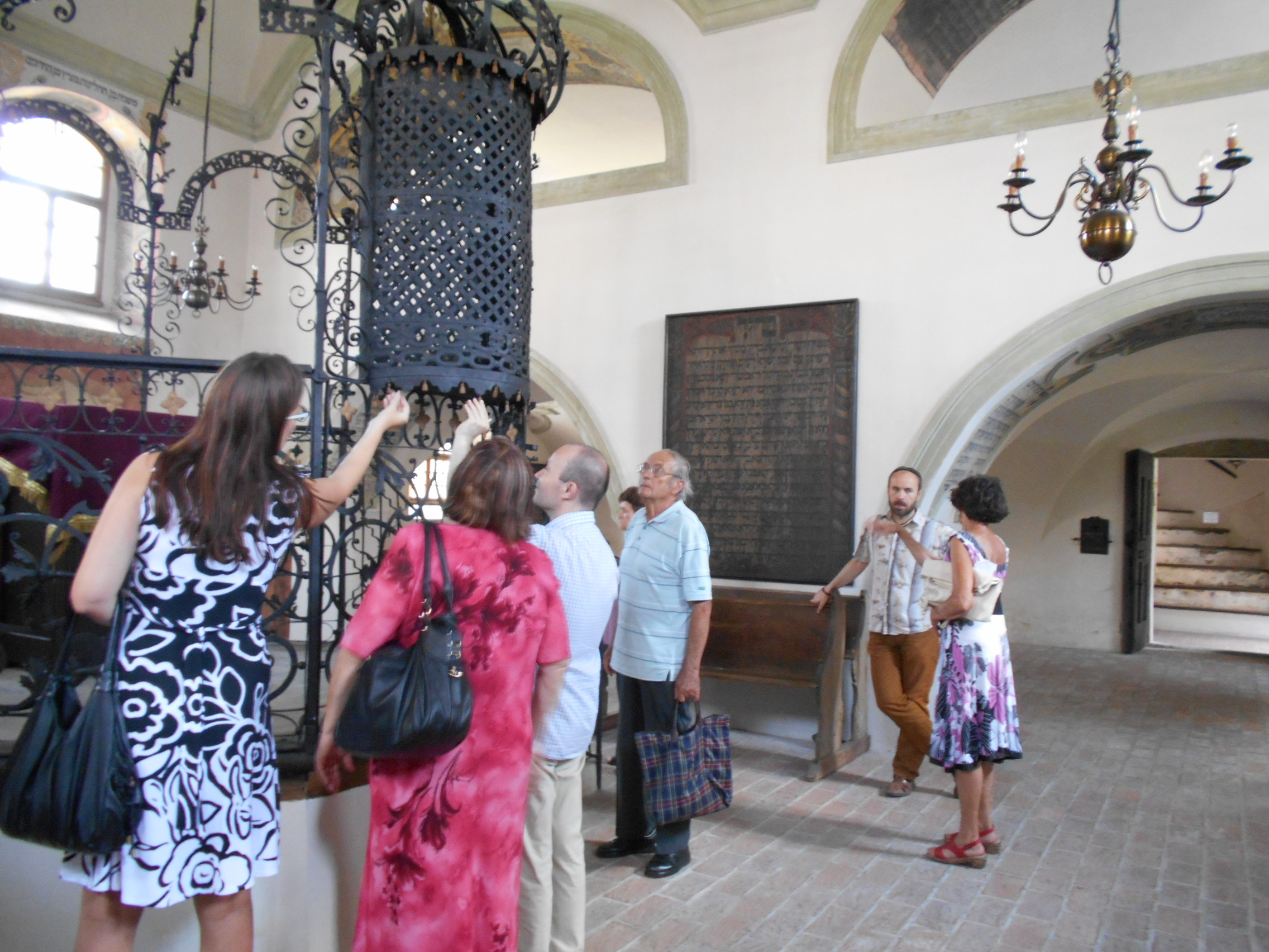 V předsíni a modlitebním sále nám osvětlil její historii a význam a přiblížil i popsal vybavení interiéru. Šachova synagoga stojí od roku 1560 a patří k nejstarším v České republice. Její významnost souvisí se zdejším působením rabína Šabataje Kohena, jednoho z dvaceti nejvýznamnějších rabínů židovského národa, který je pohřben na místním hřbitově.