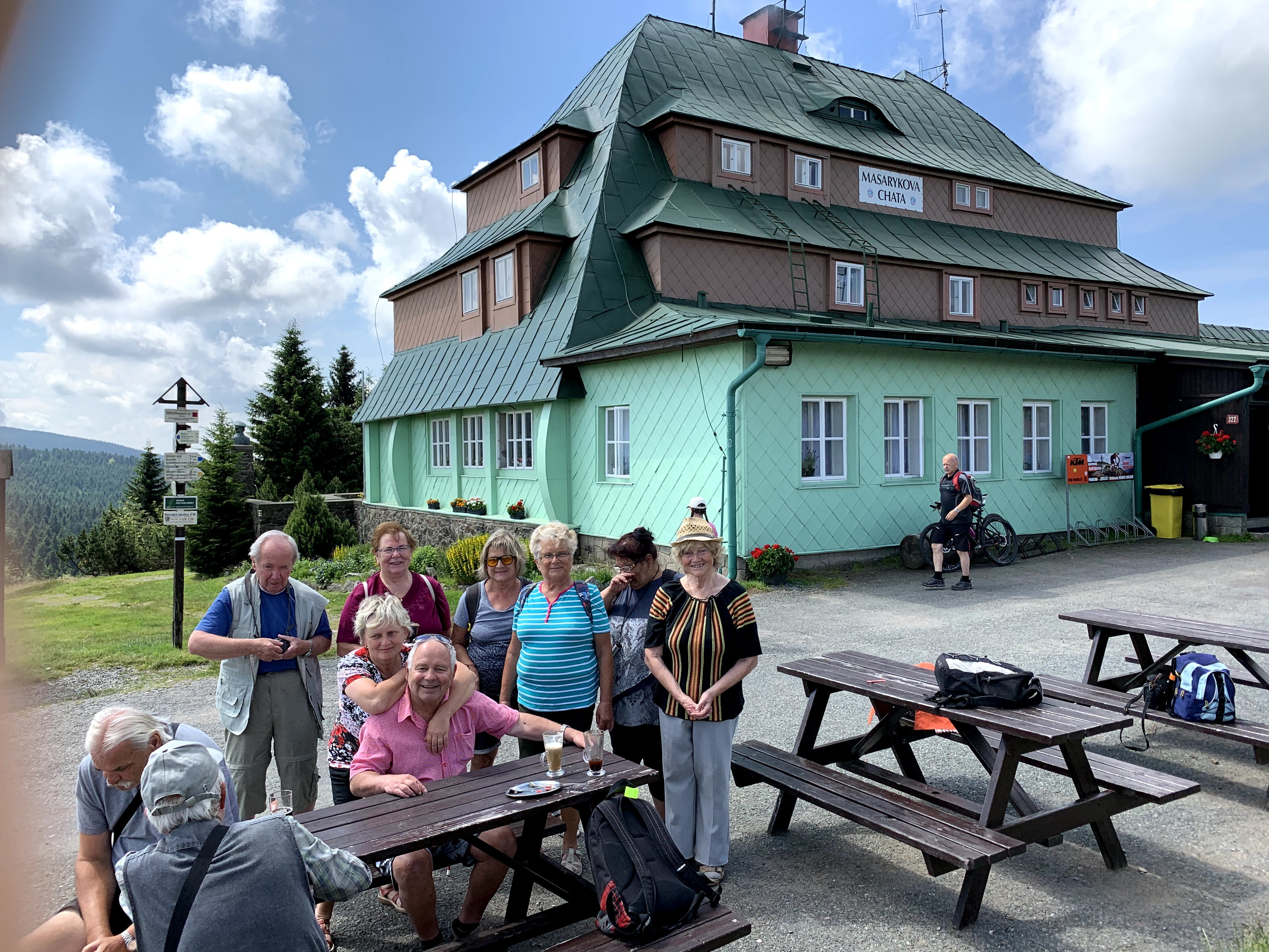 Pohled z vrcholu na polskou stranu byl pohádkový.. Na obzoru se tyčilo pásmo Bystřických a dále Stolových hor. Na naší straně byl pohled umírněný, plný malých obcí a městeček. Jen nejvyšší hora Deštná se vypínala s výškou 1115 metrů 3 kilometry od nás. Na Masarykově chatě nás čekal dobrý oběd. Jen na kávu už nezbyl čas.