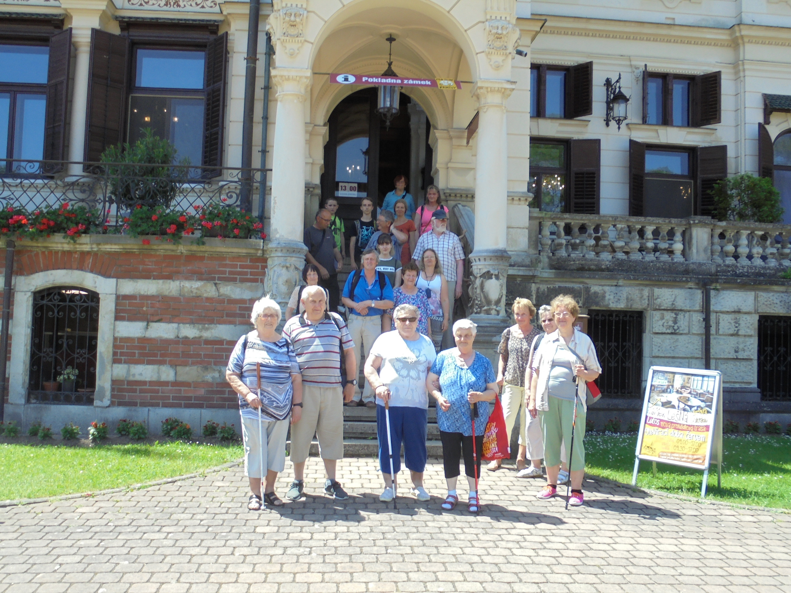 I letos díky panu JUDr. Pětníkovi, který nám sponzoroval dopravu autobusem, jsme měli možnost zavítat do vzdálenějšího místa, kam se při našich běžných výletech hromadnou dopravou nedostaneme. Brzy ráno 11. června jsme vyrazili směr Zlín. Cílem našeho výletu byla ZOO a zámek Zlín-Lešná. Cesta tam i zpět probíhala hladce, dálnice D1 nás mile překvapila, nebyly žádné kolony. Tím jsme získali čas před plánovanou prohlídkou zámku, který jsme využili na občerstvení a zorientování se v areálu. V jedenáct hodin nás přivítala paní průvodkyně ve vstupní hale zámku, kde jsme obdivovali dřevěné obložení stěn a stropu. Veškeré dřevořezbářské práce na zámku na zakázku zhotovili vídeňští mistři z mořeného slavonského dubu. Dominantou haly je prostorné schodiště, které původně vedlo k soukromým místnostem hraběcí rodiny. Přes malý salonek s nábytkem a nádobím z hradu Lukova a jídelnu jsme došli do sálu předků. Díky dřevořezbářské výzdobě patří mezi nejkrásnější zámecké interiéry. Dále jsme si prohlédli kulečníkovou hernu, dámský salonek, ložnici, koupelnu, společenský salon, zámeckou kapli a poslední místností byla knihovna. Zde jsme obdivovali sbírky uměleckých předmětů z cesty kolem světa, kterou majitelé podnikli na konci dvacátých let 20. století. Téměř všechno vybavení interiéru zámku Lešná je původní. Zámek byl původně majetkem rakouské šlechty, říšských hrabat z rodu Seilern-Aspang. Hraběcí rodinou byl obýván do dubna 1945. Na konci války se rodina odstěhovala do rakouského Litschau, kde potomci rodu žijí dodnes.