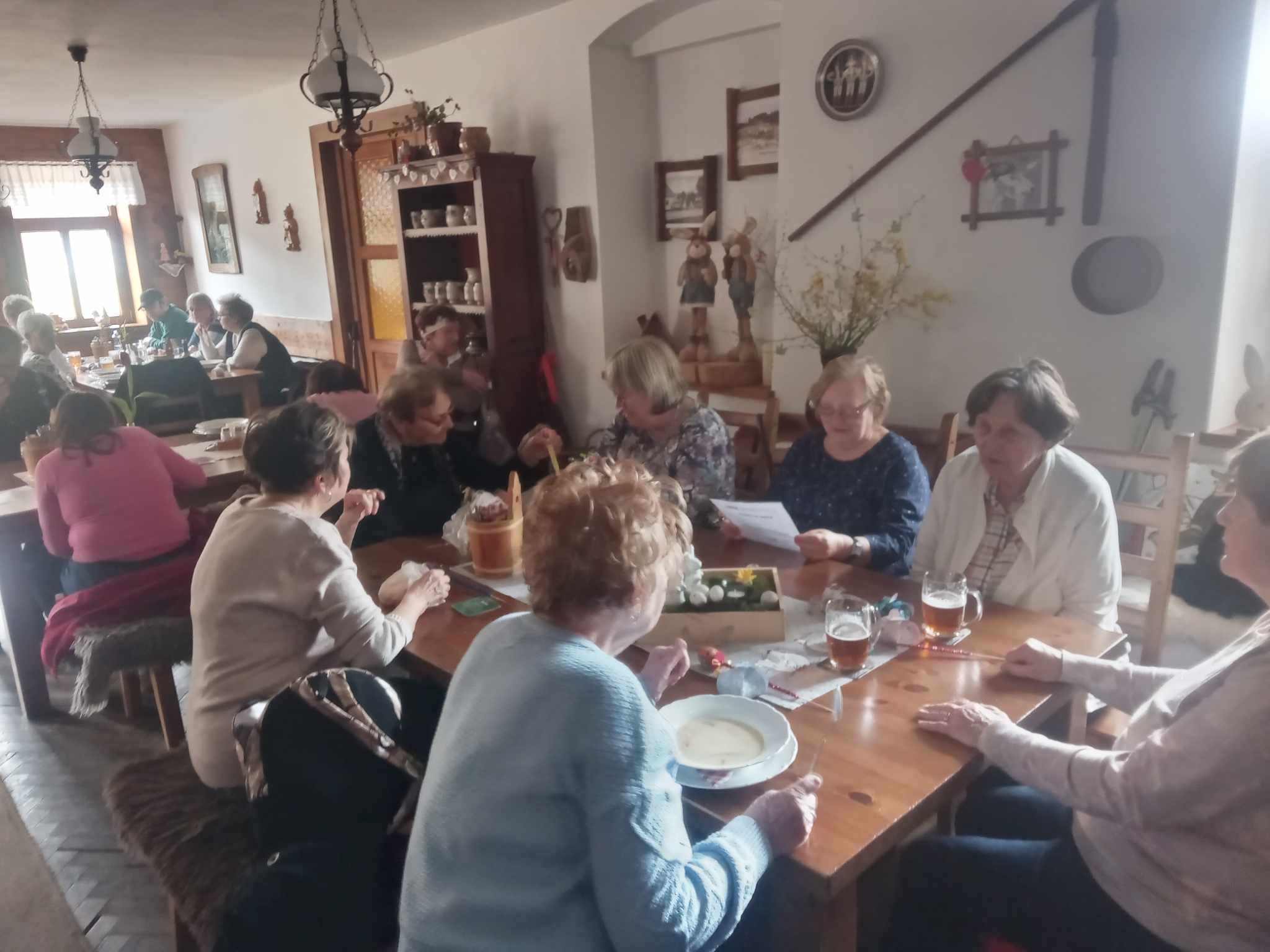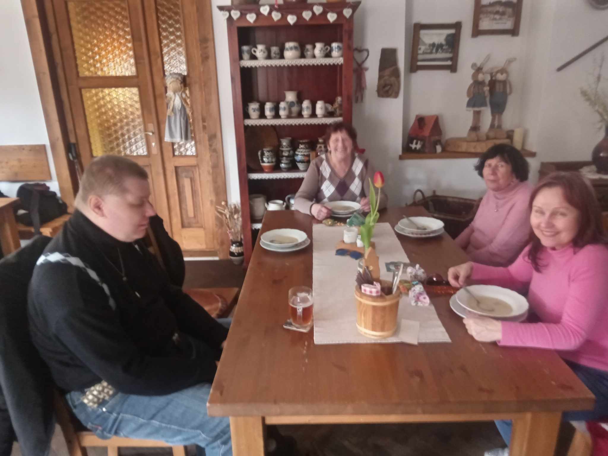 Na Maliník jsme se dopravili pomocí MHD mírně po poledni. Vládlo příjemné slunečné počasí, ač mírně větrné. Za hojné účasti cca 20 lidí jsme se prošli z mírného kopečka necelé dva kilometry do "České chalupy". Zde nás čekalo tříchodové menu sestávající z jarní polévky, krůtí rolky s bramborovou kaší, hruškovým kompotem, kávou a vyhlášenými koláčky z pekařství paní Jahodové. Ceny byly s ohledem na lokalitu příznivé a výtečně jsme si pochutnali.