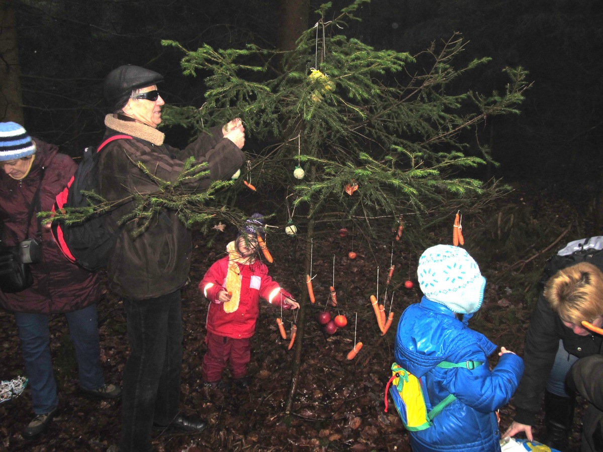 pověsili na stromeček mrkvičky, jablíčka a lůj pro ptáčky a přidali