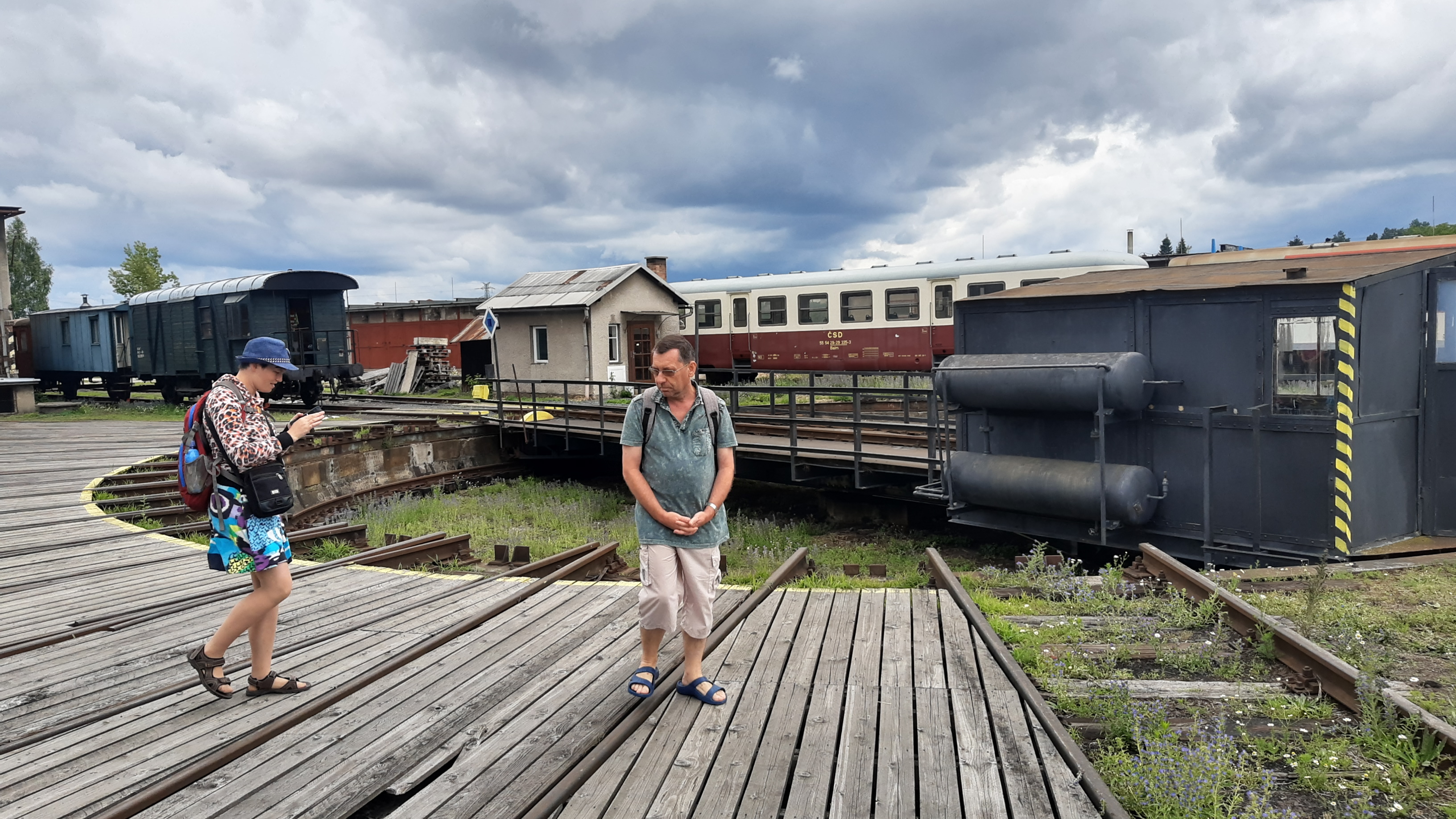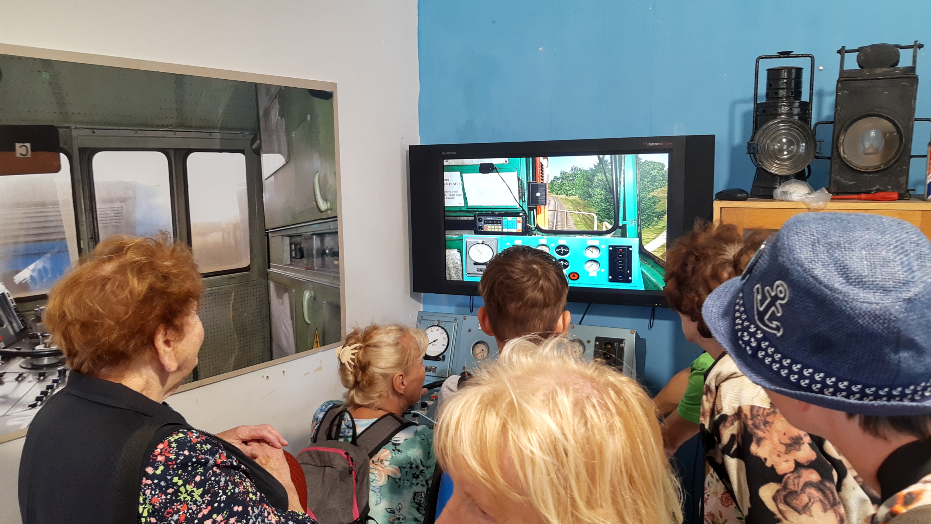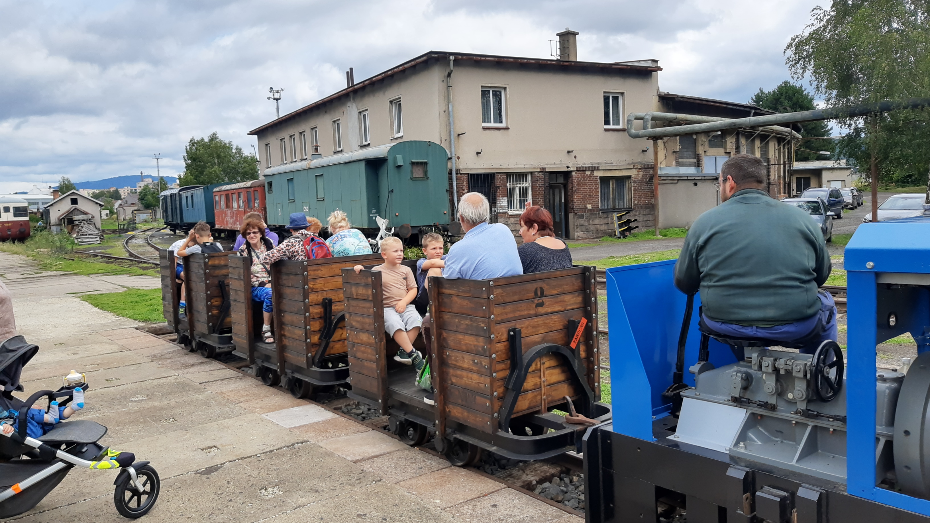Na nás čekali dva průvodci a strojvedoucí úzkokolejky, který nás povozil vláčkem. Jeden z průvodců nás překvapil tričkem s Braillovým písmem z akce Českých drah pro nevidomé. Po projížďce nás vzali do lokomotivního depa, kde jsme mohli vidět vlaky na železničních rampách pro opravy a rekonstrukce. Poslechli jsme si, jak tento koníček pro tyto nadšence je náročný nejen fyzicky, ale především finančně. Největší části práce je hledání sponzorů. Pro zprovoznění parní lokomotivy je nutné vždy vyměnit trubky vedoucí páru z kotle. I takto malá rekonstrukce dosahuje vysokých částek.