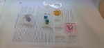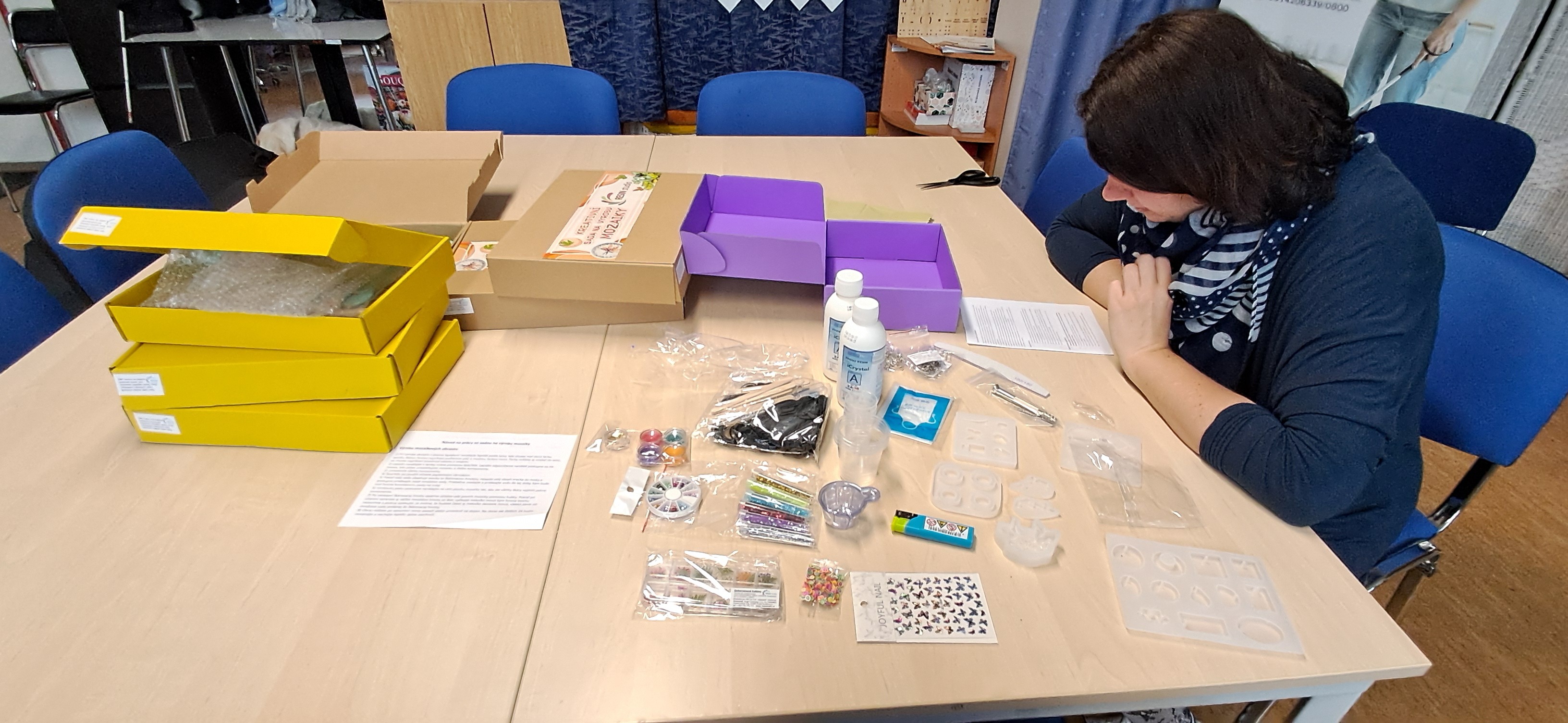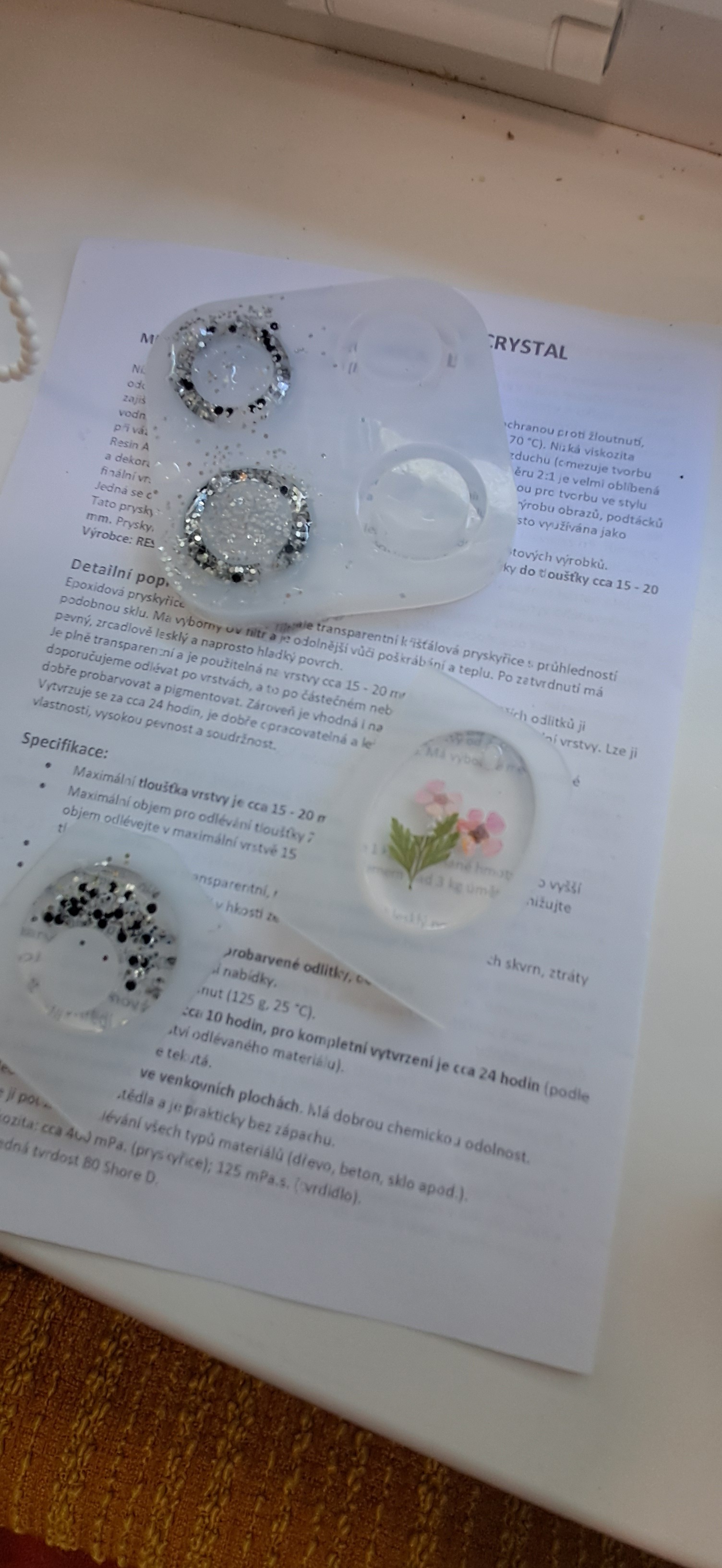 Šperky z pryskyřice jsme dělali poprvé. Radka k tomu objednala úplně geniální sadu, která obsahovala samozřejmě hlavní materiál, ale také různé dekorativní doplňky – třpytky a květinky různých barev a velikostí, ornamenty, formičky a kalíšky na přípravu pryskyřice. Také potřeby praktické a nečekané, jako jednorázovou zástěru, rukavičky a různá míchadla.