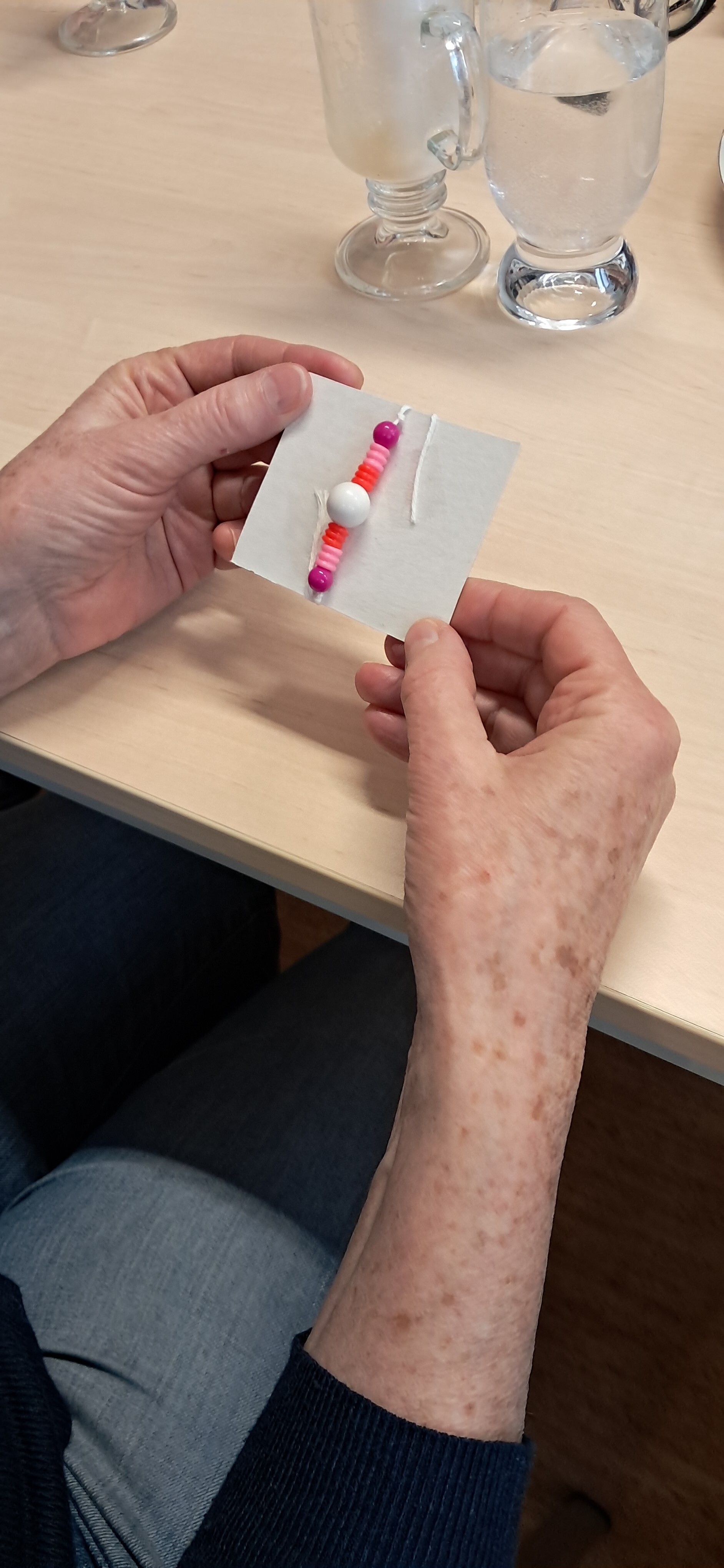 U druhého stolu pak seděl již zmíněný pan František a jeho tlupa navlékaček korálkových náramků. Zádrhel se objevil, když se zjistilo, že navléknout roztřepený provázek do malého otvoru korálku poslepu, ještě navíc když se sem tam trochu klepou ruce, by mohl být problém. Pan František se ale pro ten den stal vynálezcem sice již existující pomůcky, kterou ale zrovna žádná žena dneska už v kabelce nenosí. Řeč je o obyčejném navlékátku – takové té pokřivené pomůcce k rychlému navedení niti do očka jehly, když to zrovna z nějakých důvodů nejde. My jsme potřebovali navléct korálek s malou dírkou do provázku. A kus drátu umně ohnutý a zakroucený, (na jedné straně do špičky, na druhé zapletený v provázku) posloužil tak dobře, že jsme „sekaly“ náramky jak Baťa cvičky.