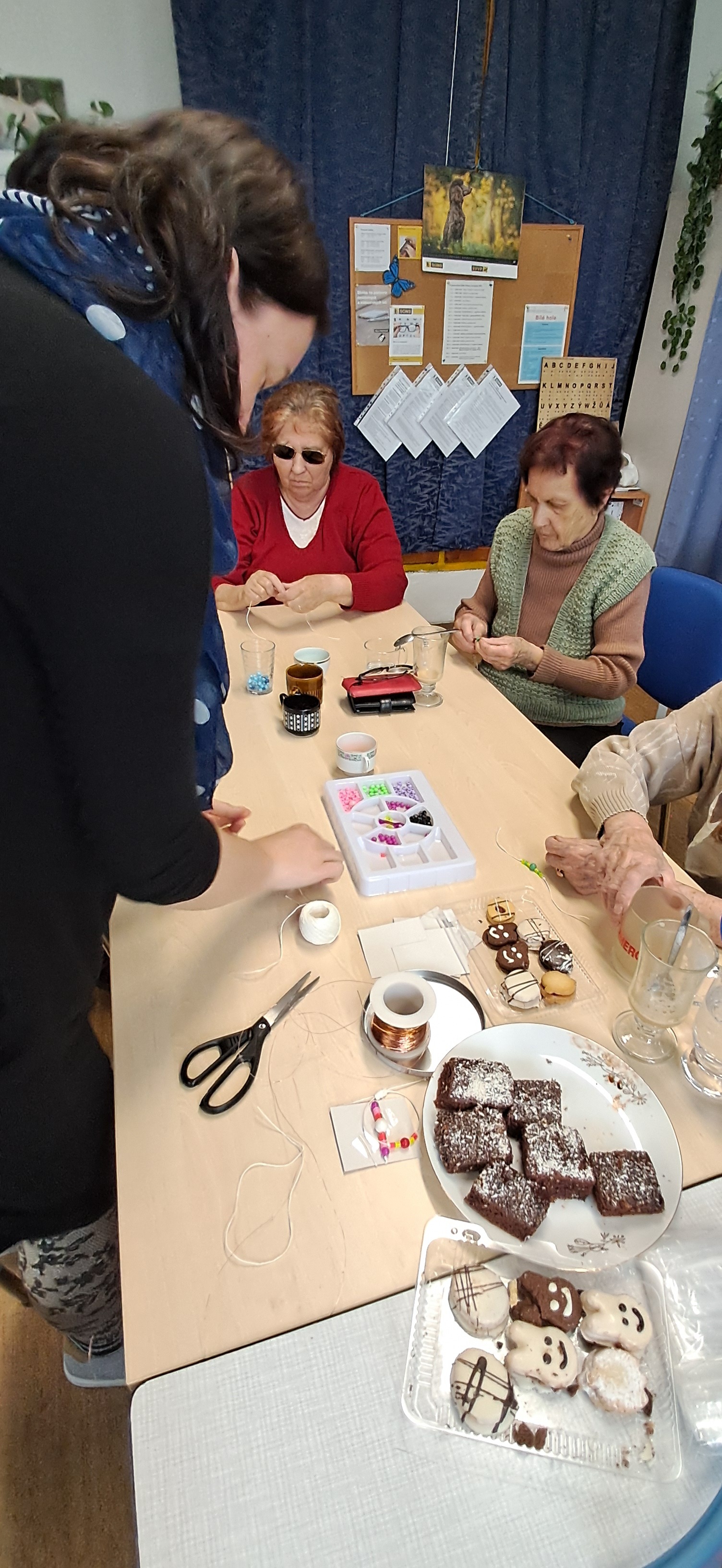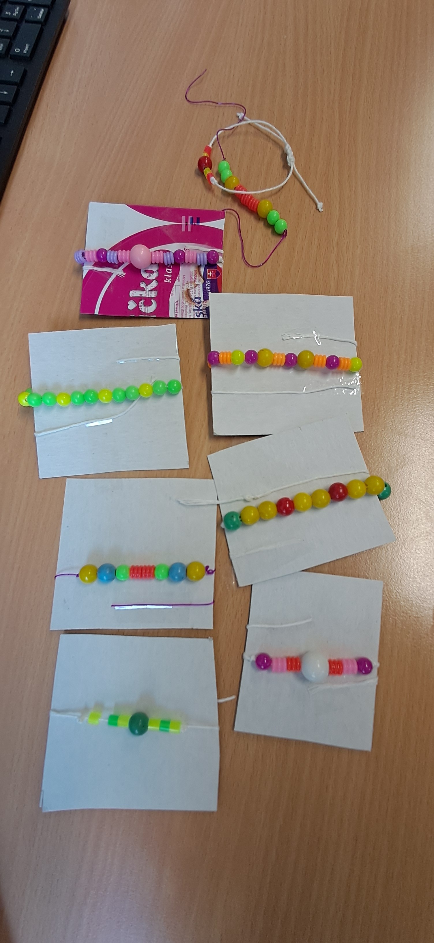 Jeden jsme vyčlenili na výrobu šperků. Poté, co Radka shlédla instruktážní video a přečetla návod, stala se mistrem v oboru a začala ke stolu po dvou volat učedníky. Ti následně přerostli svého mistra a vyrobili pár nevídaně krásných kousků.