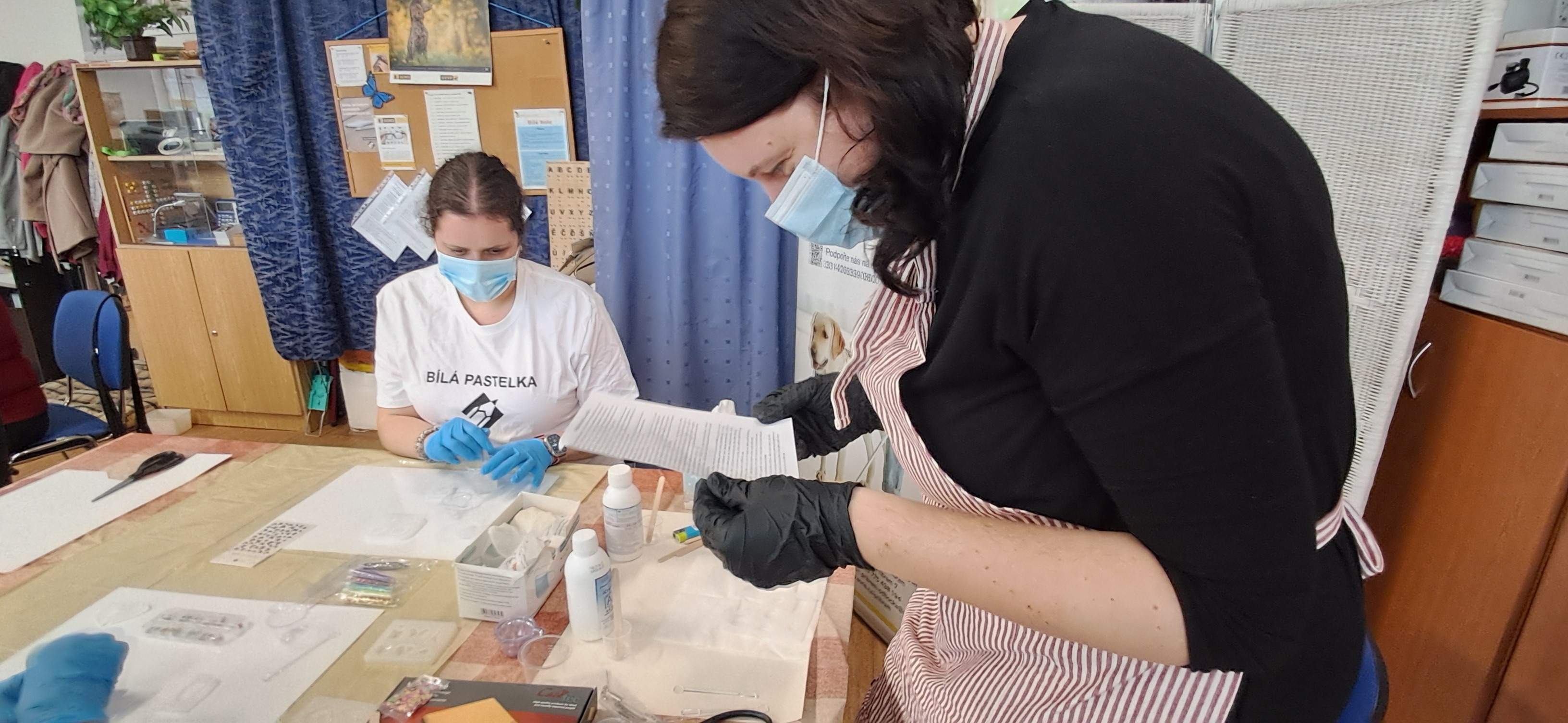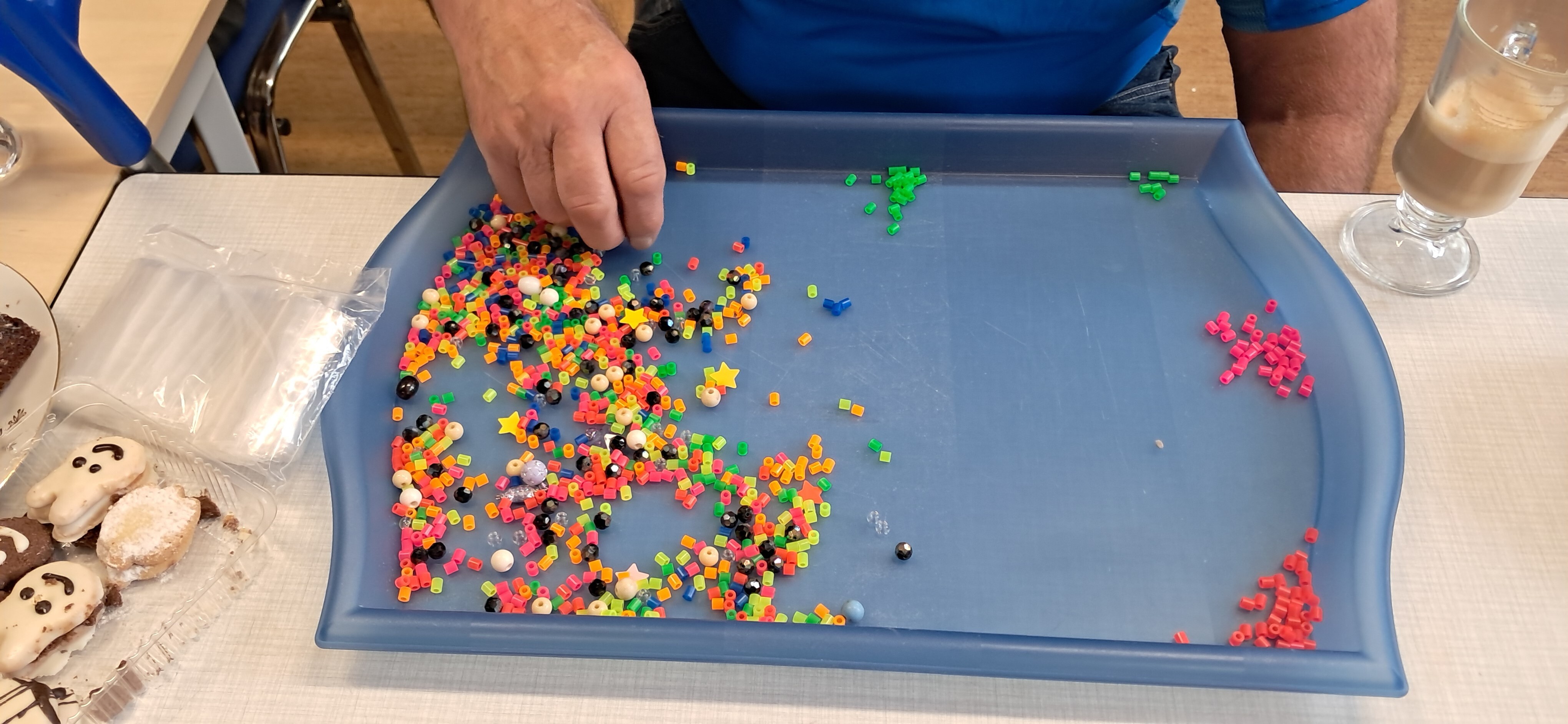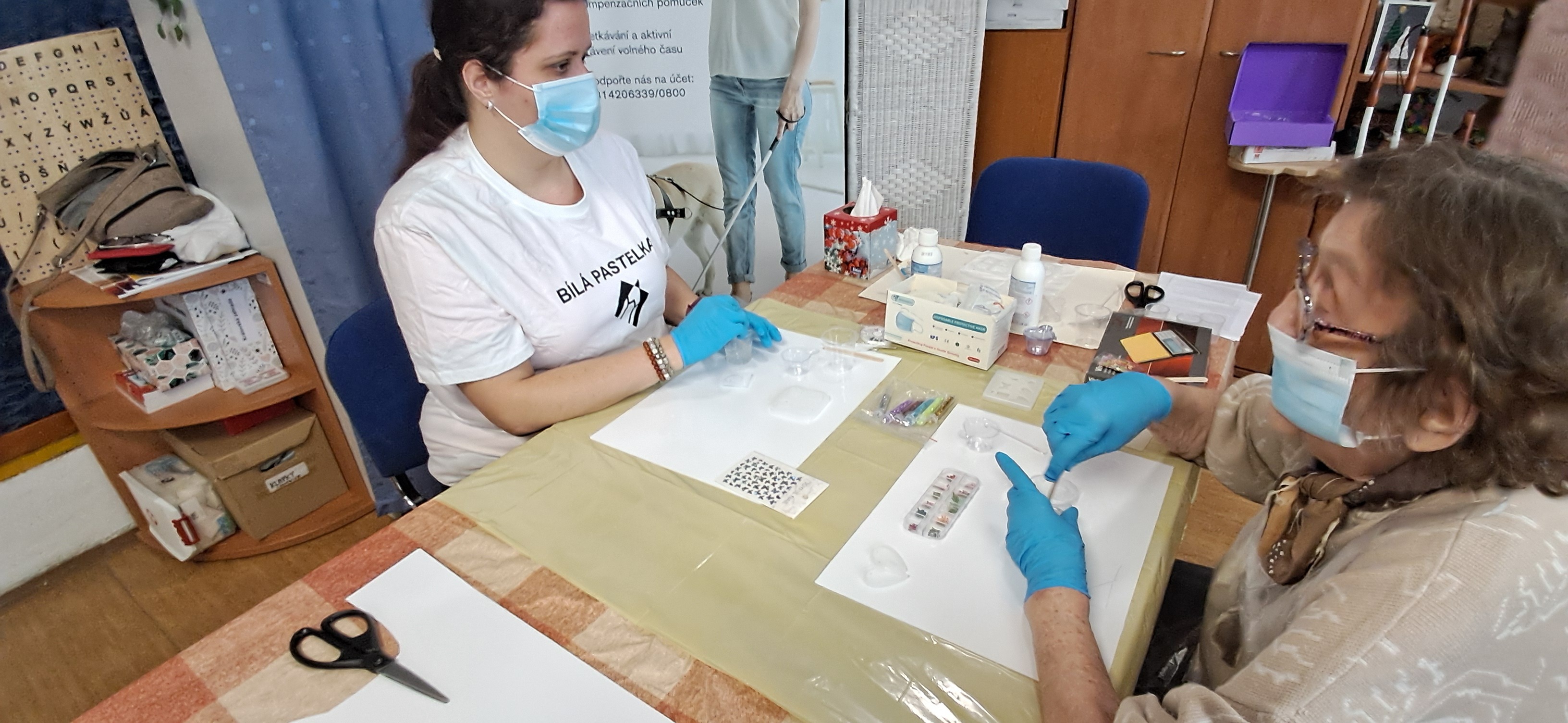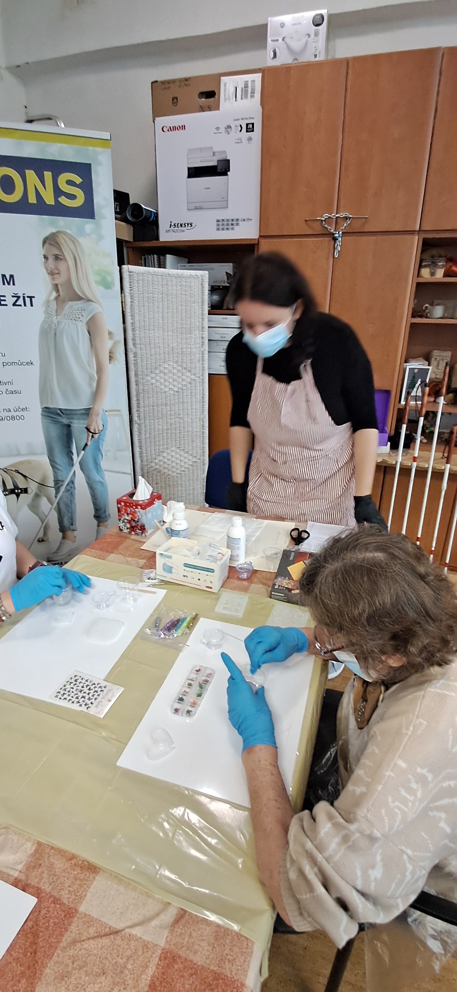 Na odlévání šperků a přebírání korálků opravdu došlo. Pan František, náš jediný mužský toho dne, na něm málem nechal ruce. Po nějaké době ale zjistil, že když přátelsky zotročí další účastnice, stylem „tady si sedni, vyber si barvu a udělej hromádku,“ půjde to rychleji. A tak se i stalo. Protože aby mohli lidé nevidící vyrobit krásně barevně sladěné náramky, nesmí být korálky v obrovském množství, mnoha barev jaksi spolu v misce, ale každá barva v hrnečku, následně v pytlíčku.
