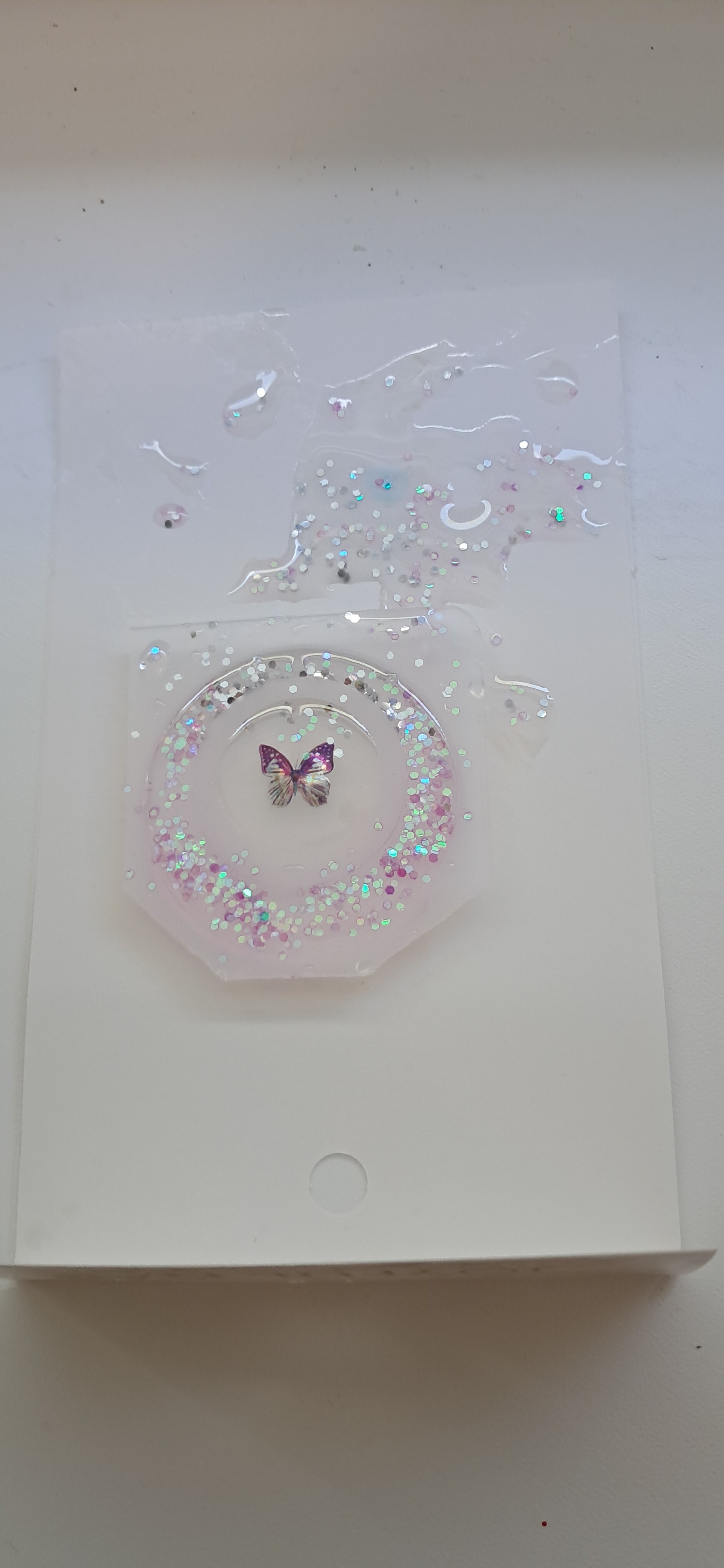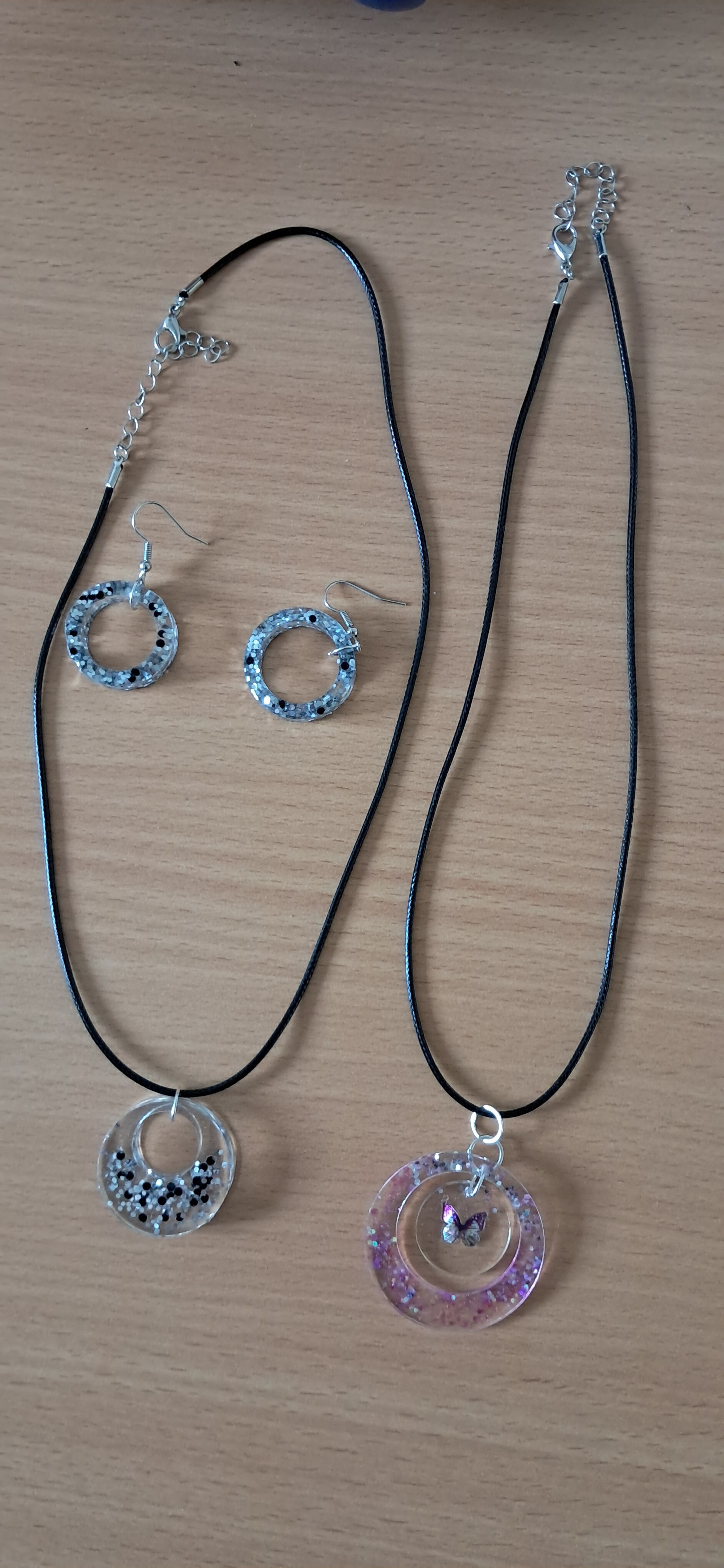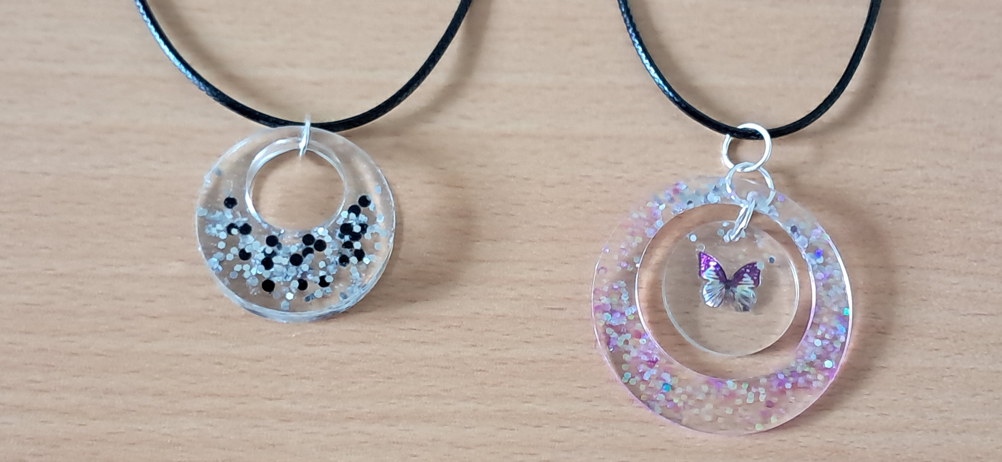 Pryskyřice se nalila do forem a ozdobila třpytkami. Ty se v materiálu usadily a staly se součástí budoucího šperku. Podnos s takto vyrobenými přívěsky a náušnicemi se následně vyexpedoval na parapet, kde měl den tvrdnout. Na můj vkus to dopadlo nad očekávání dobře. Hotové výrobky vypadají krásně a jsou nositelné.
