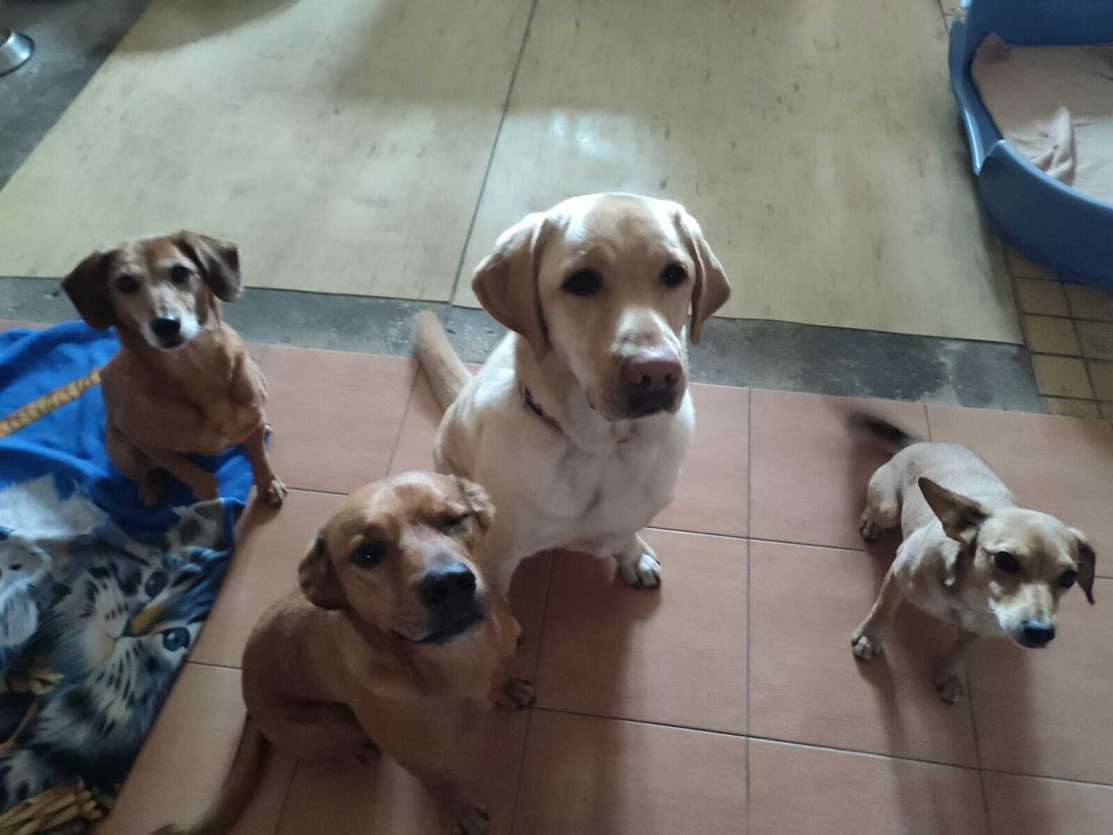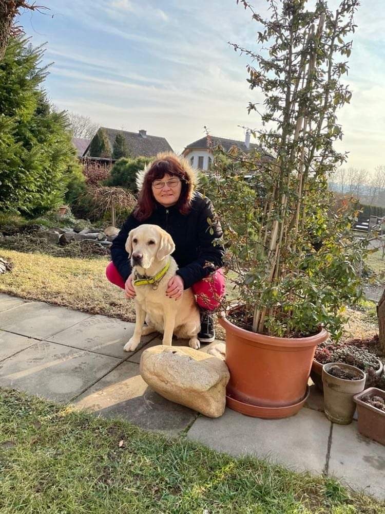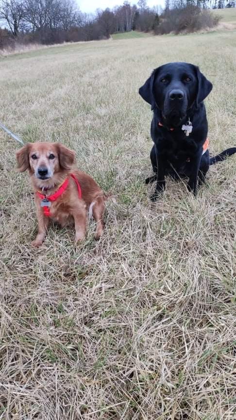 Charlika na kus cesty vyprovodila i kamarádka Betynka. Ta se nejspíš chtěla pochlubit novými červenými „kšandičkami“. (Na louce sedí černý labrador Charlie a „polojezevčice“ Betynka)