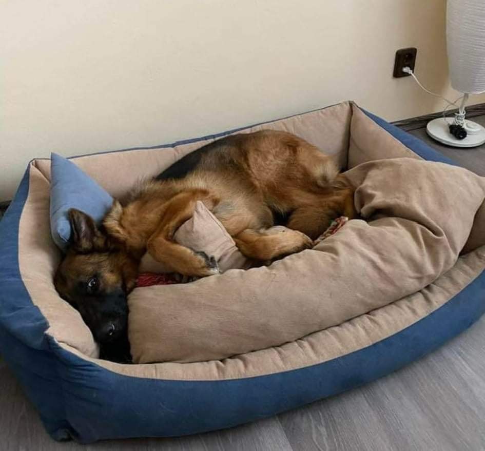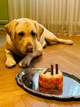 Feminka dostala k narozeninám dort se dvěma voňavými tyčinkami místo svíček. (Ležící světlá labradorka fascinovaně hledí na stříbrný tác, na němž je určitě lákavě vonící dortík z krůtího masa a rýže; ozdoben je dvěma tyčinkami místo svíček, z dalších tyčinek je složeno písmenko „F“)