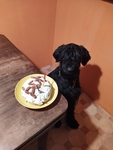 I kníračka Adélka oslavila své třetí narozeniny voňavým dortíkem. (Černá střapatá Adélka pózuje u stolu, na jehož rohu je talíř s dortíkem; dort je z masa, rýže a zeleniny, povrch z tvarohu, ozdoben je mandlemi, které tvoří Adélčino jméno)