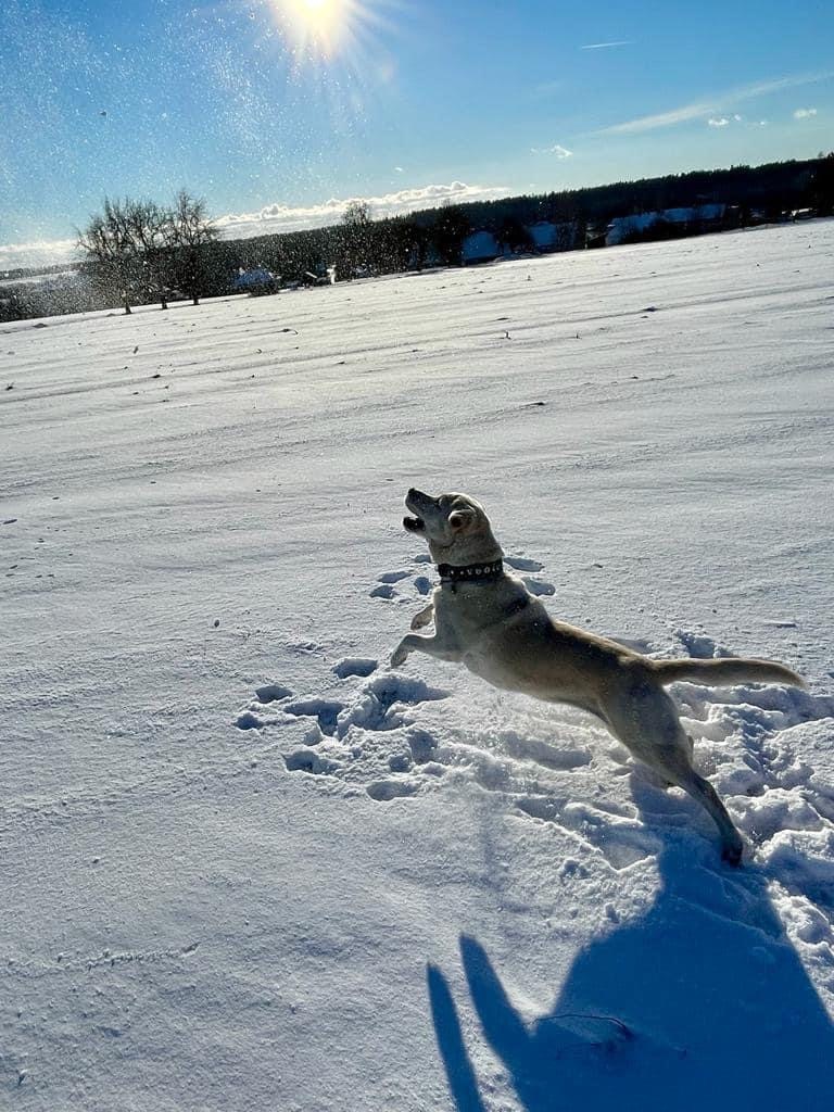 Radostná Vali. (Světlá fenka je zachycena při výskoku na zasněžené louce; na jasně modré obloze stříbrně září slunce)