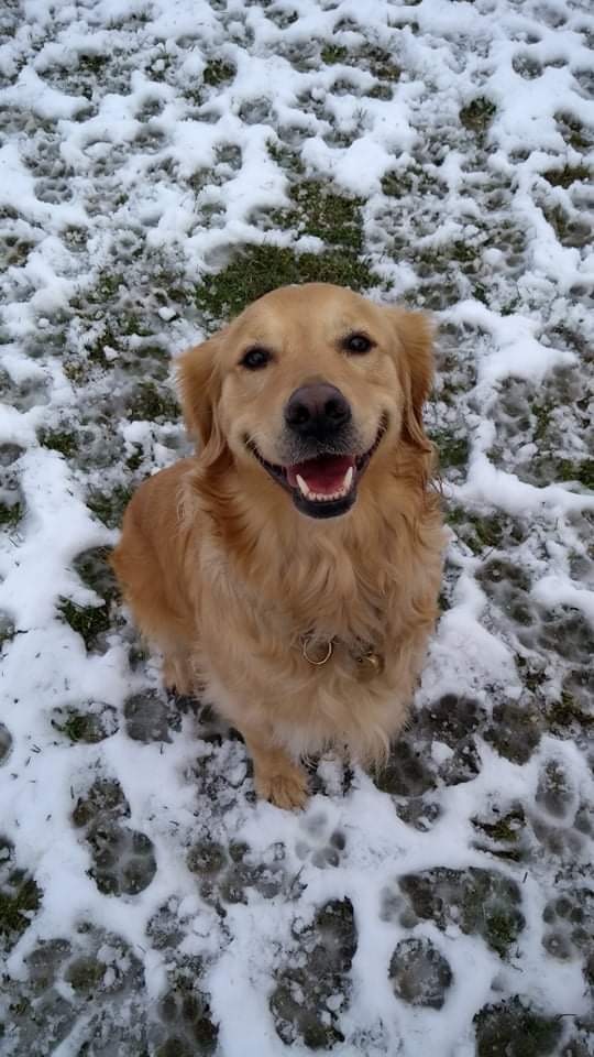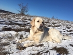 Goldenům to sluší všude, Sanynce dvojnásob. (Světlerezavá goldenka Sany sedí na mírně zasněžené louce a hledí přímo do foťáku)