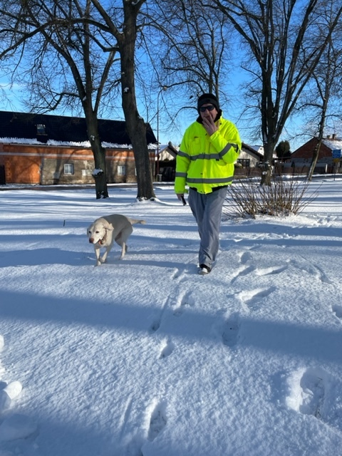 „Pane, pojďme už domů, zebou mě pacičky!“ Žadoní Monty. (Světlý labrador s pánem Petrem v žlutozelené bundě na zasněžené cestě)