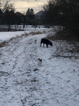 Nejstarší účastnice pochodu Clea a její doprovod. (Černá labradorka očichává zasněženou cestu; jejím doprovodem jsou dvě bílo-mourovaté kočky)