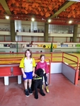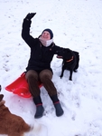 Zatímco panička Radka na kus cesty použila dopravní prostředek - boby, Deminka musí ťapkat pěšky! (V popředí je Deminčina panička v tmavém oblečení, sedí na červených bobech a zjevně se raduje, že jízdu zvládla; za ní vidíme černou labradorku, která by se evidentně taky ráda svezla)