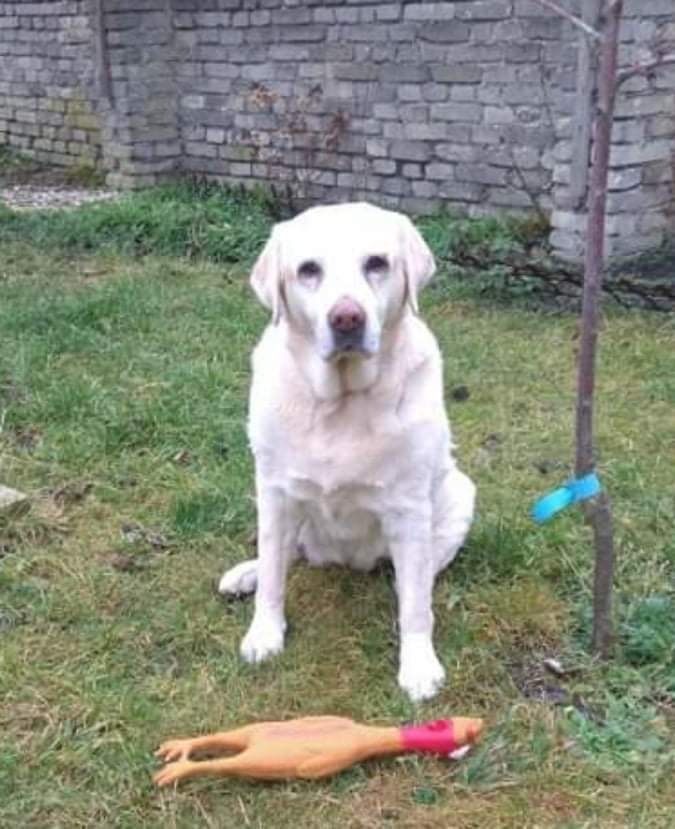 Ašenka nepodcenila přípravu proviantu na cestu. Kuře se teď určitě bude hodit. (Sedící světlá labradorka si hlídá gumové kuře)