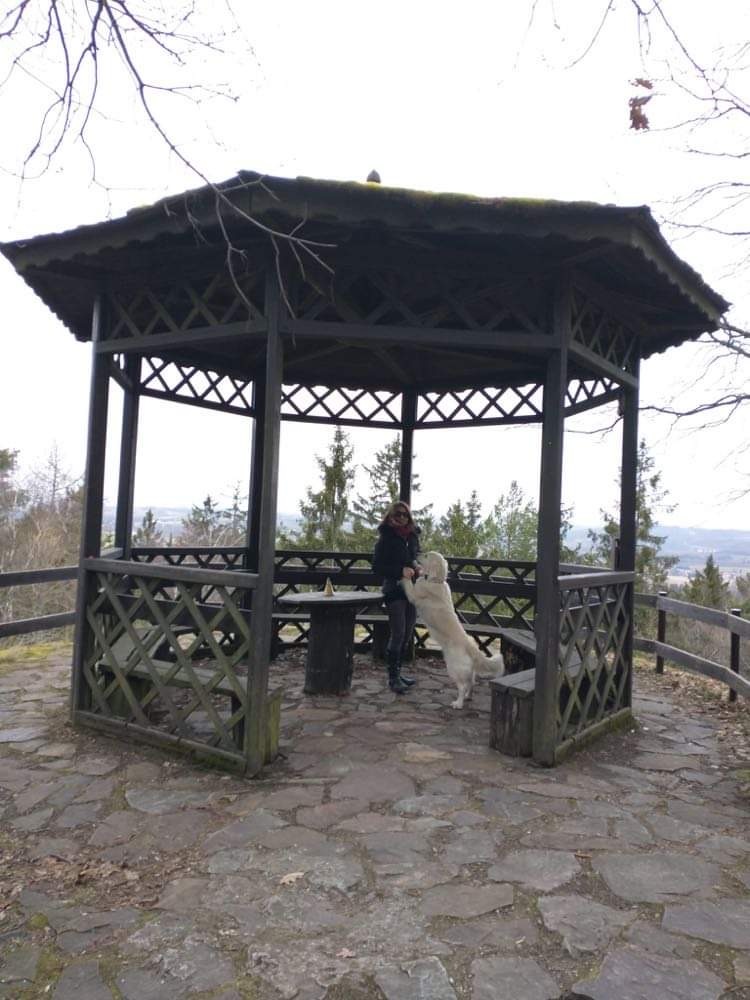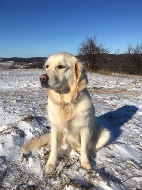 „Taky si trochu odpočinu,“ rozhodla se Chantalka. (Mladá goldenka sedí na zasněžené louce; obloha je modrá, sluníčko svítí, Chantalka vrhá stín)