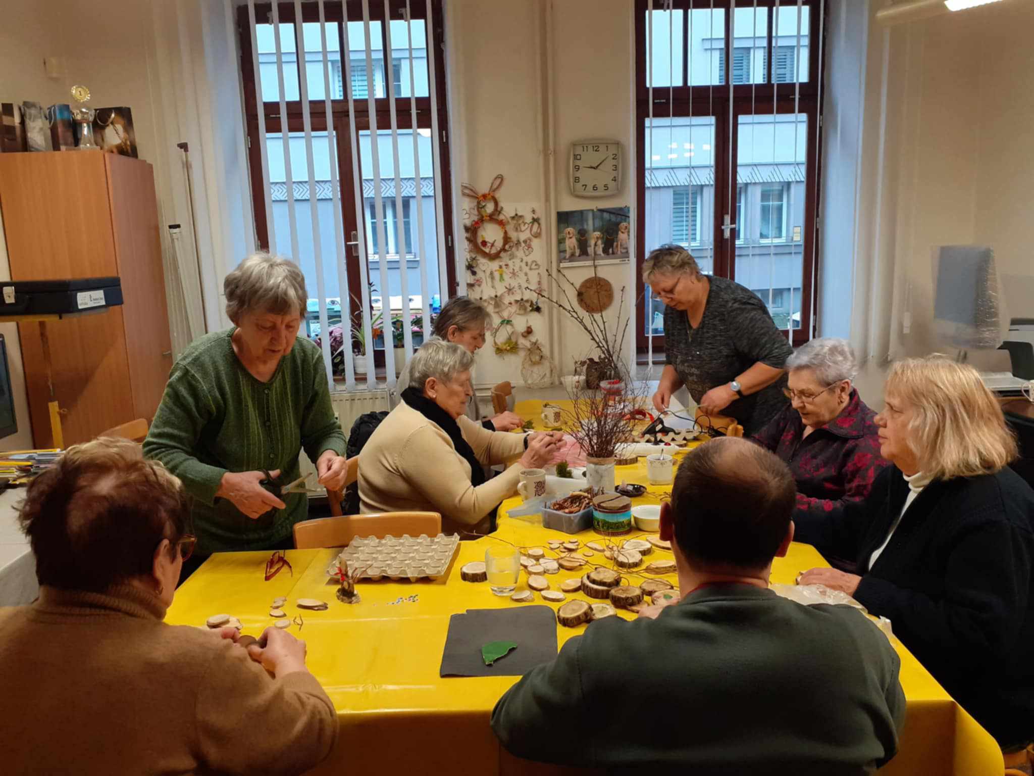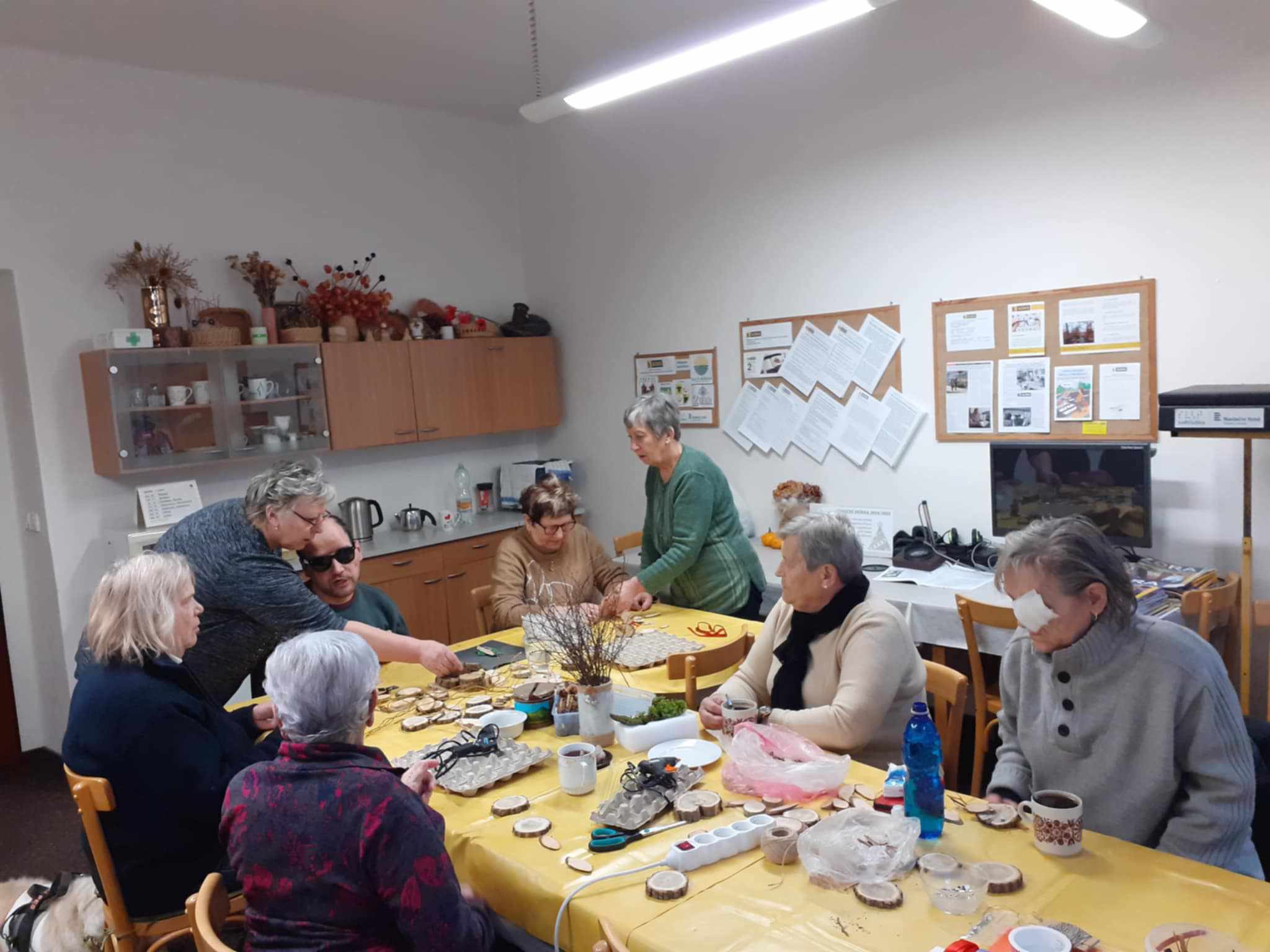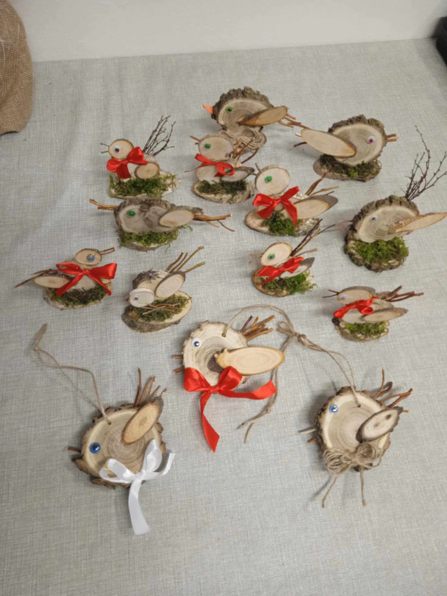 Ve výtvarném kroužku se tentokrát pracovalo se dřevem. Předem nachystaná dřevěná kolečka a jiné tvary a materiály k nazdobení dřevěného ptáčka, který mohl být umístěný na stojanu nebo na šňůrce. Na začátku se zdál výrobek k sestavení těžký, ale postupnými kroky došli všichni k dokončení a měli velkou radost z výsledku.