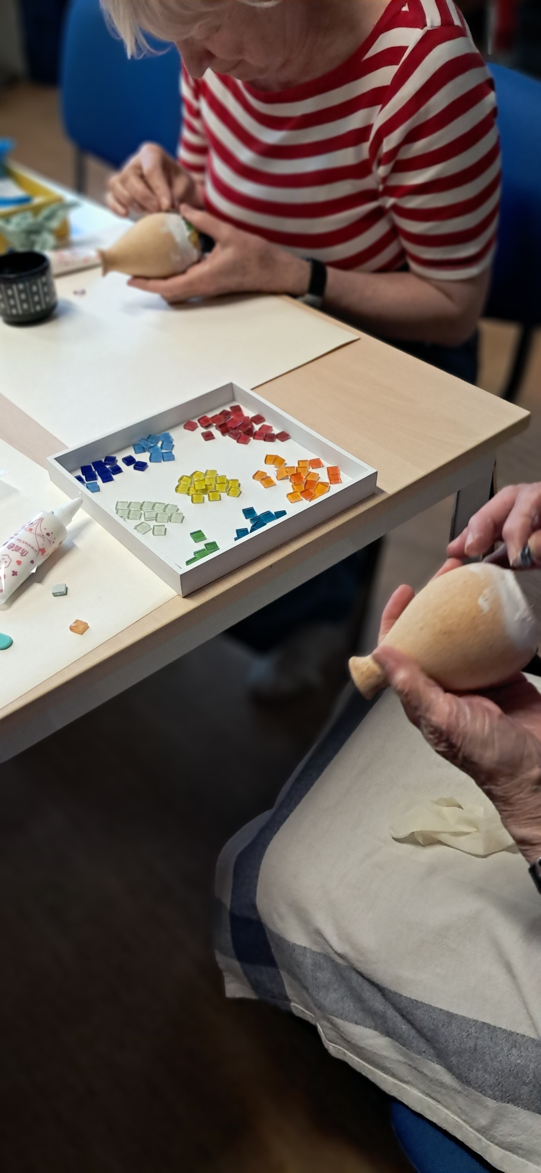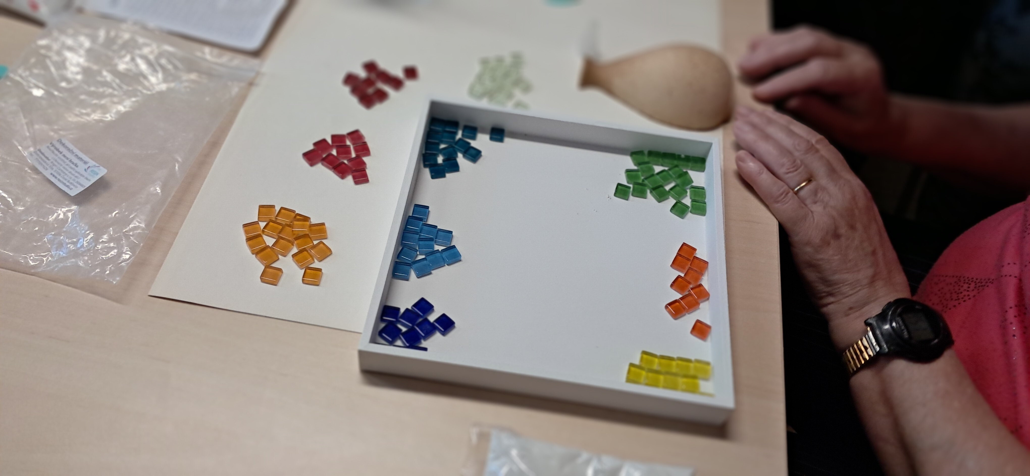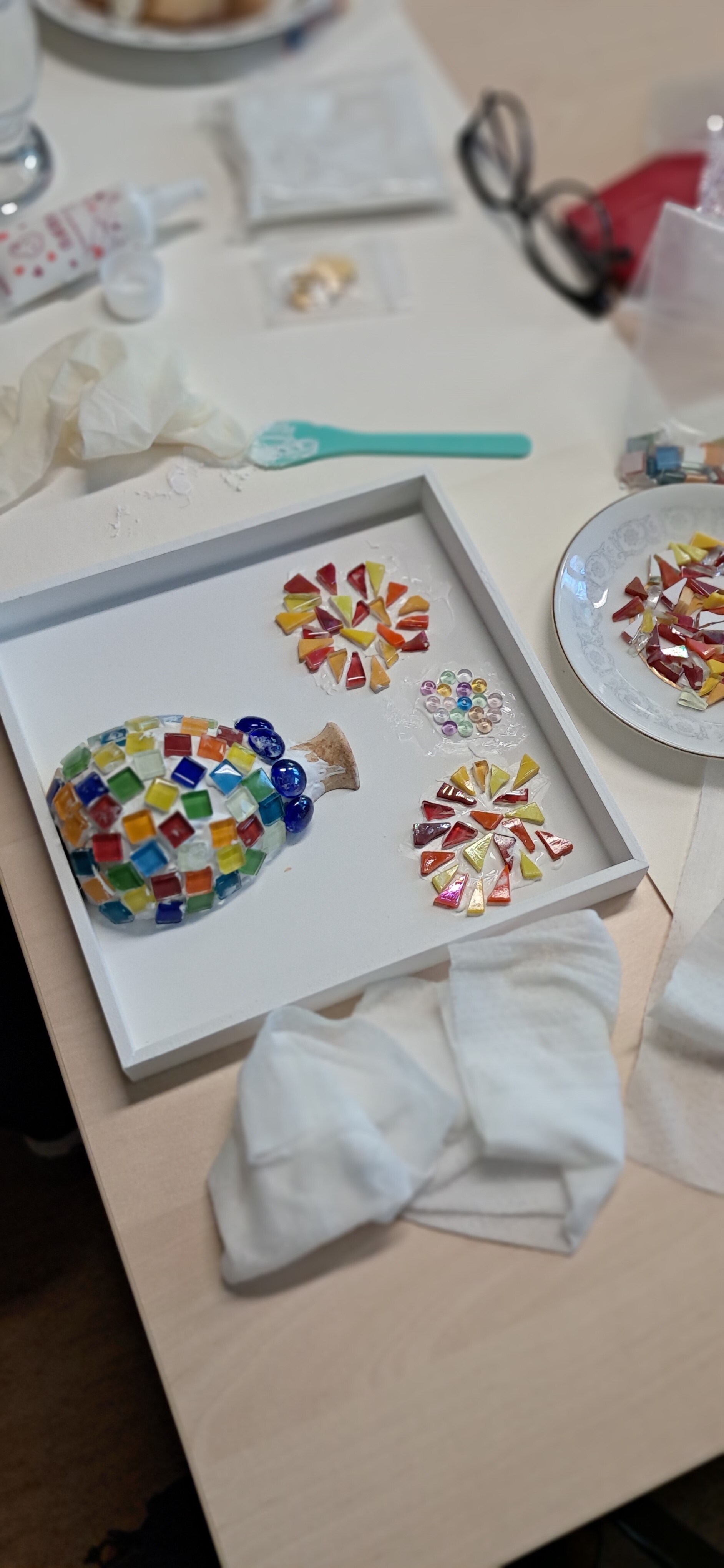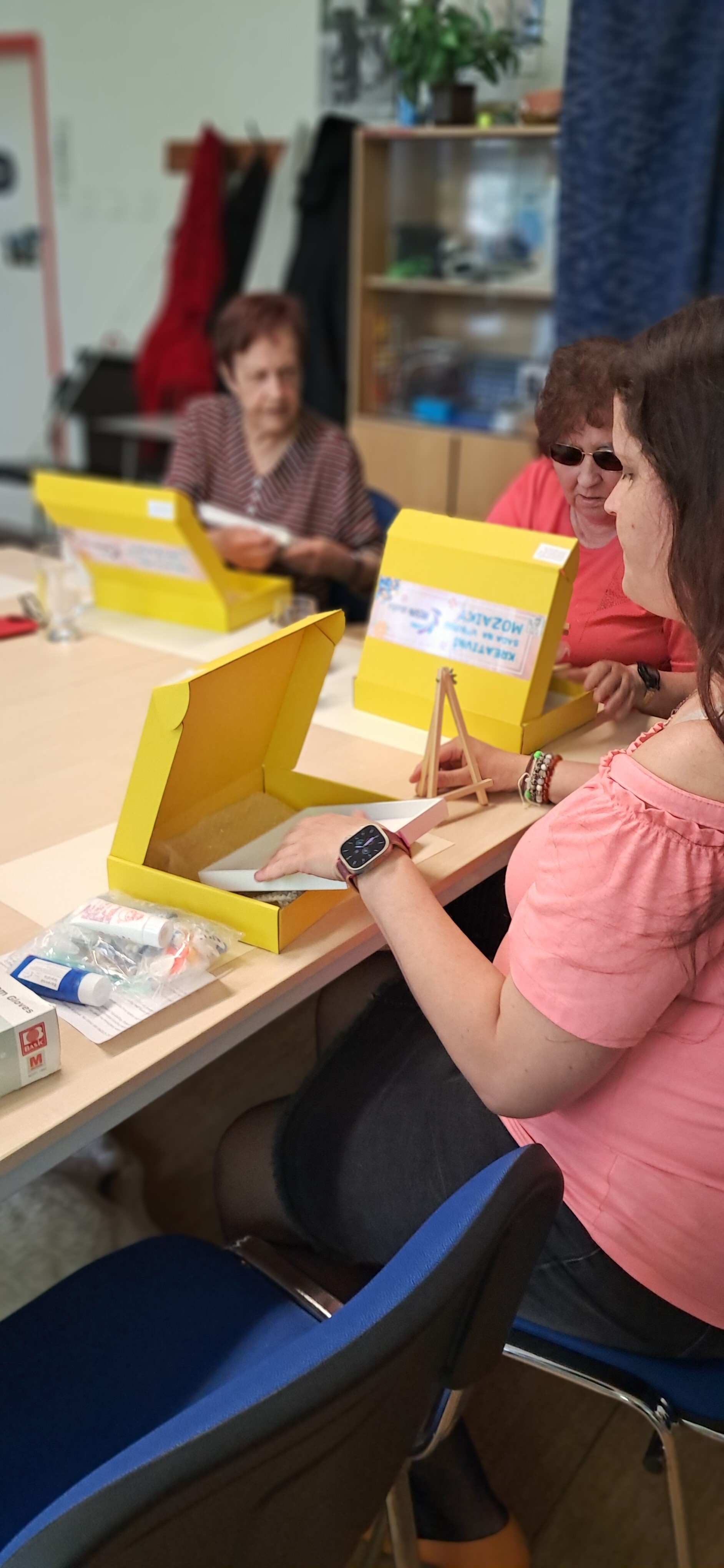 Tvoření, u něhož jsme se sešli v pondělí 13. června 2024, mělo v podtitulu hravý, až jako by laškovný dodatek „tvoříme pro radost.“ Po zkušenosti s mozaikou, a to jsem jen pomáhala, bych spíš řekla „doufáme, že to s námi v průběhu nešlehne a že nás pustí domů, když to nedokončíme.“ To aby si dal člověk něco ostřejšího na kuráž a poté pořádný dlabanec, protože jednomu vytráví, při práci se rozklepe a chvílemi neví, čí je.