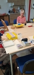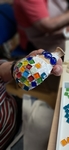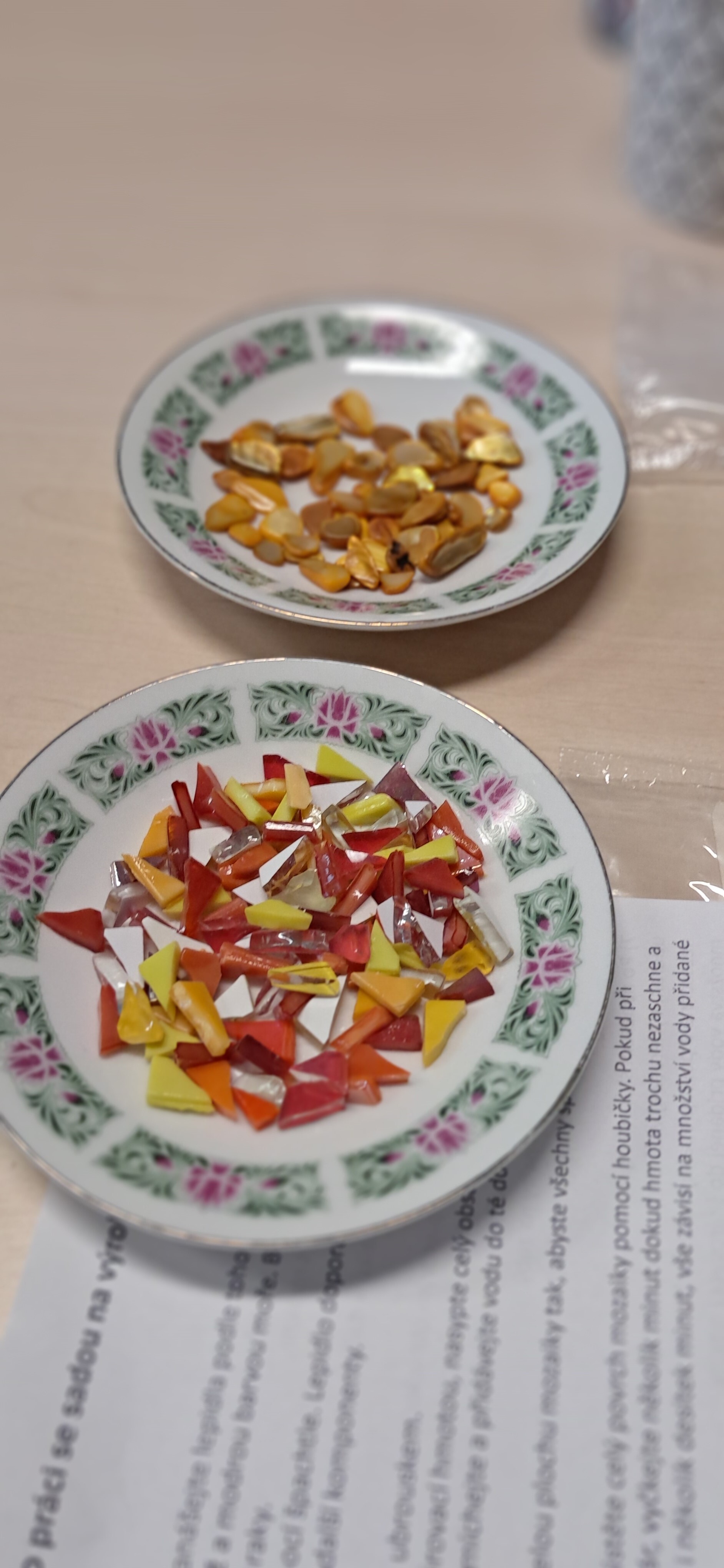 Vázička se potřela lepidlem a obložila kostičkami, nebo i kamínky. K dispozici byly větší modré, nebo množství tvarů vypadajících jako střepy. Podlouhlé trojúhelníky podzimních barev. Z těch jsme ale nakonec vyrobili květiny, které pochopitelně do každé vázy patří.