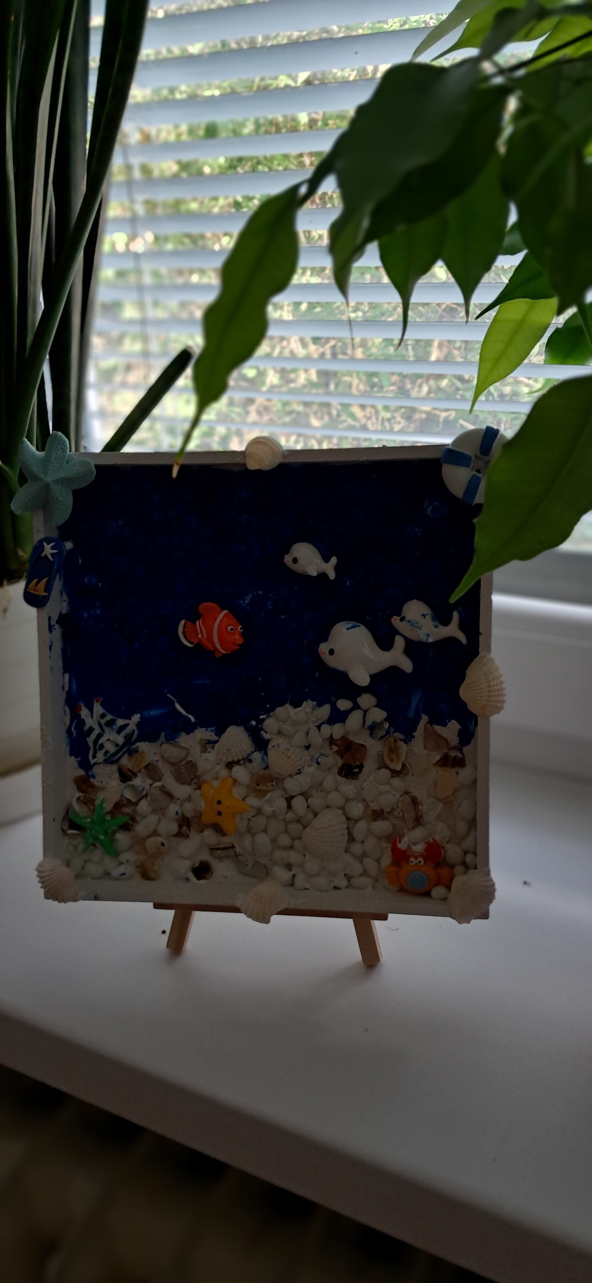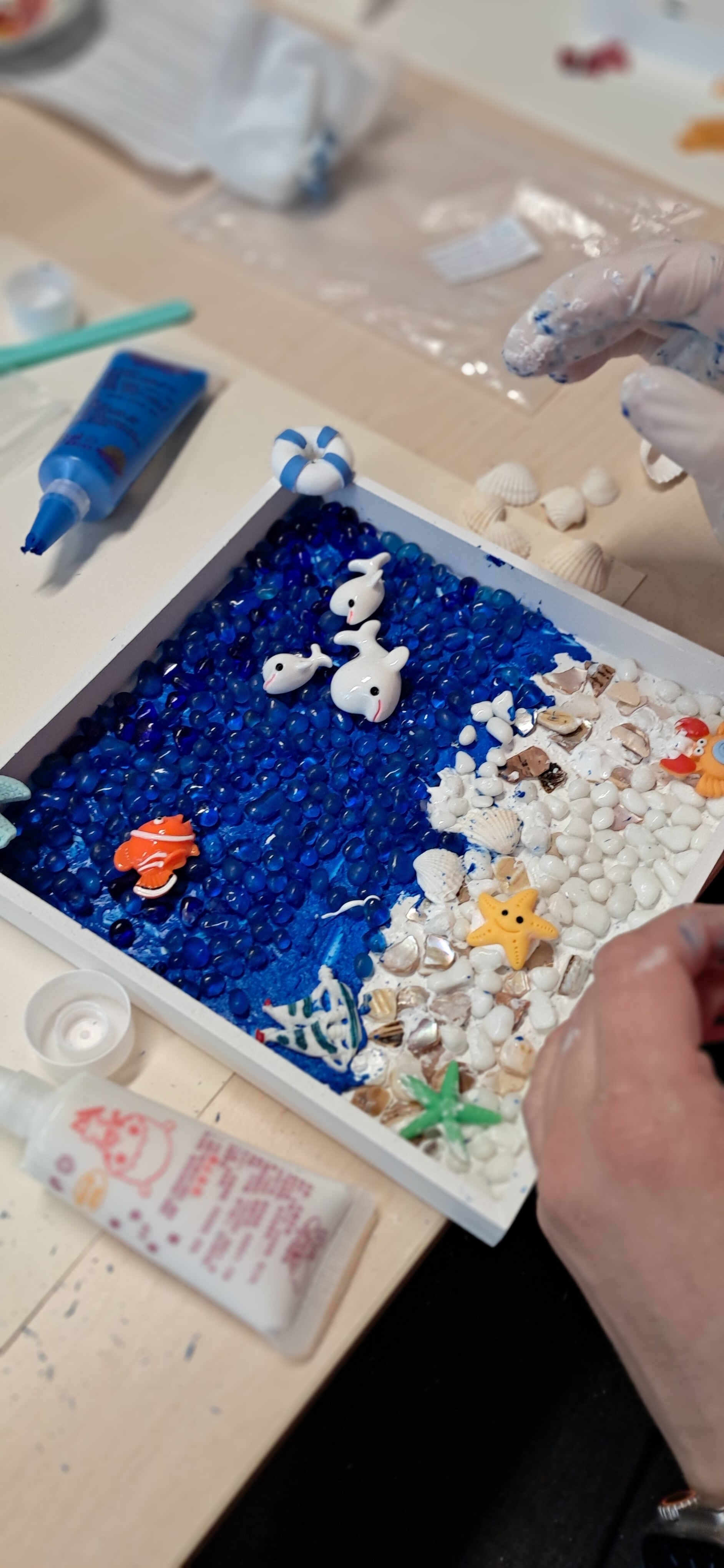 Zmiňovaná sada na moře obsahovala drobné střípky bílé a modré barvy. Bílou na písek, modrou na moře. A nesměly chybět rybky různých velikostí a barev, hvězdice, loďka a jiné mořské proprietky. Lepení moře bylo snadné. Dno krabice se pomazalo lepidlem a vysypalo barevným pískem. Rybky se nalepily, a výsledek vypadal fakt vkusně.