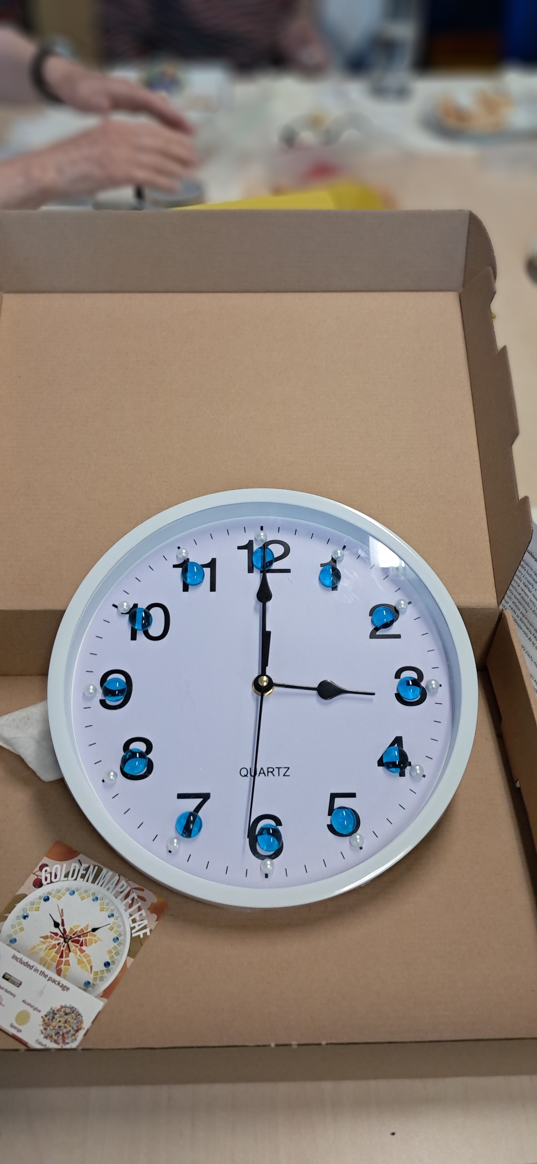 Hodiny měly kulatý tvar ciferníku s vyznačenými čísly a hezky hmatnými ručičkami. V krabici s hodinami byly ještě sáčky s korálky a lepidlem. U váziček byl navíc tmel. Dále každá sada obsahovala malou dřevěnou trojnožku, která poslouží jako stojánek, některé zase mističku a špachtli, právě na finální práci s tmelem. Ten po zpracování vypadá jako řídká kaše, která se špachtlí doslova napatlá na hotový výrobek, nechá zatvrdnout a pak z korálů a kamínků krásně setře houbičkou, která byla též součástí balení. Materiál zůstal jen ve spárách, kam patří a z lesklých a barevných povrchů šel krásně dolů.