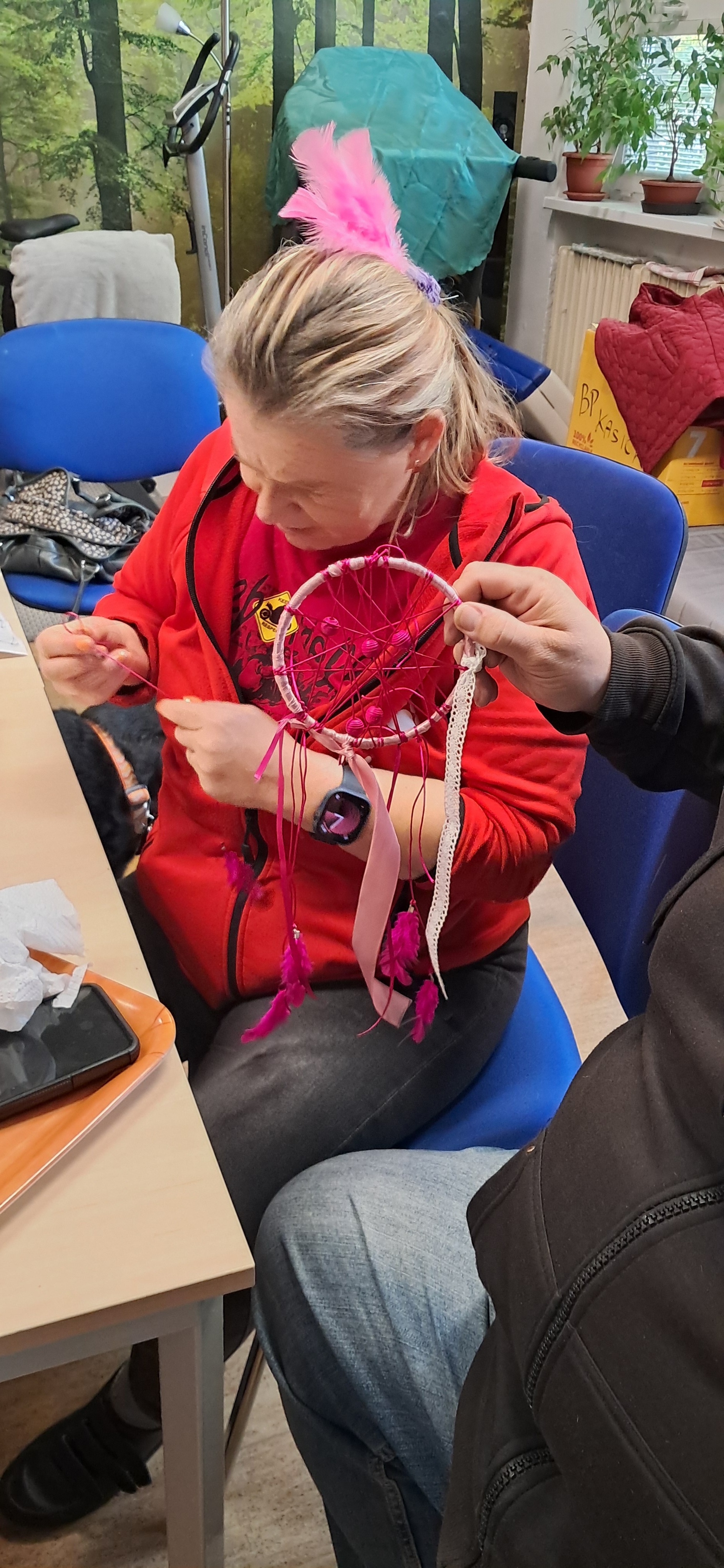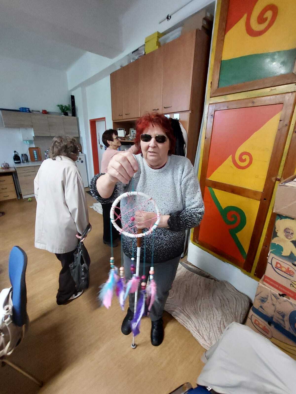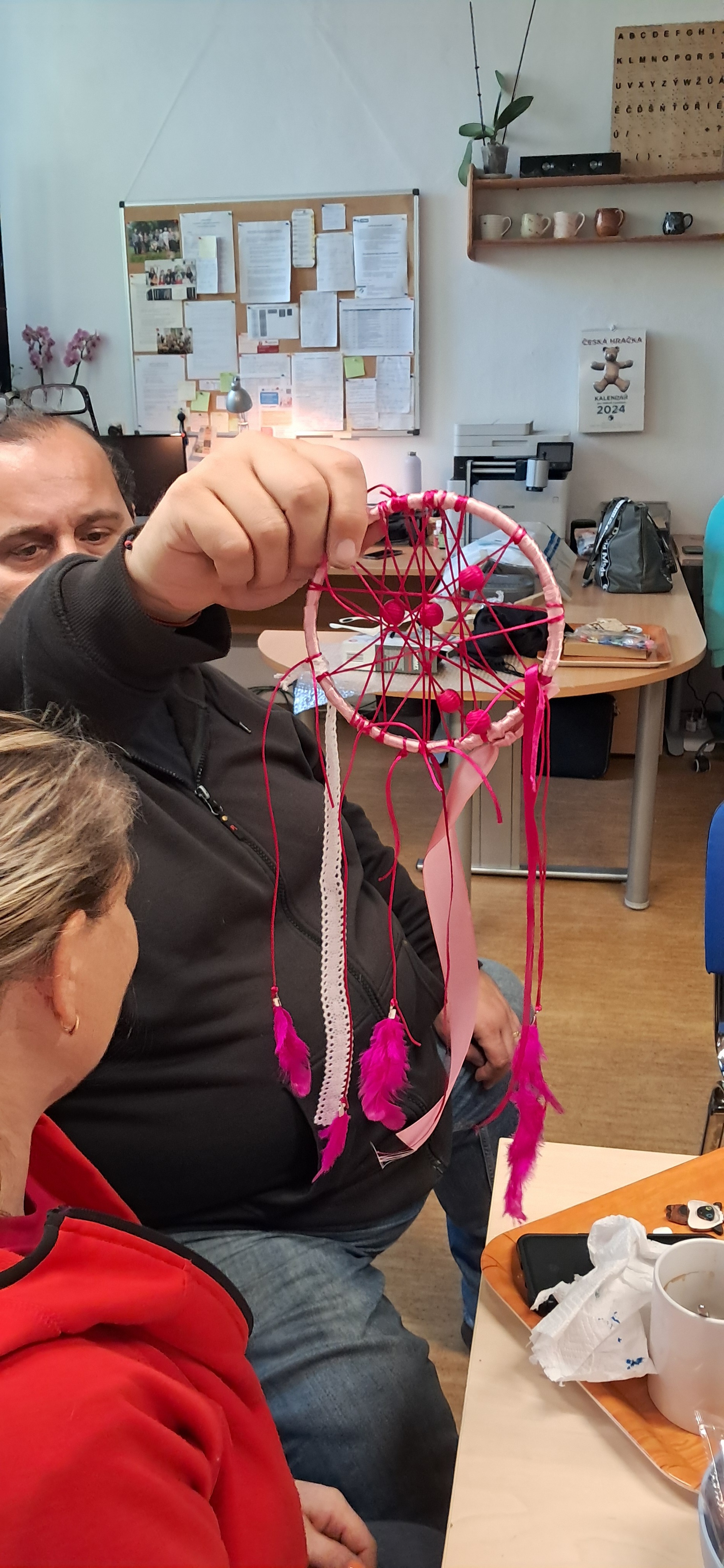 Měli jsme jednak nějaké již připravené sady na výrobu jednotlivých kousků, ale také spousty náhradního materiálu, jako sáčky peří, drátěné, nebo bambusové kruhy sloužící jako základ, hromady korálků a různých věcí na pověšení na lapač, imitaci krajky, provázky, řetízky, kroužky. A kdo chtěl, pověsil, co se mu líbilo. Výsledky byly originální a všichni věříme, že budou fungovat, jak mají. Lapnou všechny noční můry a nechají jenom sny pěkné.