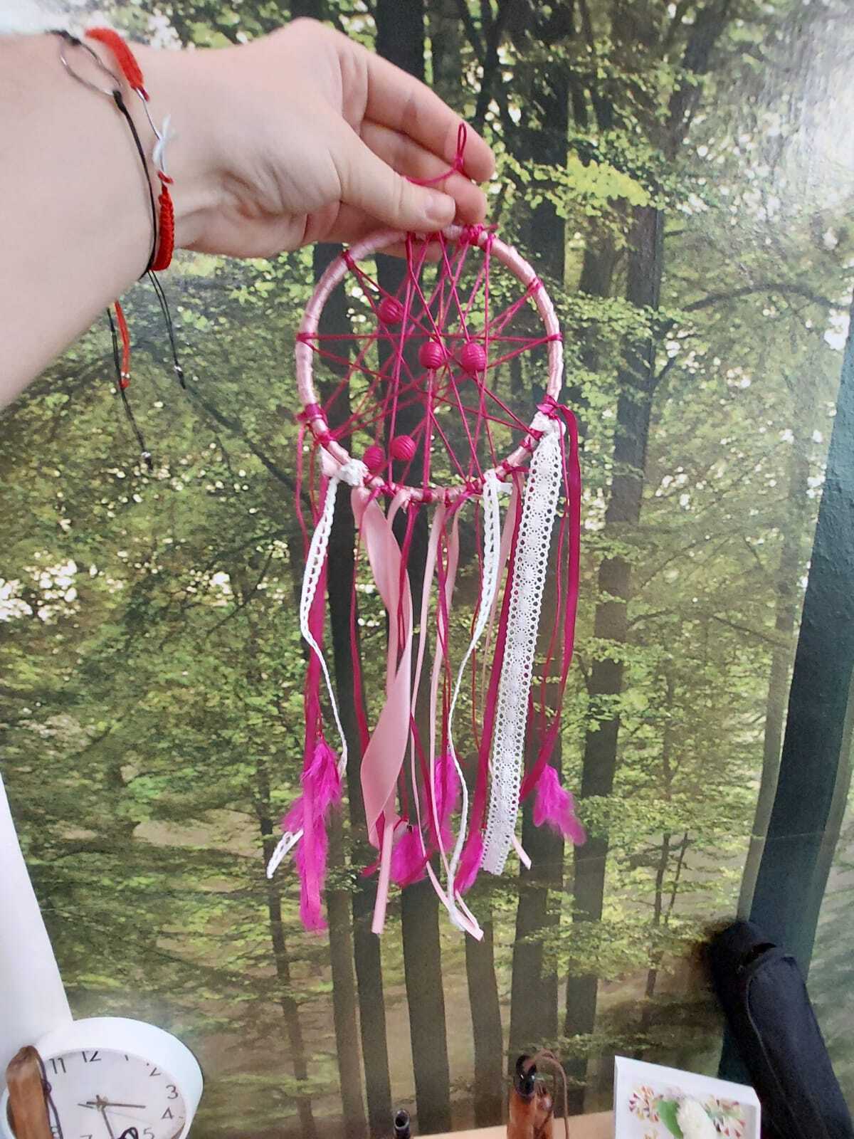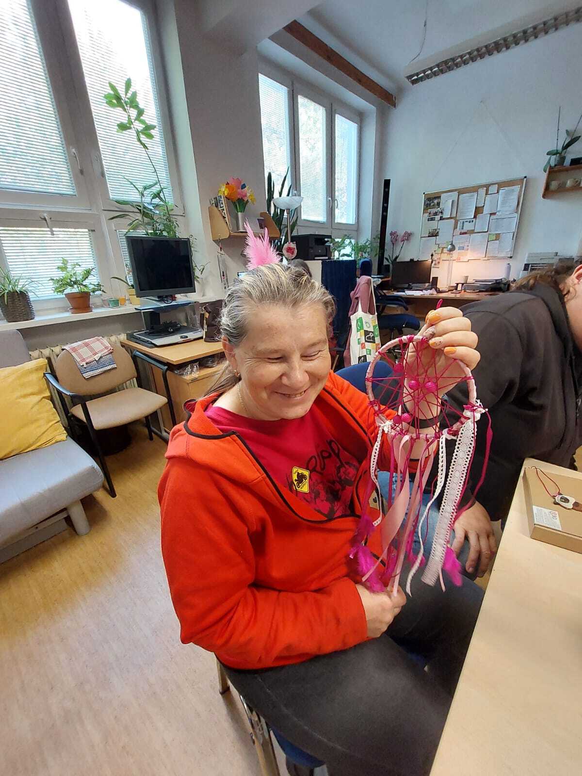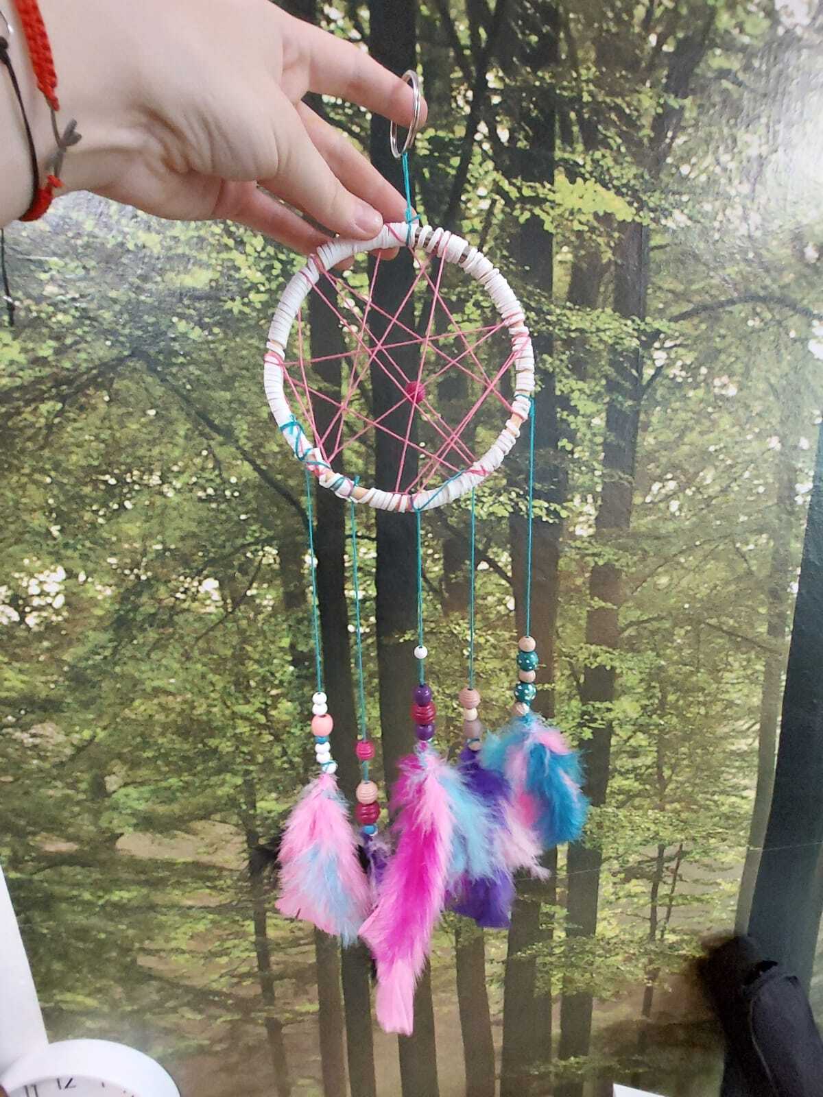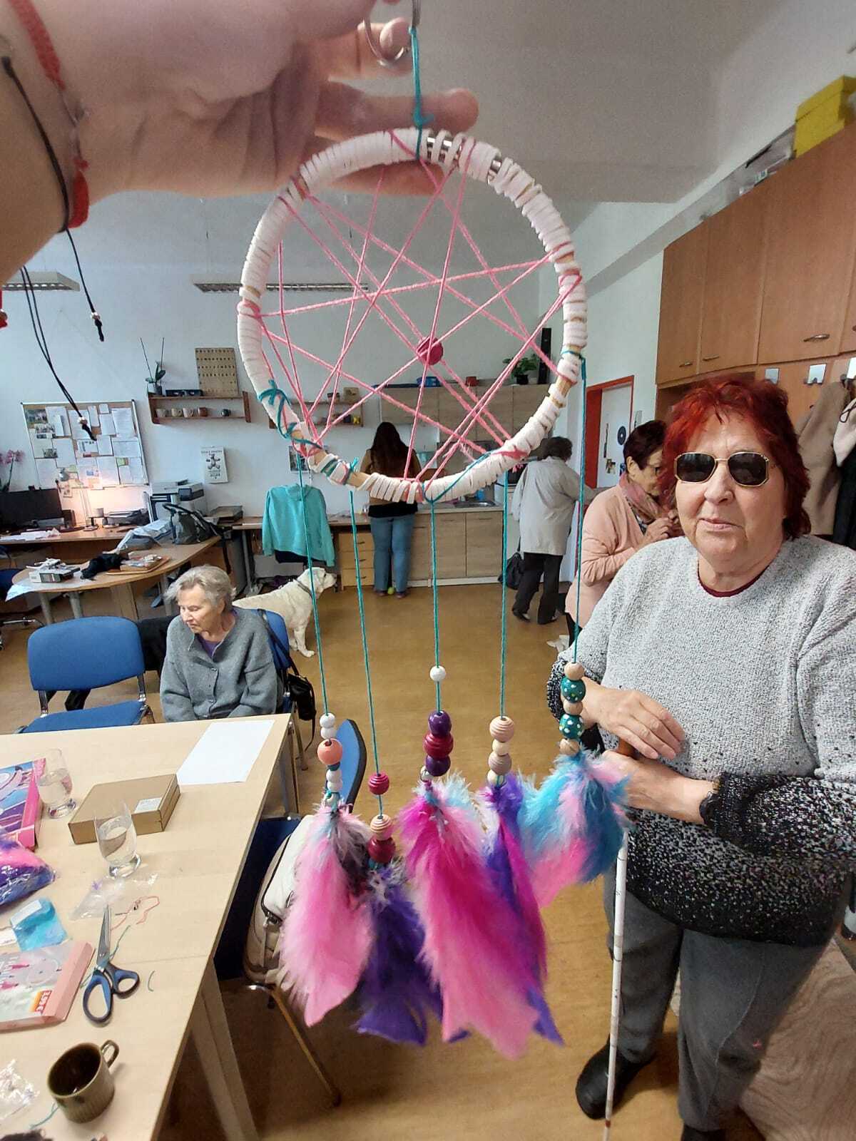 Měli jsme jednak nějaké již připravené sady na výrobu jednotlivých kousků, ale také spousty náhradního materiálu, jako sáčky peří, drátěné, nebo bambusové kruhy sloužící jako základ, hromady korálků a různých věcí na pověšení na lapač, imitaci krajky, provázky, řetízky, kroužky. A kdo chtěl, pověsil, co se mu líbilo. Výsledky byly originální a všichni věříme, že budou fungovat, jak mají. Lapnou všechny noční můry a nechají jenom sny pěkné.