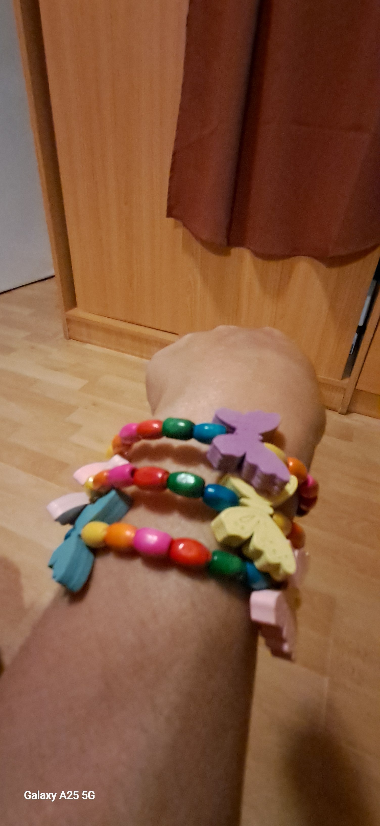 Už v minulosti jsme tuhle aktivitu jednou zkoušeli a měla úspěch. Tentokrát jsme ale přišli s lehkými obměnami. Pro starší prstíky nehmatné nitě, nebo tenké gumičky jsme tentokrát nahradili paměťovým drátem dvou velikostí. Korálky na ně lezou skoro samy. Výsledek je vhodný na všechny druhy tlapek. Záleží na tom, jak dlouhý drát chcete použít a jakou korálkovou kombinaci si vyberete. Vznikly dřevěné náramky pro silnější zápěstí i kreace se zvířátky na ručku dětskou.