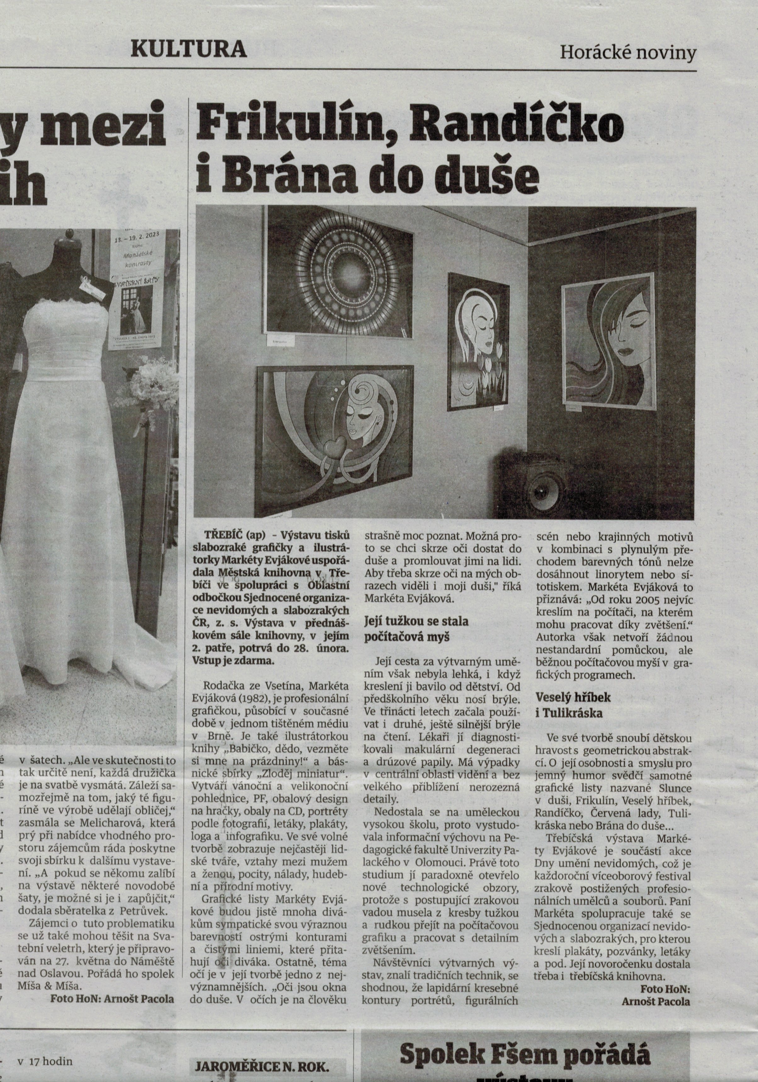 Horácké noviny otiskly dne 23. 2. 2023 článek o výstavě paní Markéty Evjákové v Městské knihovně v Třebíči s názvem Frikulín, Randíčko i Brána do duše, což jsou názvy některých obrazů autorky.