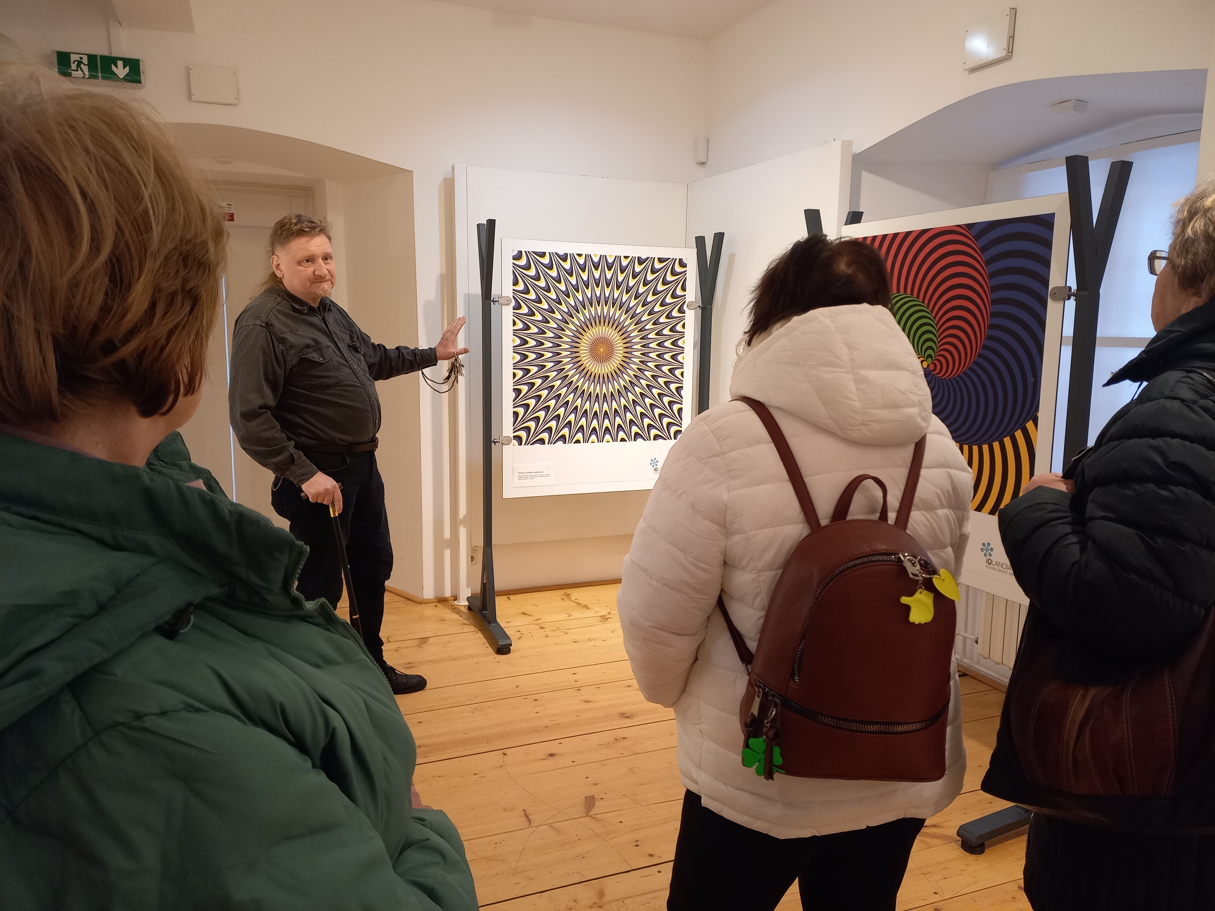 Náš pan průvodce stojící před obrazem s optickým klamem a vysvětluje, jak obrázek funguje a co na něm lidé bez zrakového problému vidí.