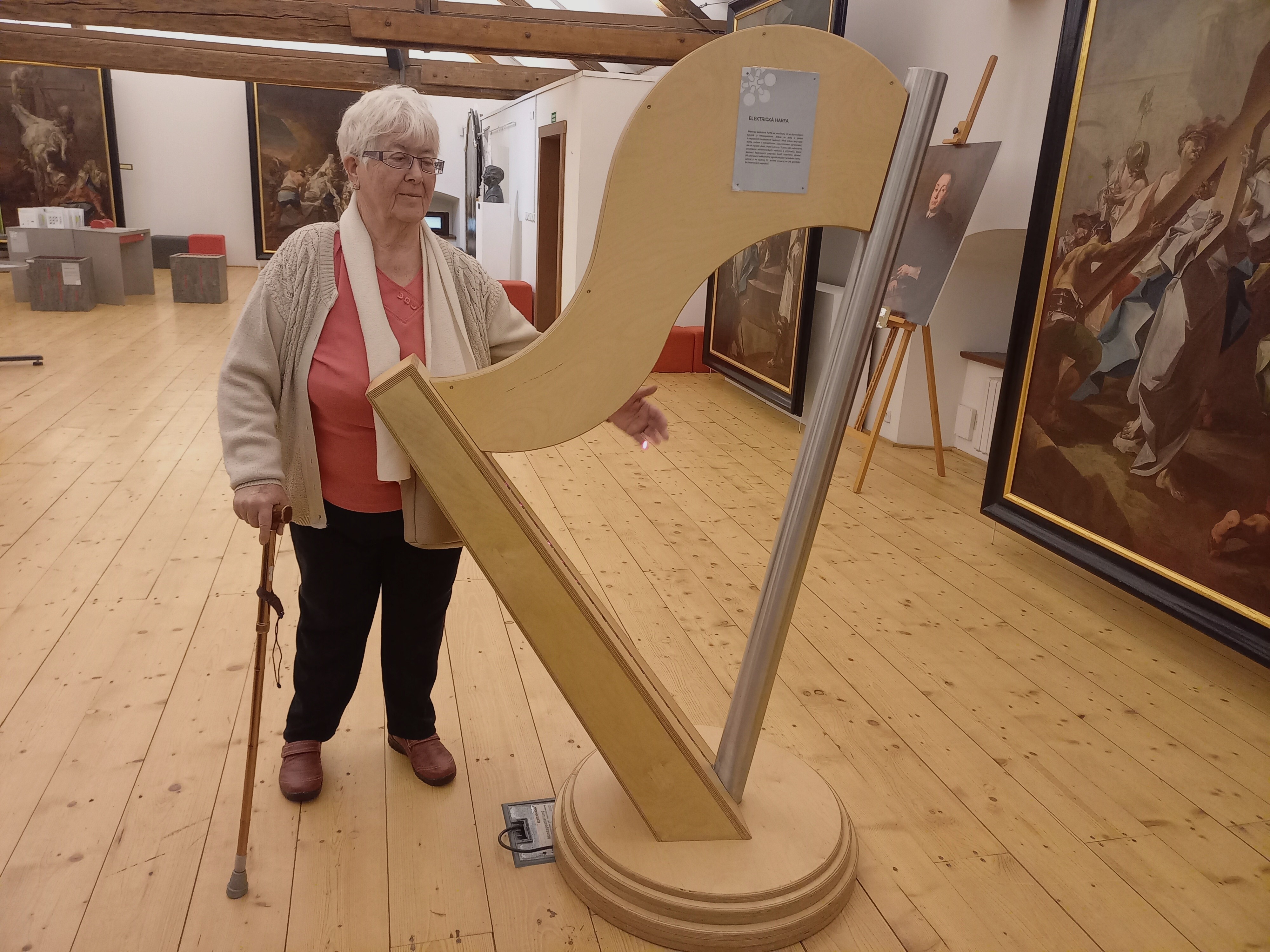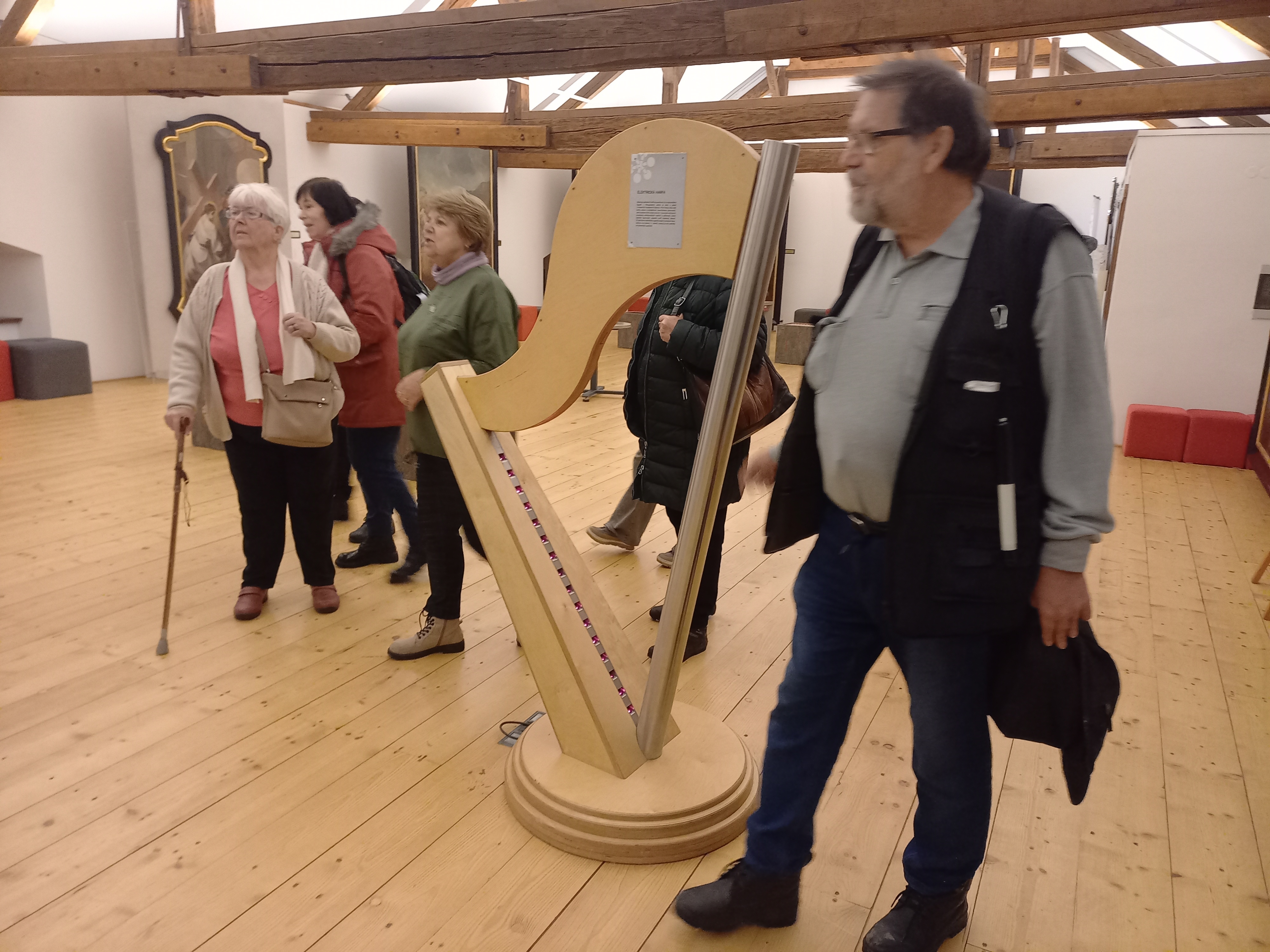Pan průvodce nám předvádí hru na harfu beze strun a vysvětluje její princip. My bedlivě nasloucháme.