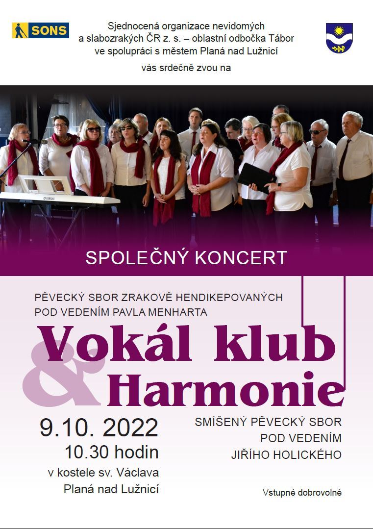 Sjednocená organizace nevidomých a slabozrakých ČR z. s. – oblastní odbočka Tábor ve spolupráci s městem Planá nad Lužnicí vás srdečně zvou na společný koncert sborů Vokál klub a Harmonie. Koncert se bude konat v kostele sv. Václava Planá nad Lužnicí dne 9.10.2022 v 10:30.