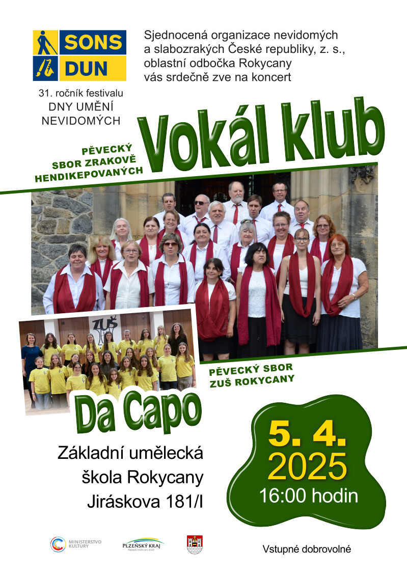 Sjednocená organizace nevidomých a slabozrakých České republiky, z.s., oblastní odbočka Rokycany vás zve v rámci 31. ročníku festivalu DNY UMĚNÍ NEVIDOMÝCH na koncert VOKÁL klub, pěvecký sbor zrakově hendikepovaných. Koncert proběhne v Základní umělecké škole Rokycany, Jiráskova 181/I dne 5.4.2025 od 16:00.