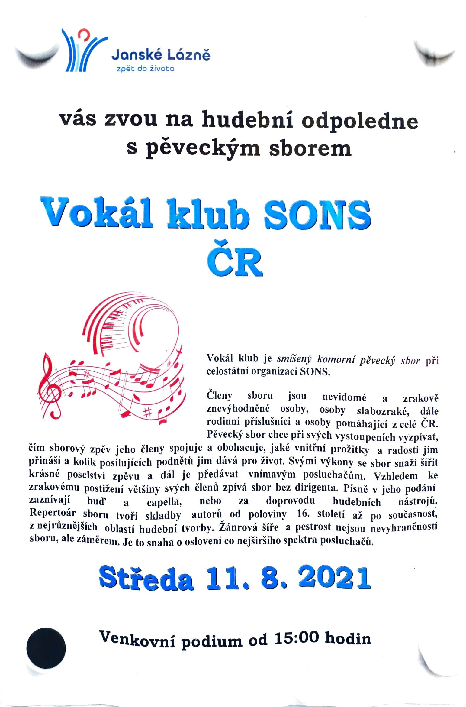 Vokál klub bude mít ve středu 11. 8. 2021 v 15:00 vystoupení na Kolonádě v Jánských Lázních. Na Kolonádě už jsme vystupovali několikrát. Pro ilustraci přikládáme foto z roku 2018.