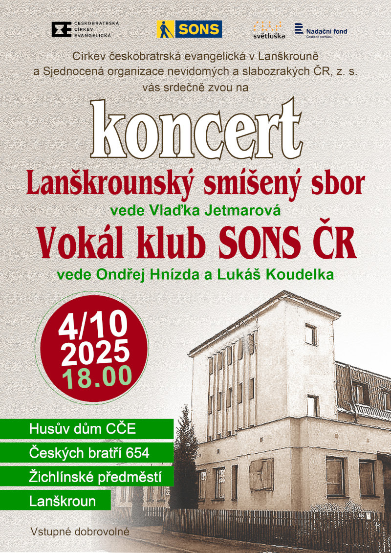 Církev českobratrská evangelická v Lanškrouně a Sjednocená organizace nevidomých a slabozrakých ČR, z. s. vás srdečně zvou na koncert Lanškrouského smíšeného sboru a Vokál klubu. Koncert se koná v Husově domě CČE, Českých bratří 654, Žichlínské předměstí, Lanškroun dne 4.10.2025 od 18 hodin.