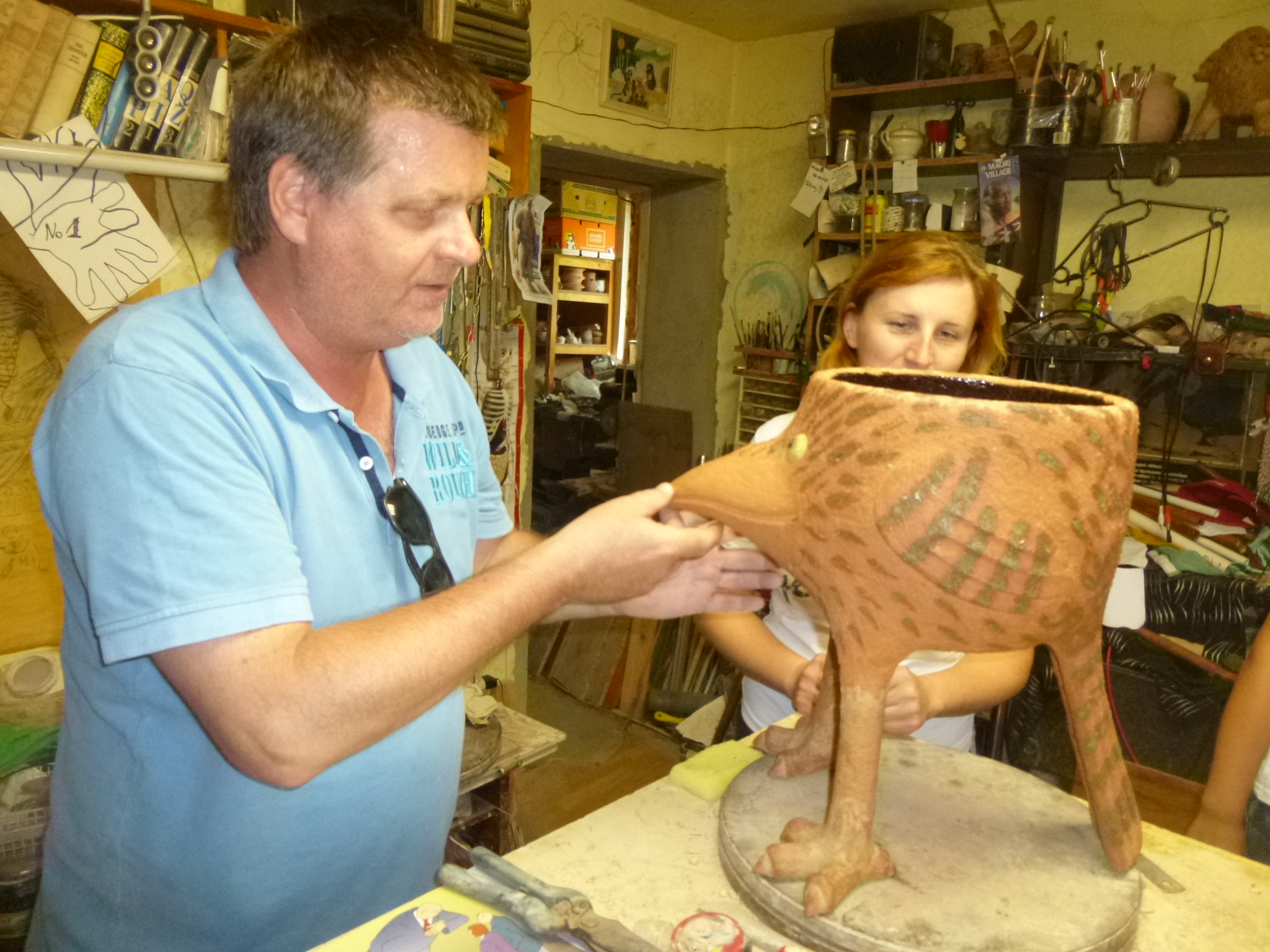 Poslední výtvarnou dílnu před létem jsme měli cestovní. Dvakrát měsíčně za námi jezdí naší dobrovolníci Monika a Michal, takže jsme se vydali na návštěvu my k nim. Monika pro nás připravila občerstvení, nechybělo ani grilované masíčko a Michal nás provedl svou keramickou dílnou. Po dvojicích jsme nakukovali a ošahávali jeho nové výtvory a někteří tak trochu čerpali inspiraci na svou další tvořivost.