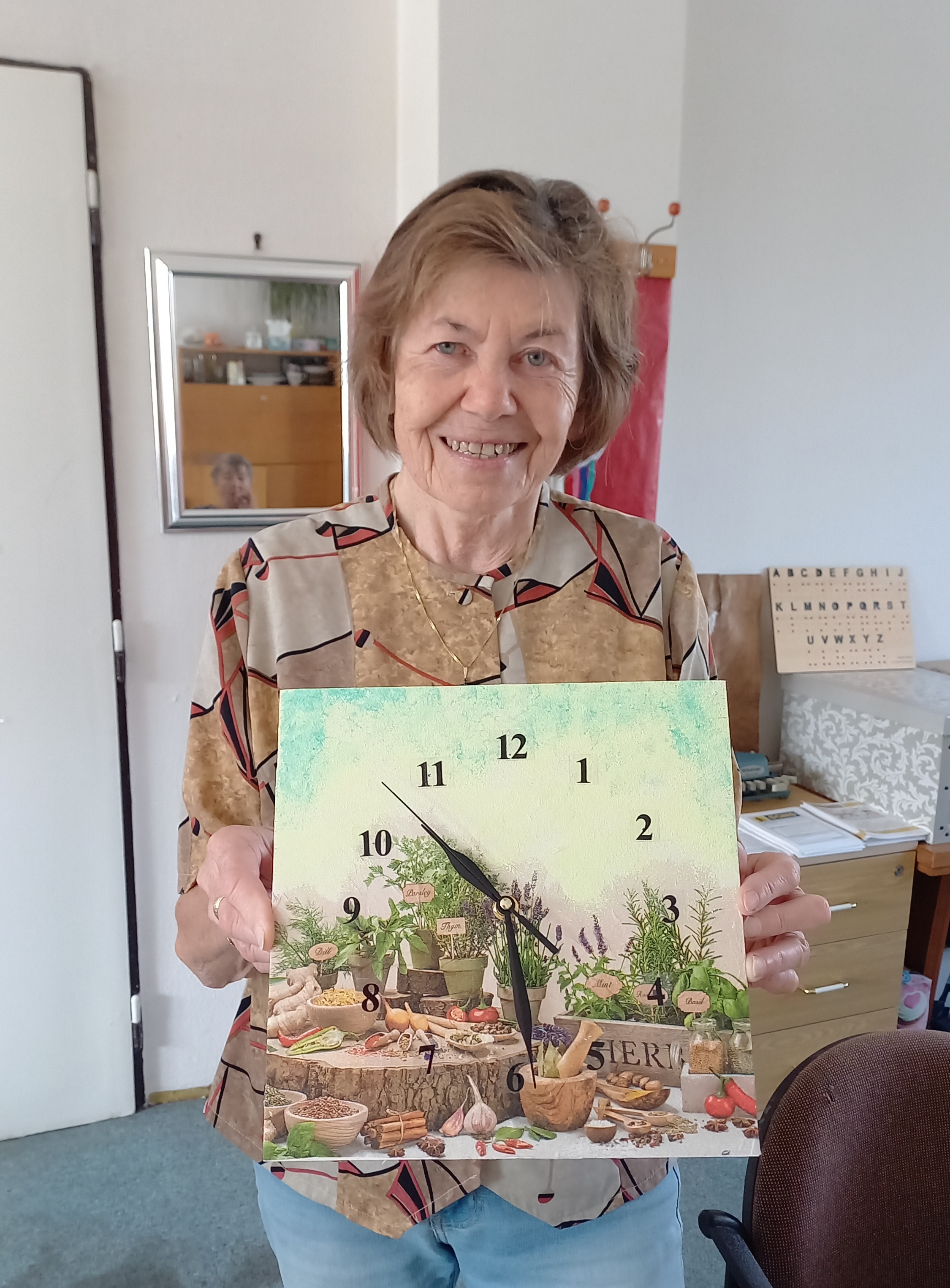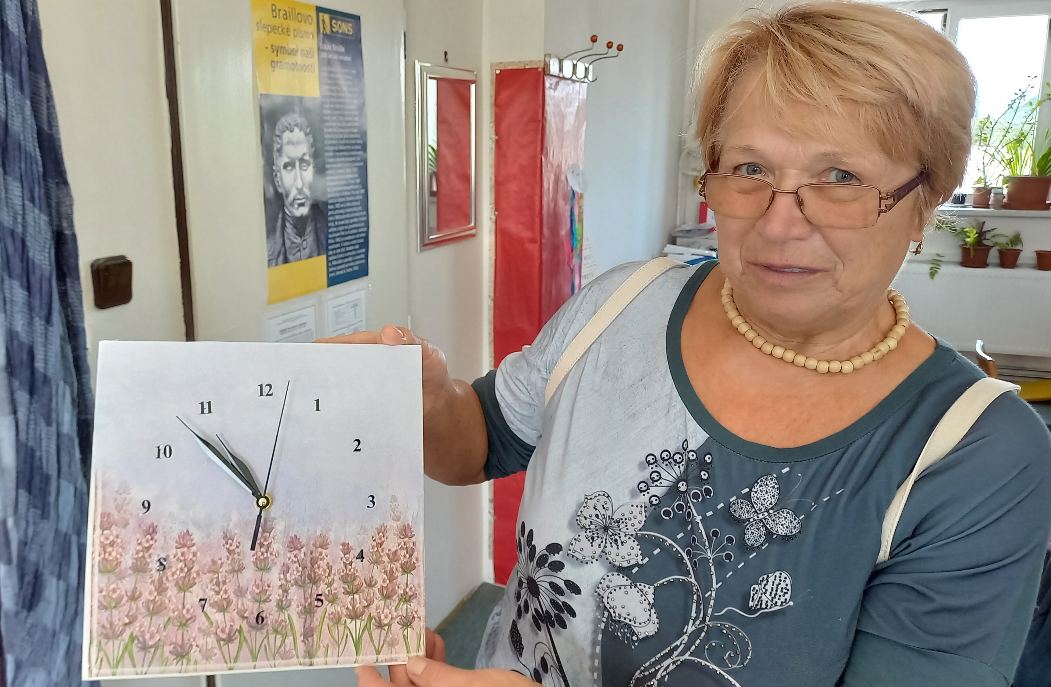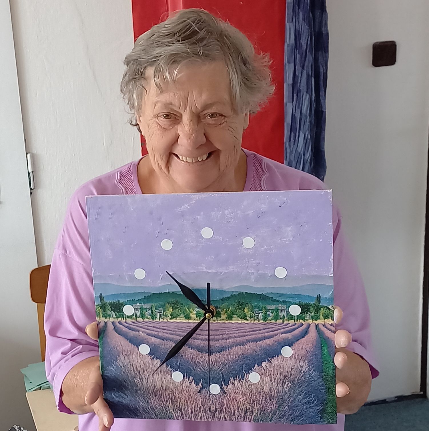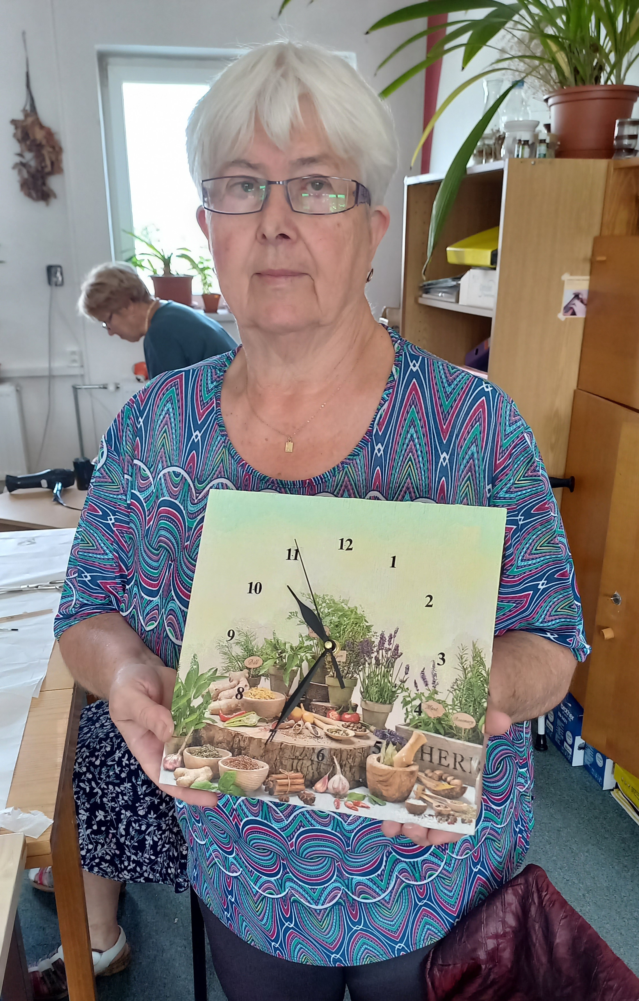 Na konci prázdnin nás čekaly další tvořivé dílny pod vedením paní Talábové a její pomocnice paní Jany. Tentokrát jsme vyráběli nástěnné hodiny. Přestože někteří z nás kvůli svému zrakovému handicapu hodiny sami nevyužijí, tak je vyráběli pro své blízké a měli radost, že potěší někoho vlastnoručním výrobkem. Nejprve jsme hodiny natírali základní barvou a poté je zdobili ubrouskovou technikou a domalovávali. Nakonec nám do hodin zabudoval hodinový strojek pan hodinář. Výsledná díla byla opravdu nádherná, aspoň my to tak vnímáme. A už se těšíme na další výtvarné dopoledne - v plánu je malování hedvábných šátků. Děkujeme moc paní Talábové a spol. za krásné výrobky, které si s ní dokážeme vyrobit.