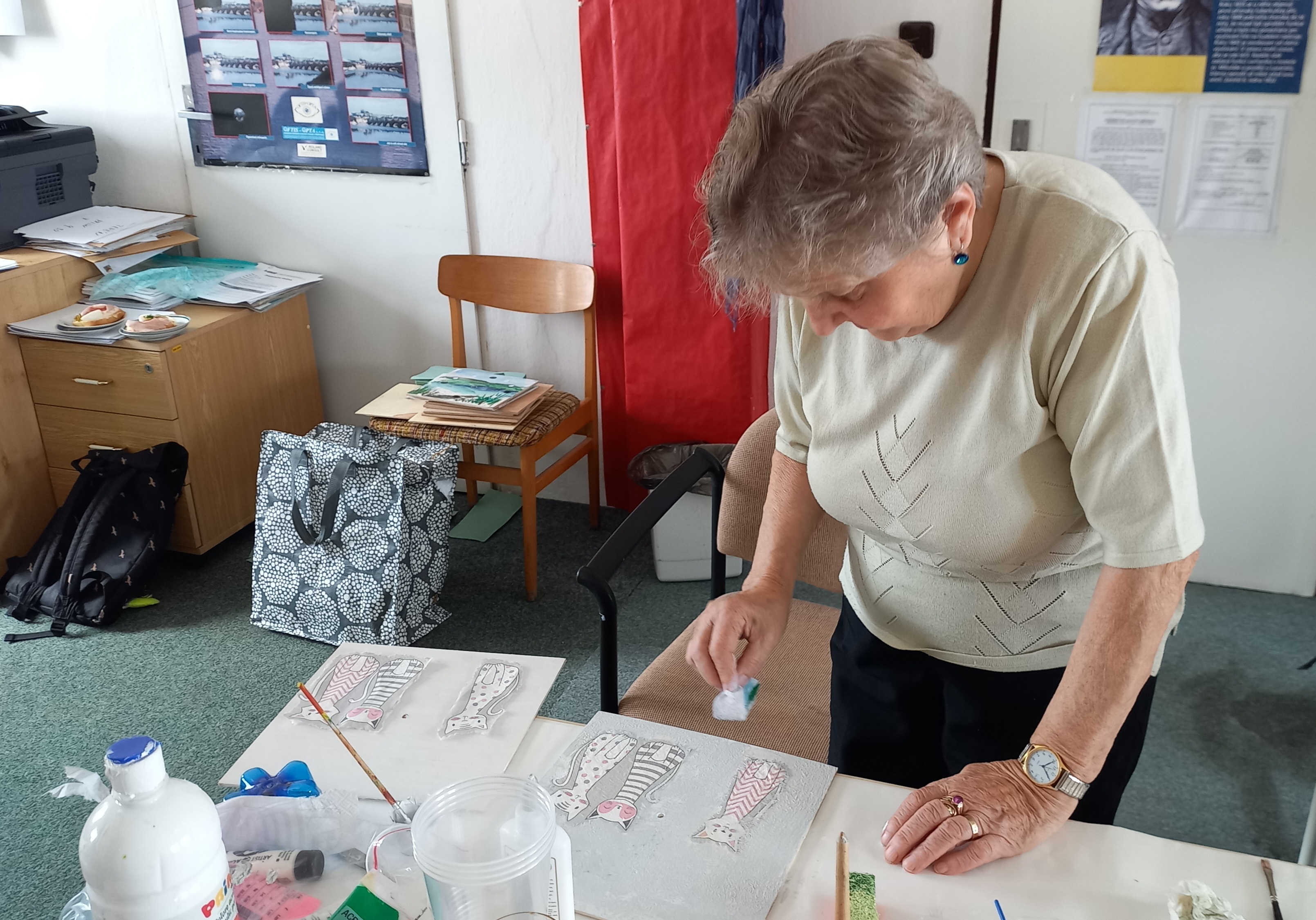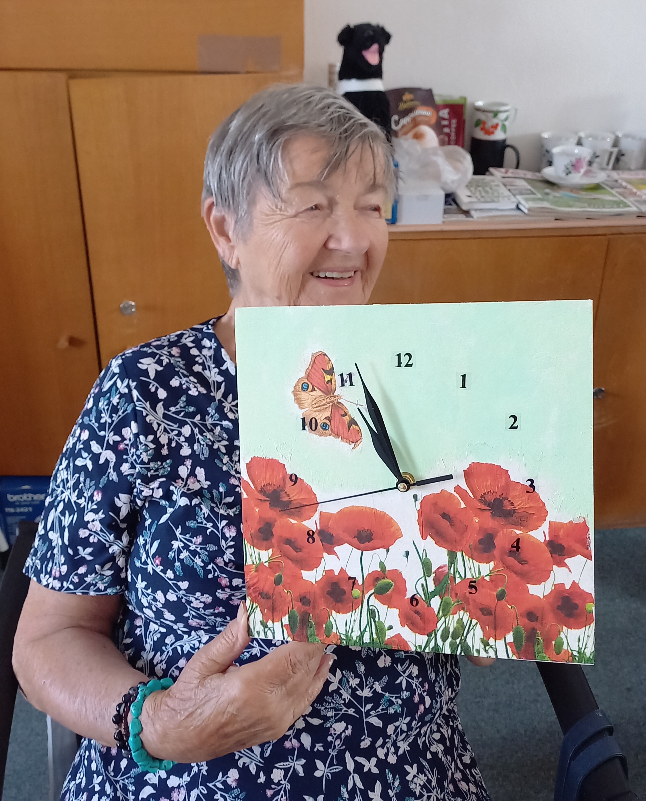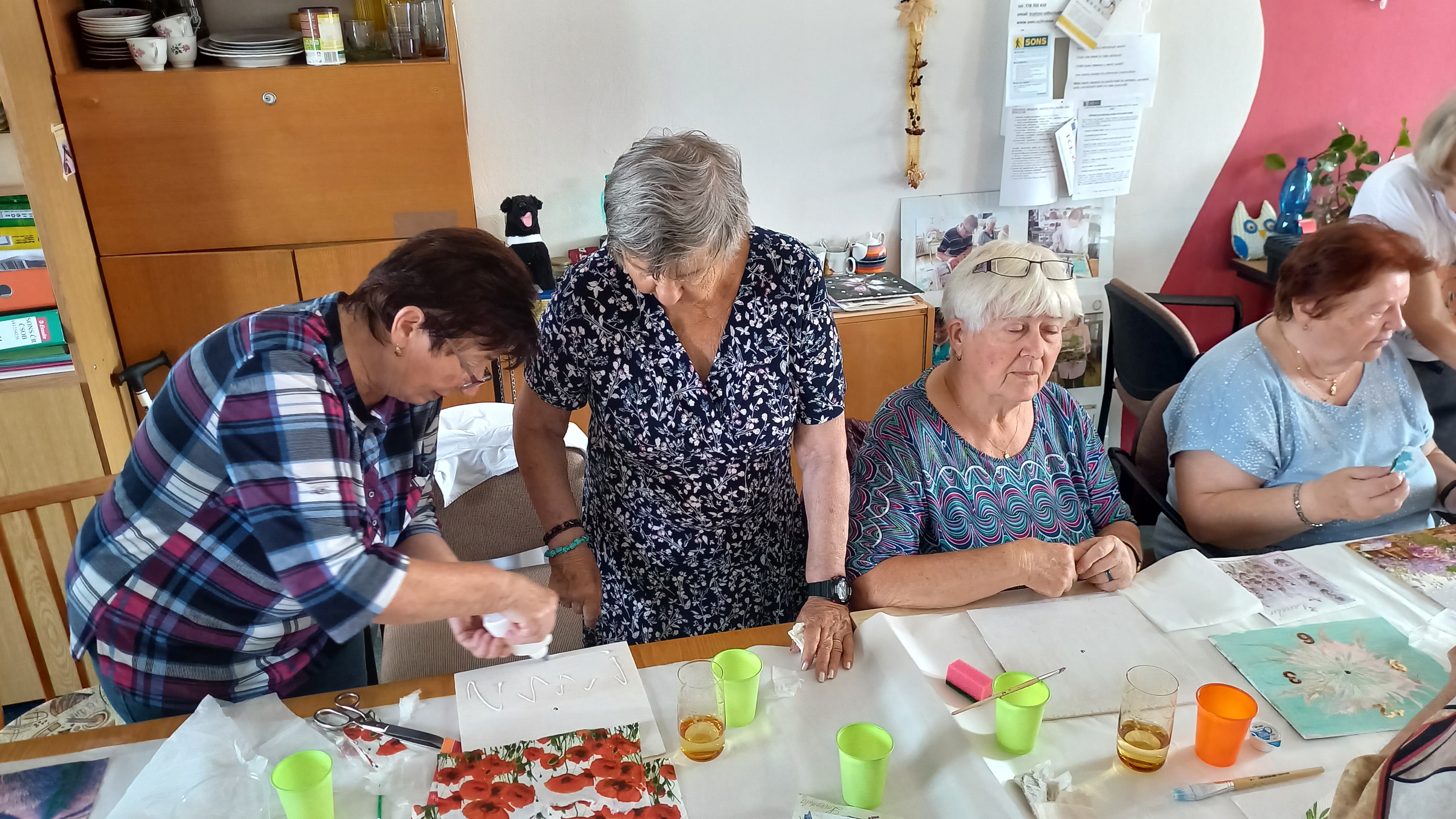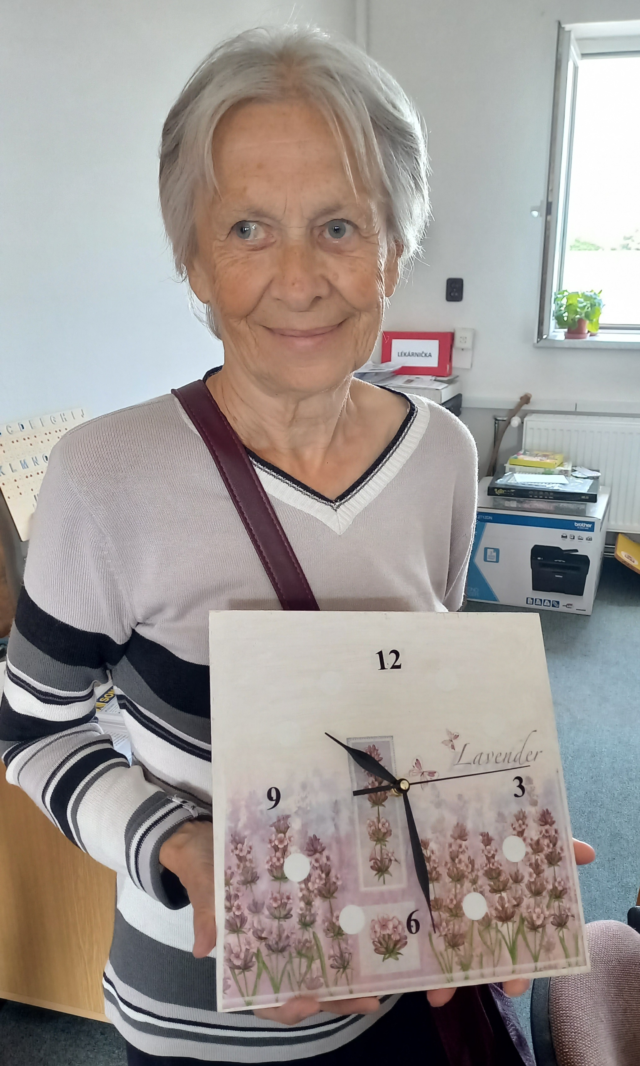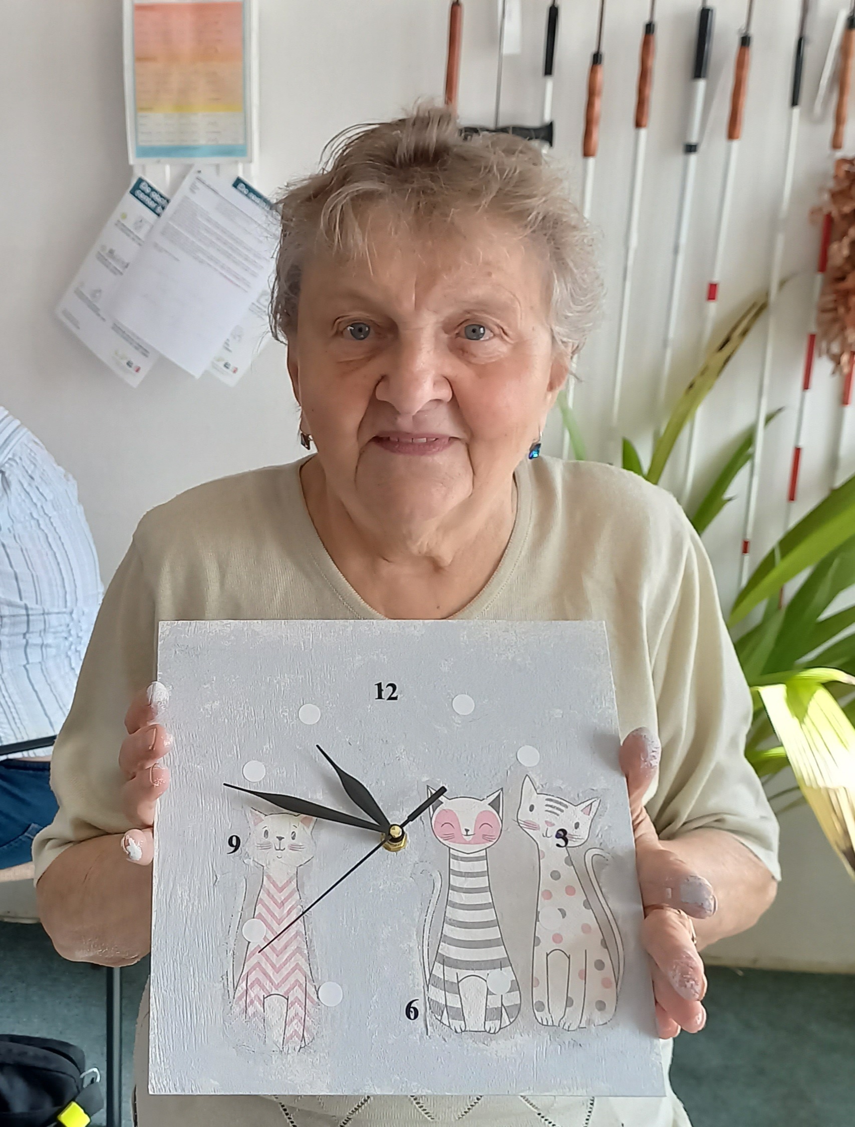Na konci prázdnin nás čekaly další tvořivé dílny pod vedením paní Talábové a její pomocnice paní Jany. Tentokrát jsme vyráběli nástěnné hodiny. Přestože někteří z nás kvůli svému zrakovému handicapu hodiny sami nevyužijí, tak je vyráběli pro své blízké a měli radost, že potěší někoho vlastnoručním výrobkem. Nejprve jsme hodiny natírali základní barvou a poté je zdobili ubrouskovou technikou a domalovávali. Nakonec nám do hodin zabudoval hodinový strojek pan hodinář. Výsledná díla byla opravdu nádherná, aspoň my to tak vnímáme. A už se těšíme na další výtvarné dopoledne - v plánu je malování hedvábných šátků. Děkujeme moc paní Talábové a spol. za krásné výrobky, které si s ní dokážeme vyrobit.