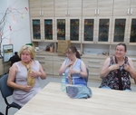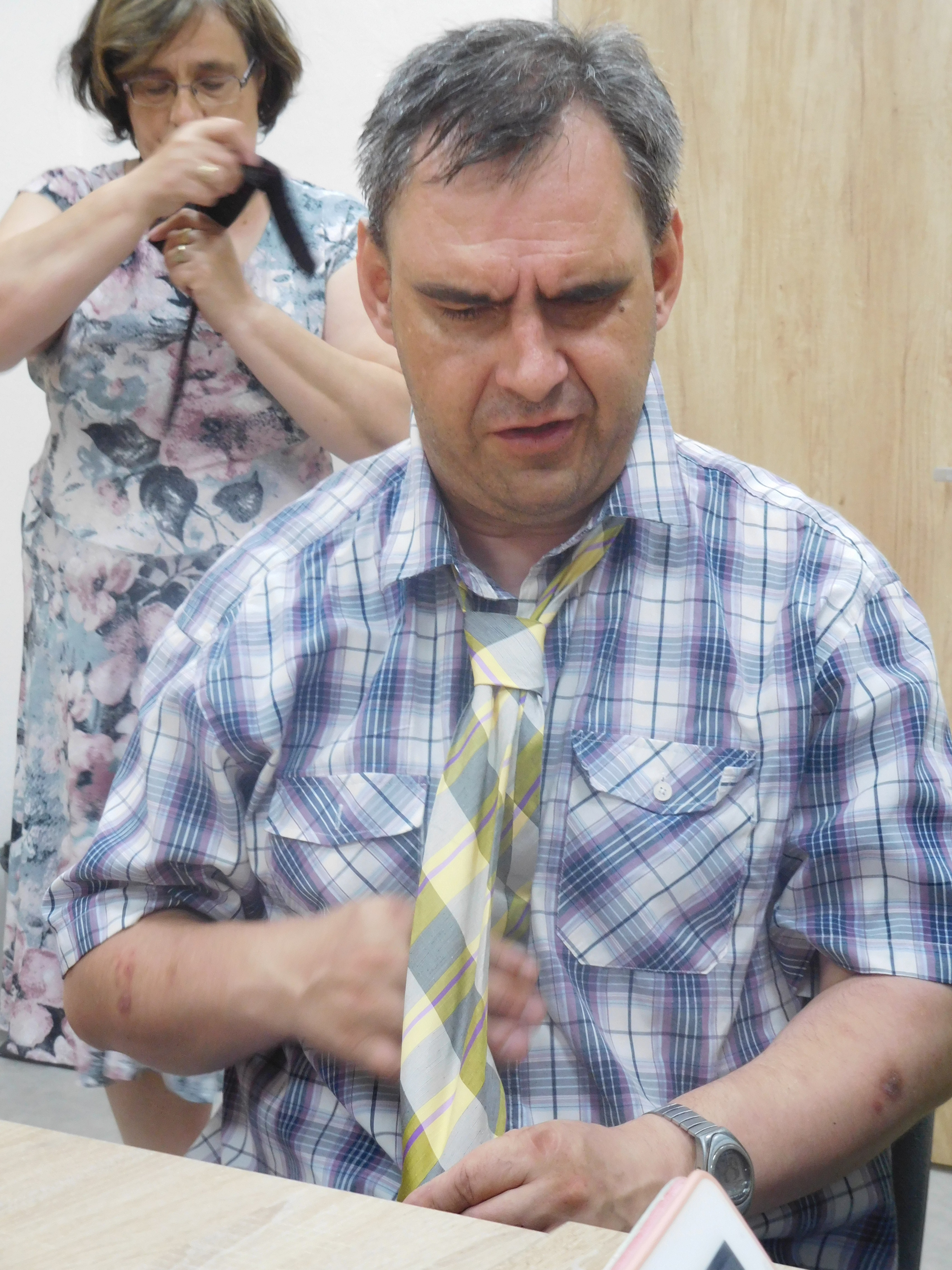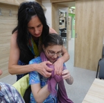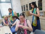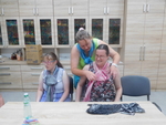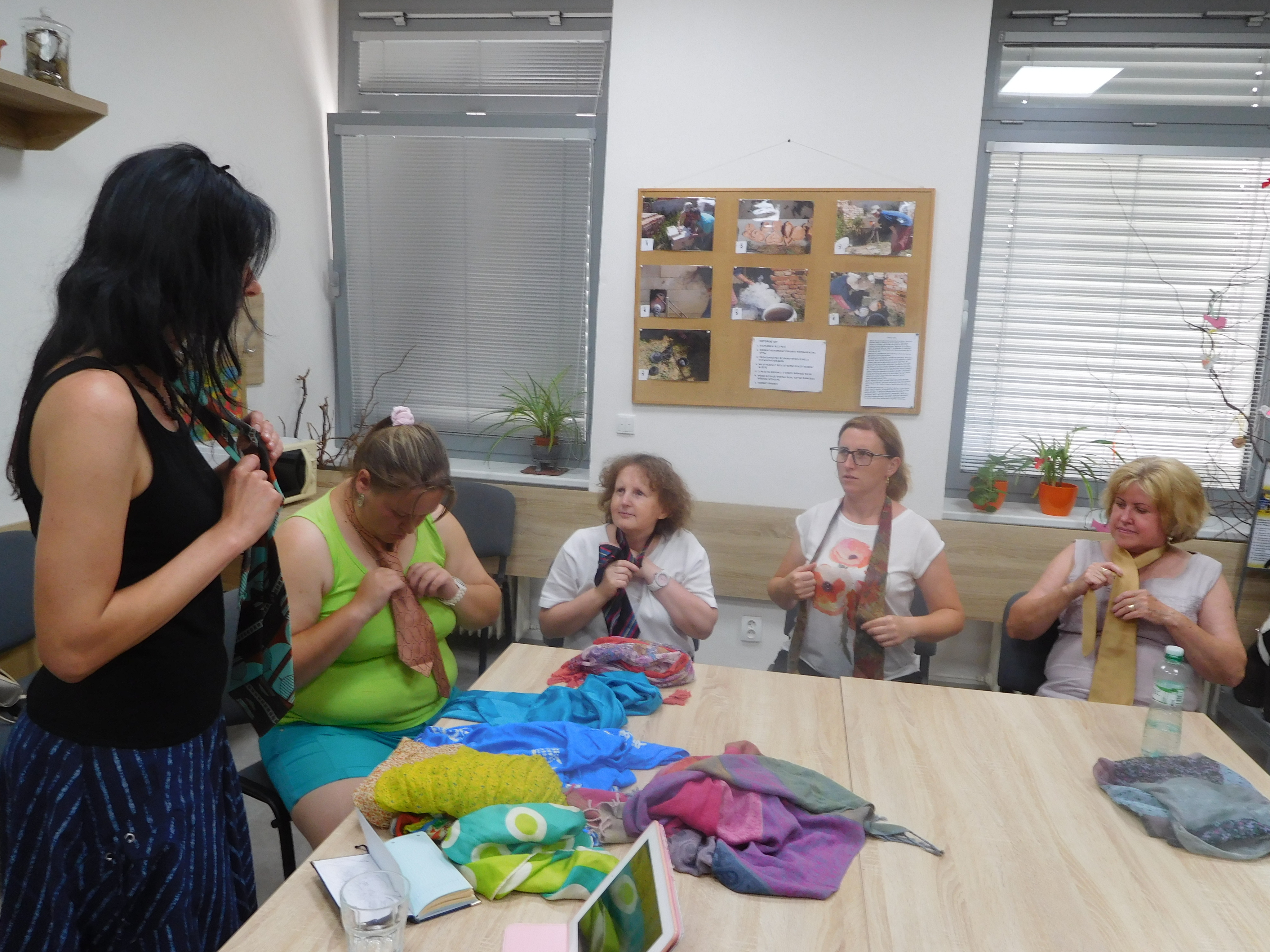 Mírné odlehčení od tvoření z hlíny, ale přece jenom u téma výtvarného jsme zůstali. Sice trochu z jiného ranečku, ale tvoření to bylo. Tvořili jsme sami na sobě, vytvářeli jsme různé dekorativní úvazy ze šálů, šátků, které se nám budou hodit jak v parném létu, tak v chladné zimě. A že byl mezi námi i jeden mužský, tak jsme svorně přešli i na kravaty a zjistili, že přece jenom to ti chlapi mají těžší, že není uzel jako uzel a pěkný uzel, to už je kumšt :-)
