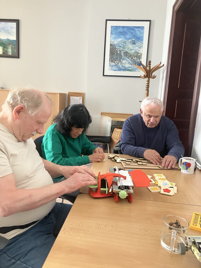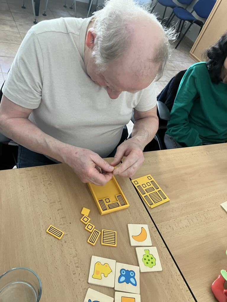 Opět jsme se sešli a cvičili jemnou motoriku, paměť a soustředění. Skládali jsme hlavolamy, hledali tvary a vkládali je do správných okének.