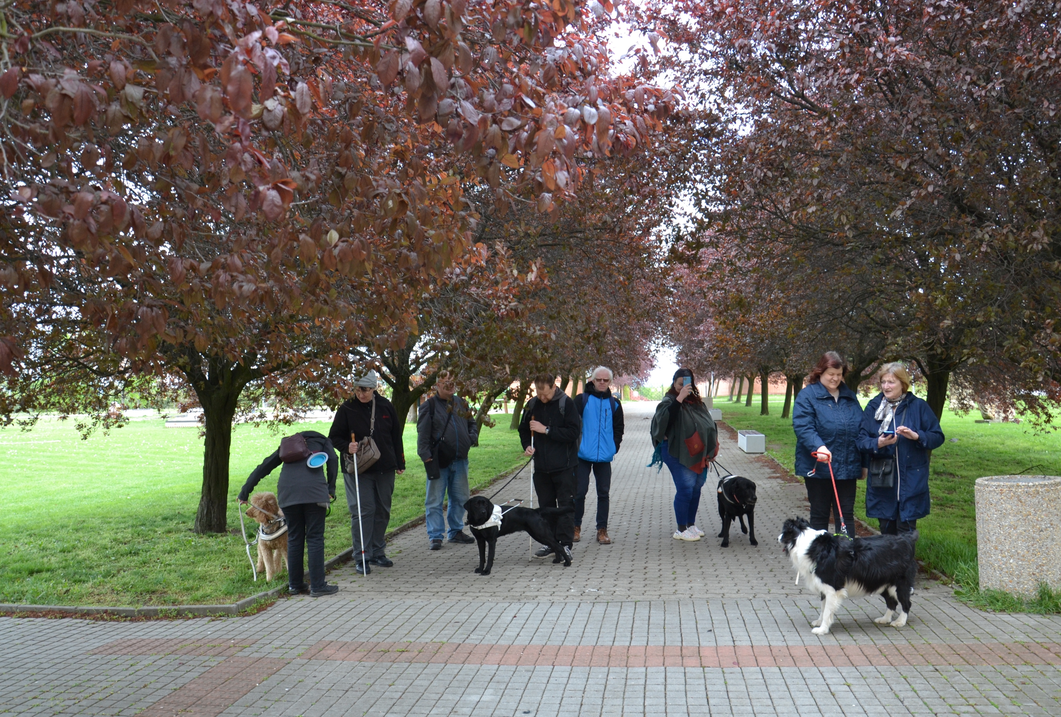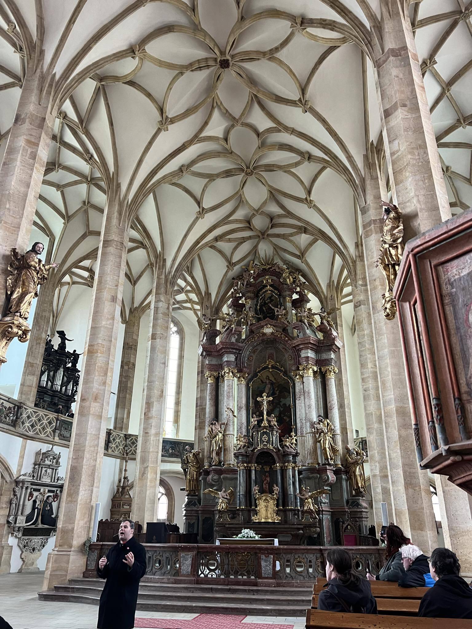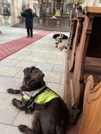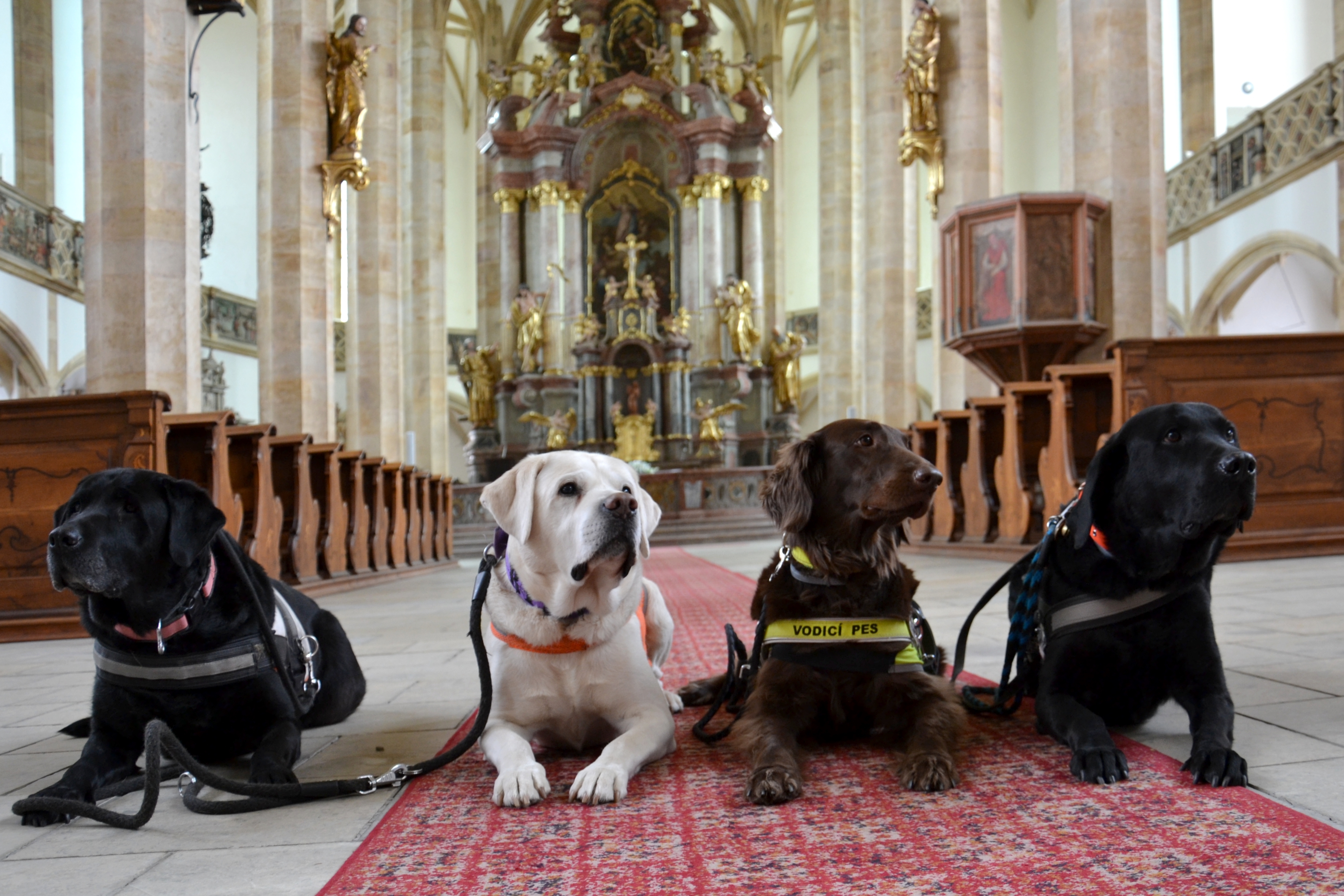 Naši psi při výkladu vzorně leželi, pak trpělivě čekali, než jsme si prohlédli i osahaly některé artefakty, připravené pro hmatovou prohlídku, statečně s námi vystoupali po vřetenovém schodišti na ochoz, kde mohli naši průvodci obdivovat úžasné vitráže, prohlédli jsme si i troje funkční varhany a jen jsme litovali, že s námi nebyl žádný hudebník, který by je uměl rozeznít.