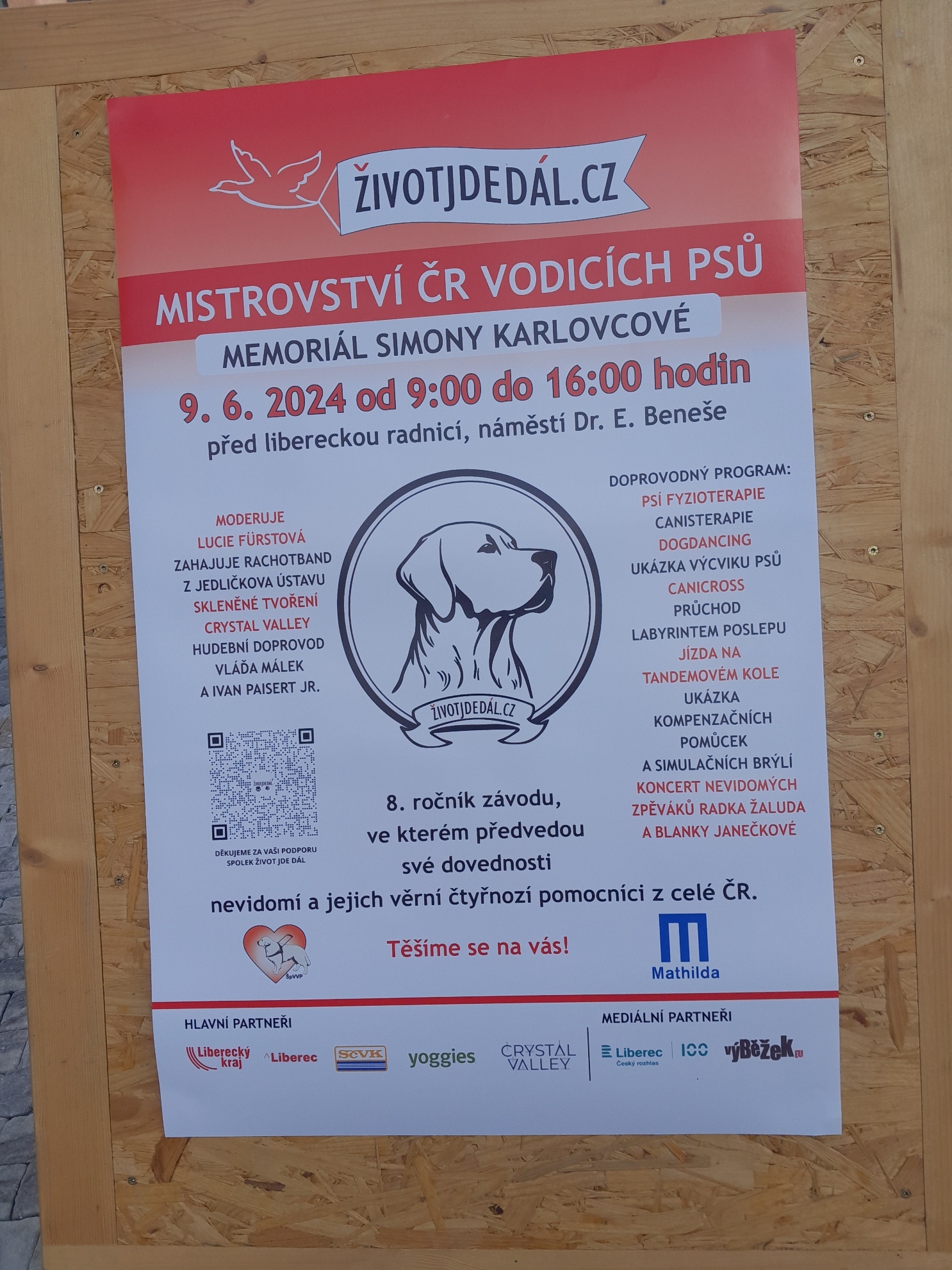 Dne 9. června 2024 se v Liberci uskutečnilo Mistrovství České republiky vodících psů - Memoriál Simony Karlovcové. Byl to již 8. ročník závodu, který pořádal spolek Život jde dál. Své schopnosti si poměřili nevidomí a jejich čtyřnozí pomocníci přímo v ulicích města. Závod zahájilo hudební těleso Rachotband z Jedličkova ústavu Liberec. Program během závodu byl velmi pestrý - jízda na tandemovém kole, průchod labyrintem po slepu, ukázka kompenzačních pomůcek, ukázka bílé hole a simulačních brýlí aj. Novinkou letos byla ukázka výcviku policejních psů a nechyběla pojízdná psí restaurace. Závodu se zúčastnil také náš předseda liberecké odbočky SONS pan J. Pikeš se svým psem Rafem a další dva členové se svými vodicími psy. Na akci využila naše liberecká odbočka SONS možnosti prezentace různých kompenzačních pomůcek pro zrakově postižené a nevidomé. Předveden byl také Pichtův psací stroj, kde si zájemci mohli vyzkoušet psaní v Braillově písmu. Zájemci z řad veřejnosti mohli využít také masáž šíje, kterou zde prováděl velmi zkušený nevidomý masér - člen naší liberecké odbočky SONS.